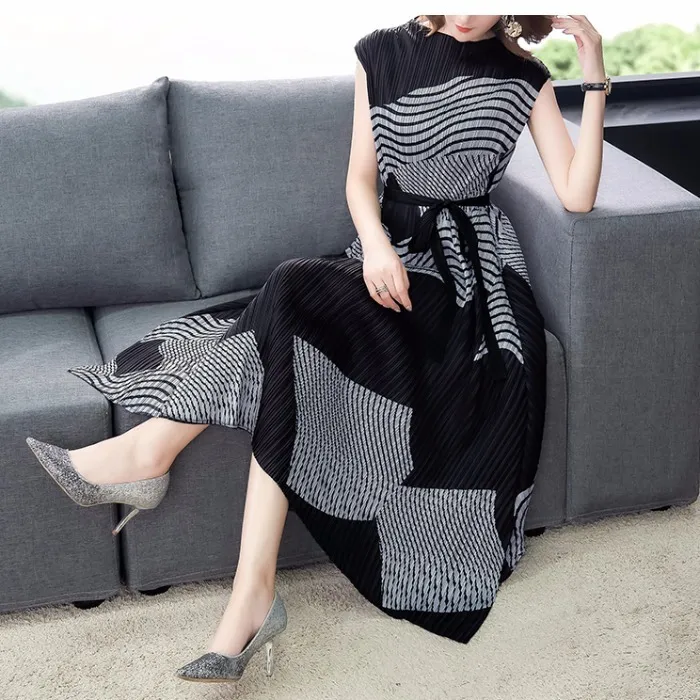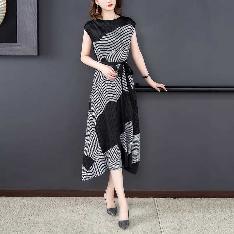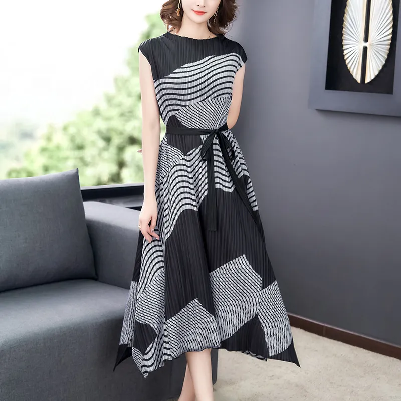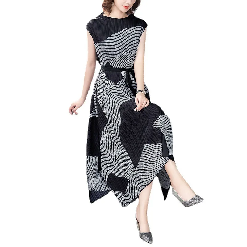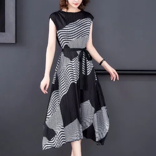 衣都精品- 2023新款氣質印花不規則無袖褶皺連衣裙