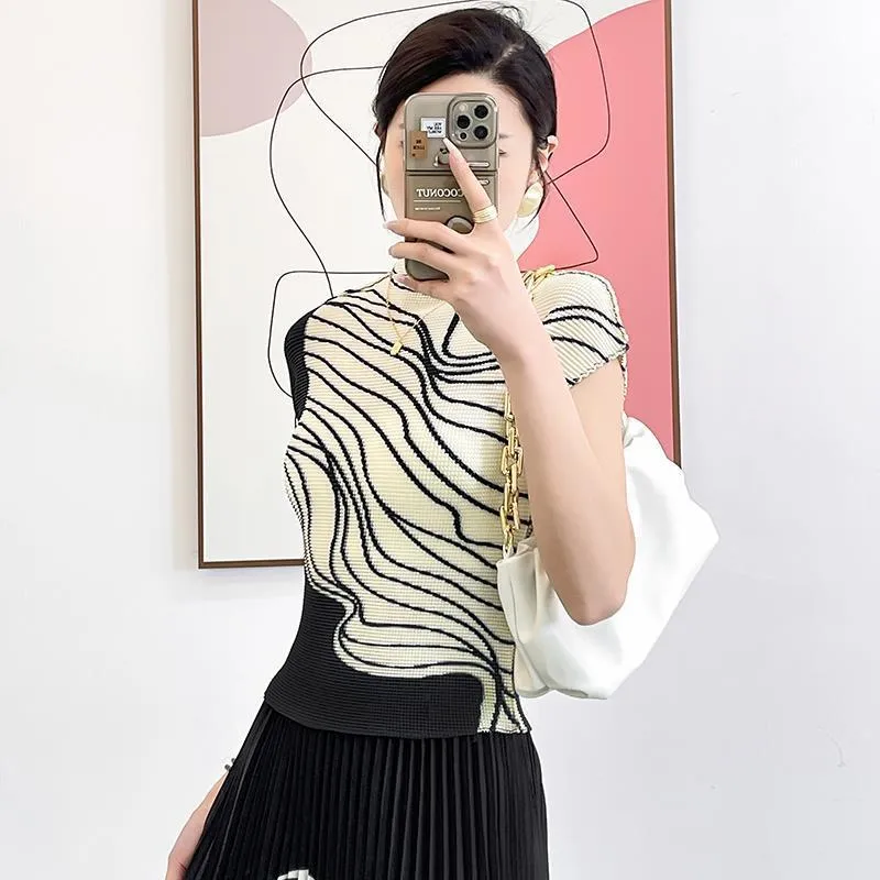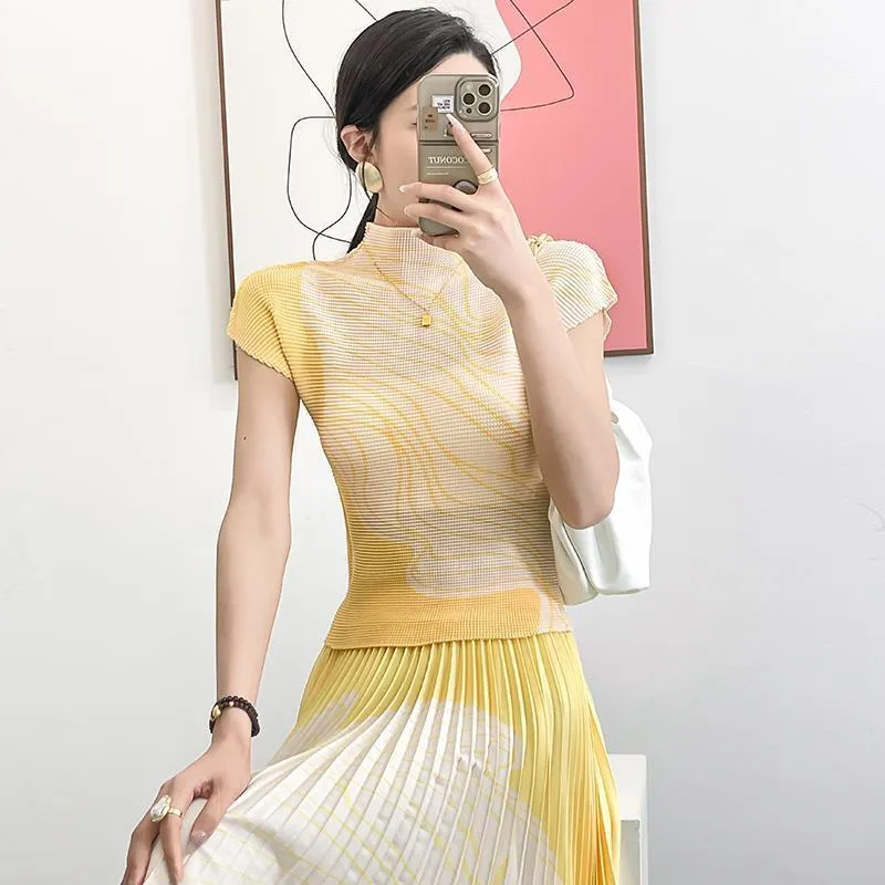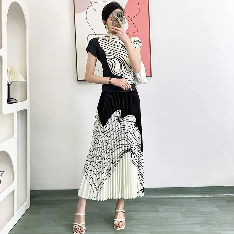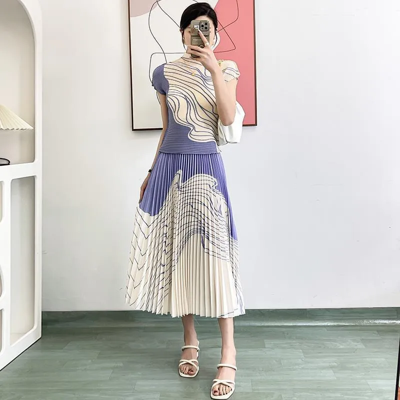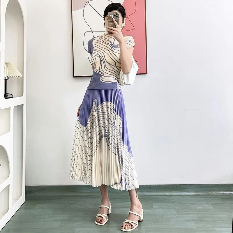 衣都精品- 2023新款時尚修身上衣+印花百褶半身裙二件套套裝