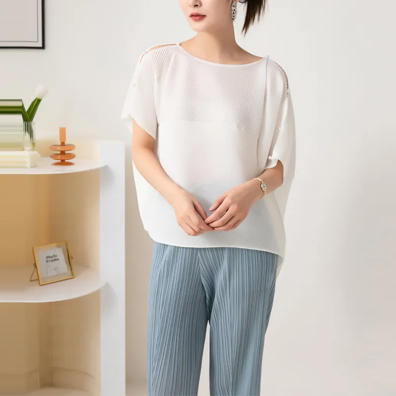 衣都精品- 2023新款時尚純色拼接釘珠寬鬆褶皺上衣