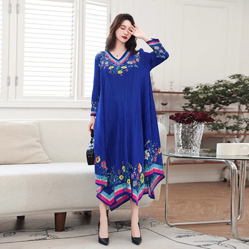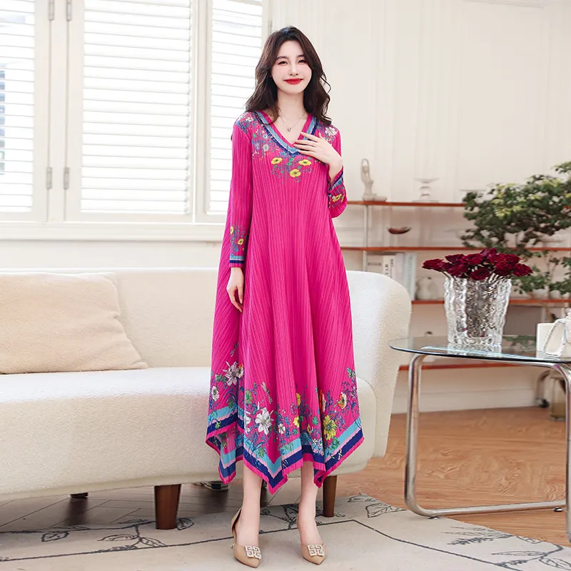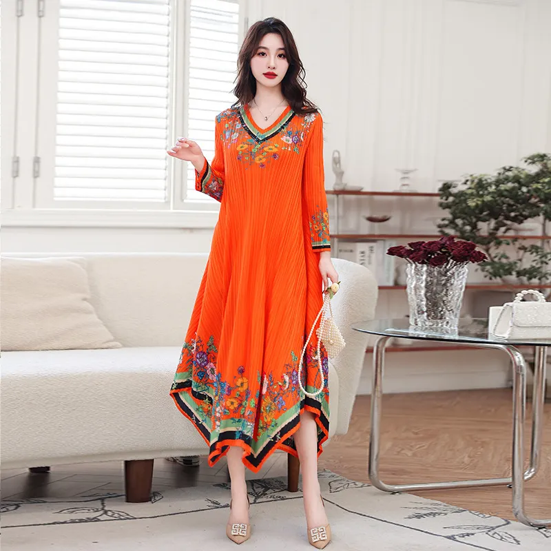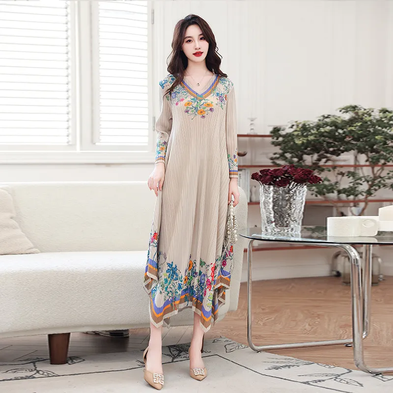 衣都精品- 2023新款時尚氣質寬鬆褶皺印花連衣裙