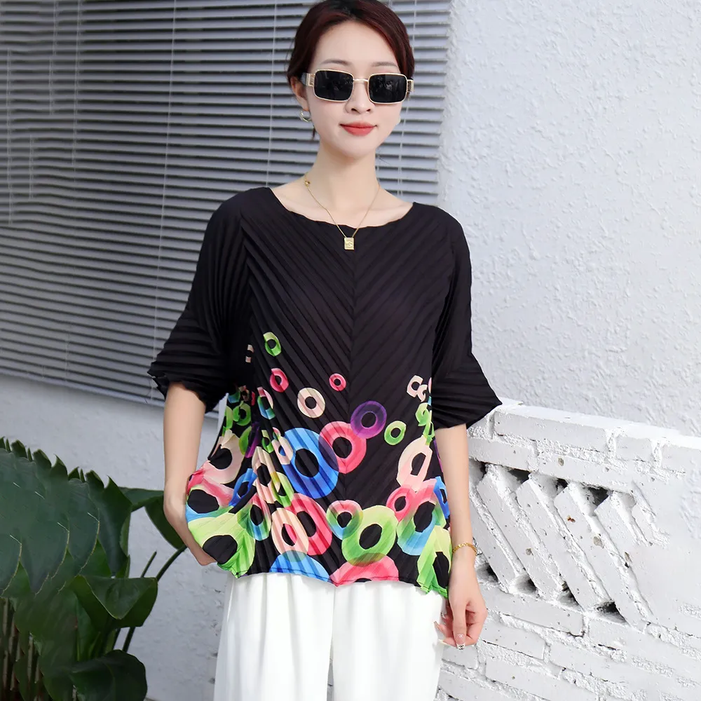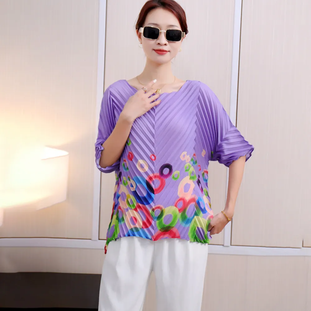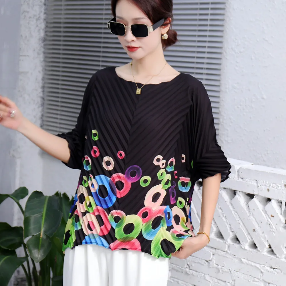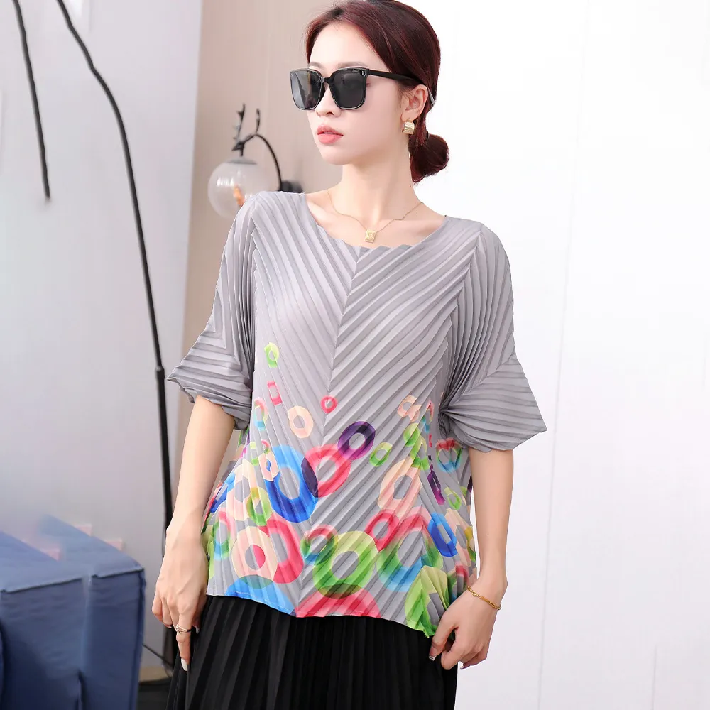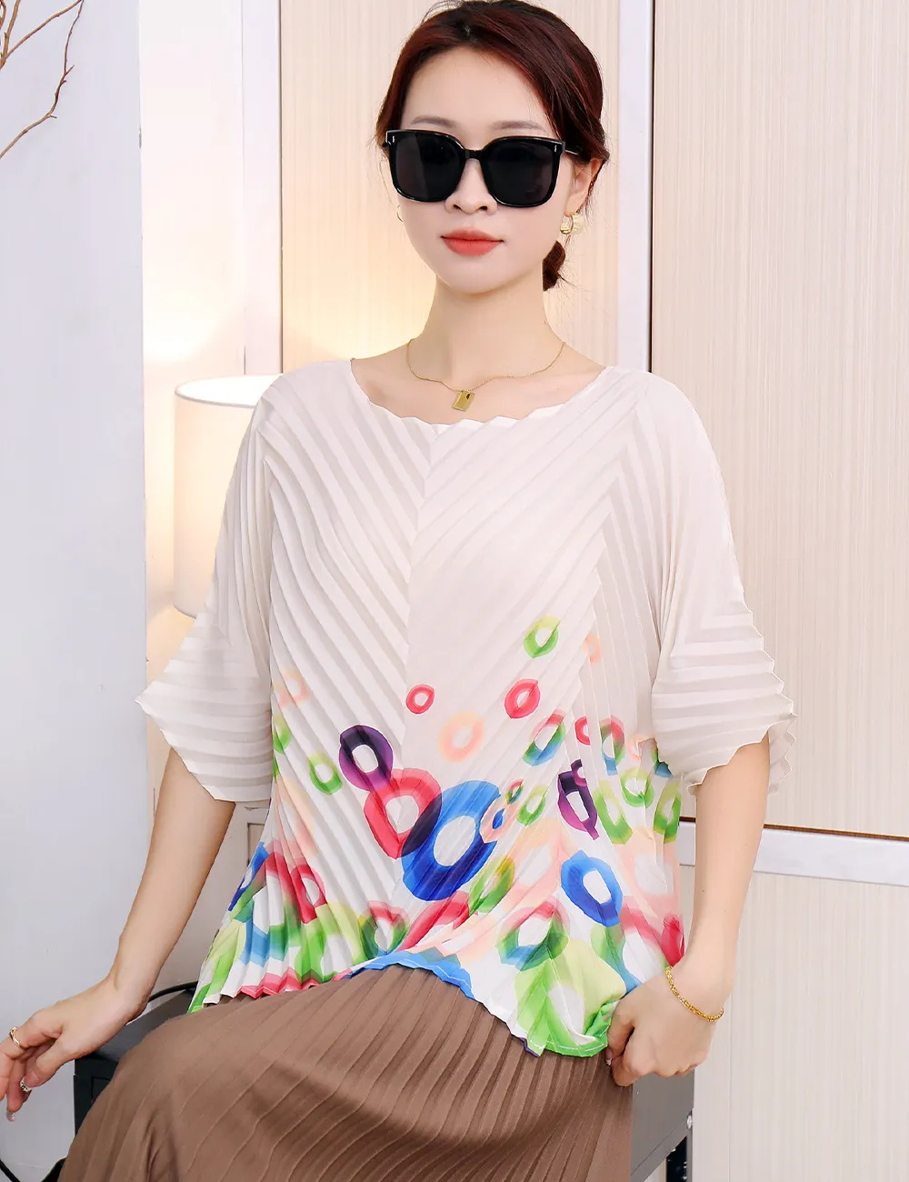 衣都精品- 2023新款褶皺印花短袖氣質壓褶上衣