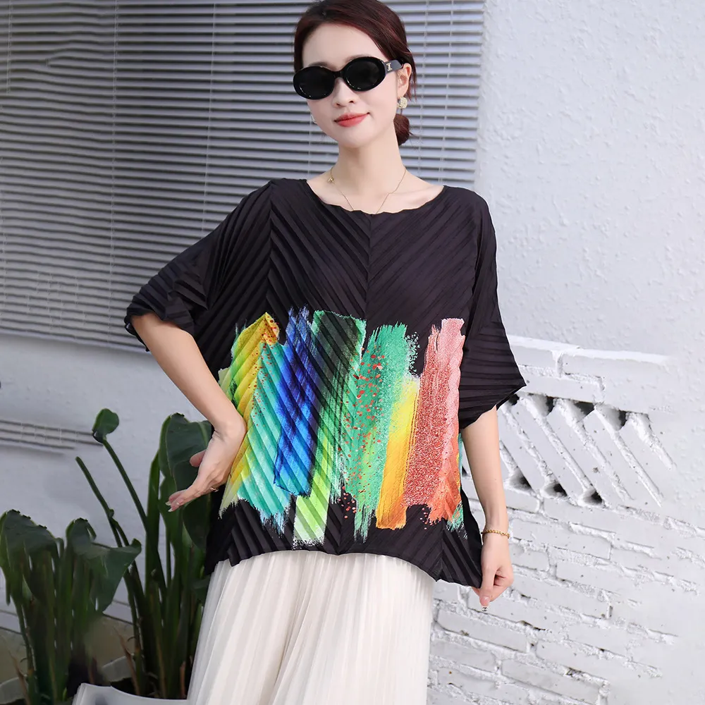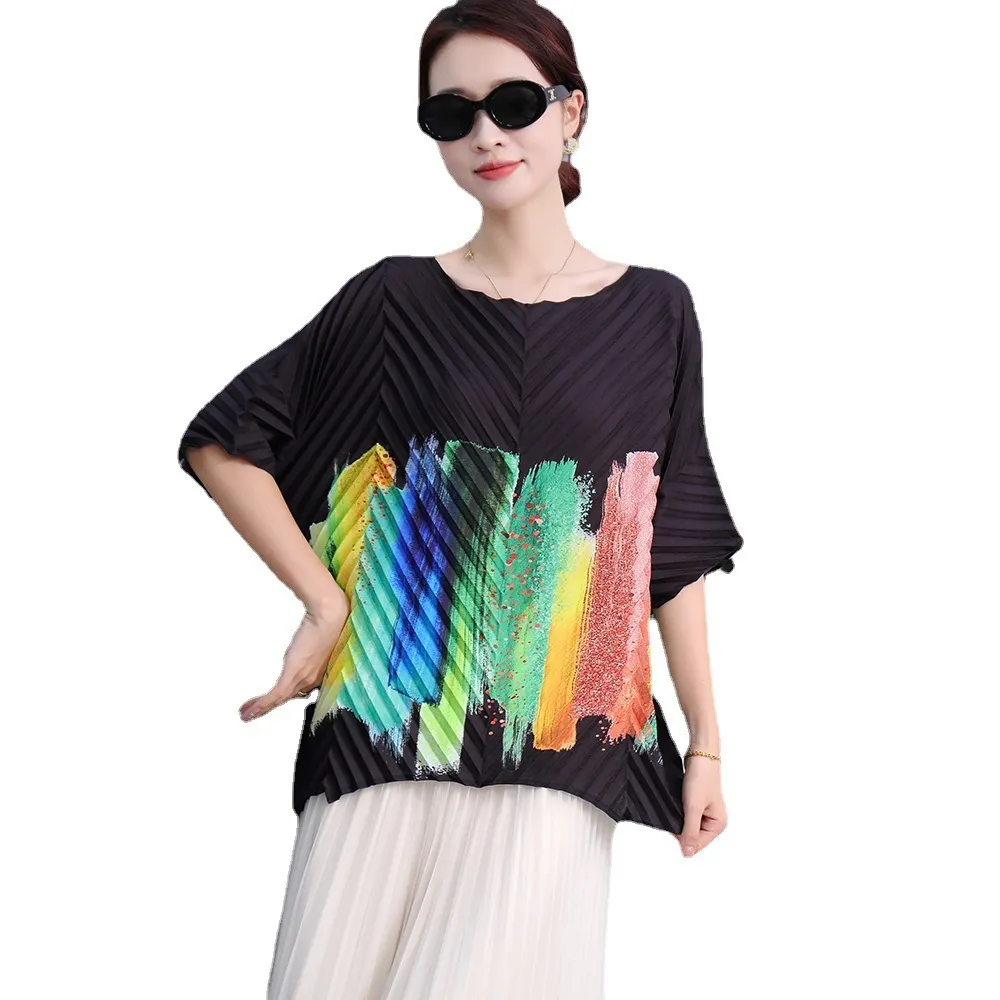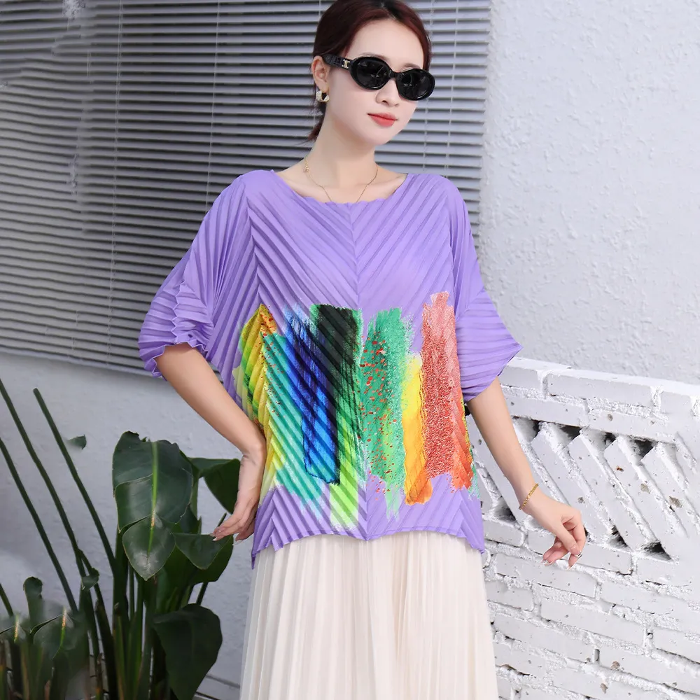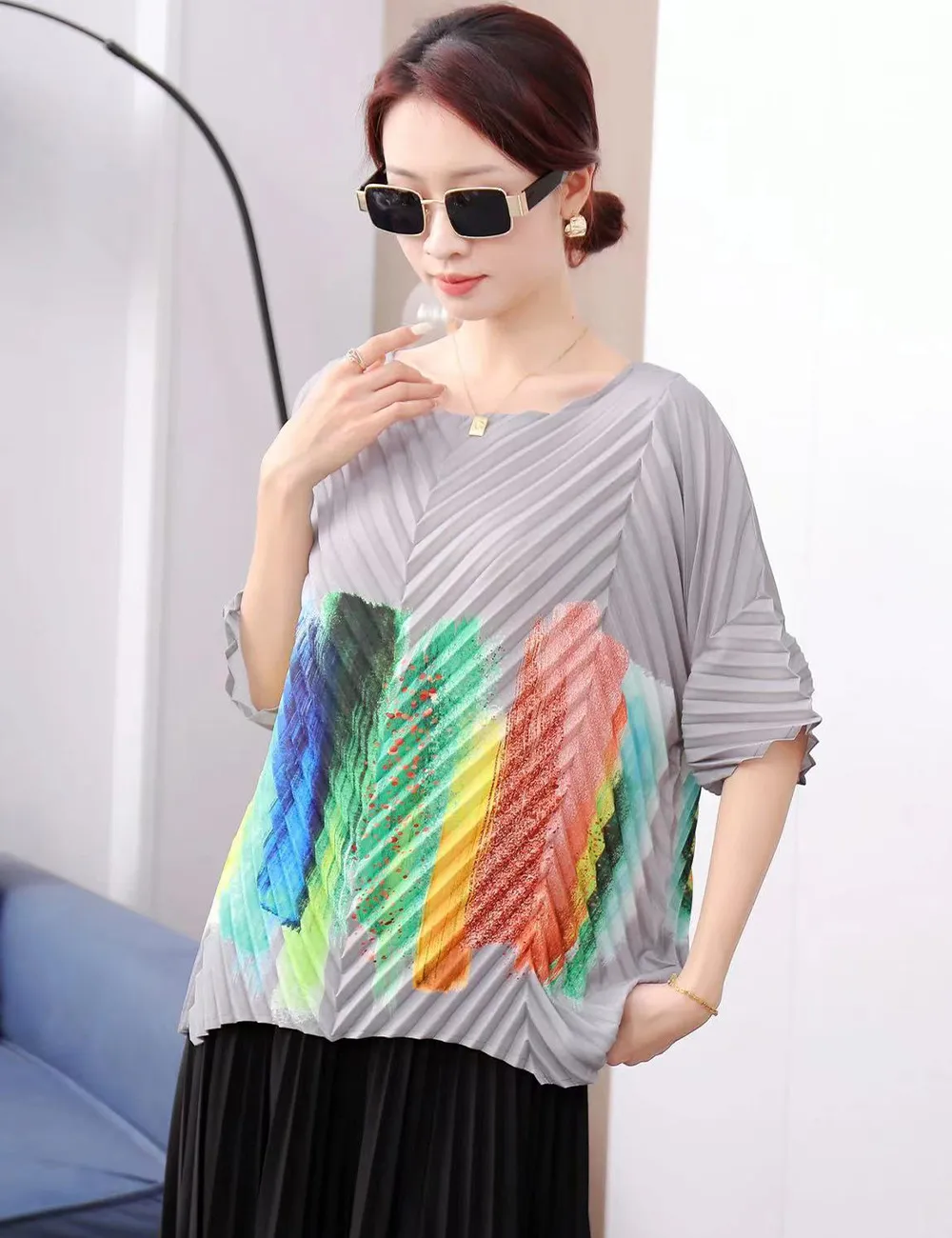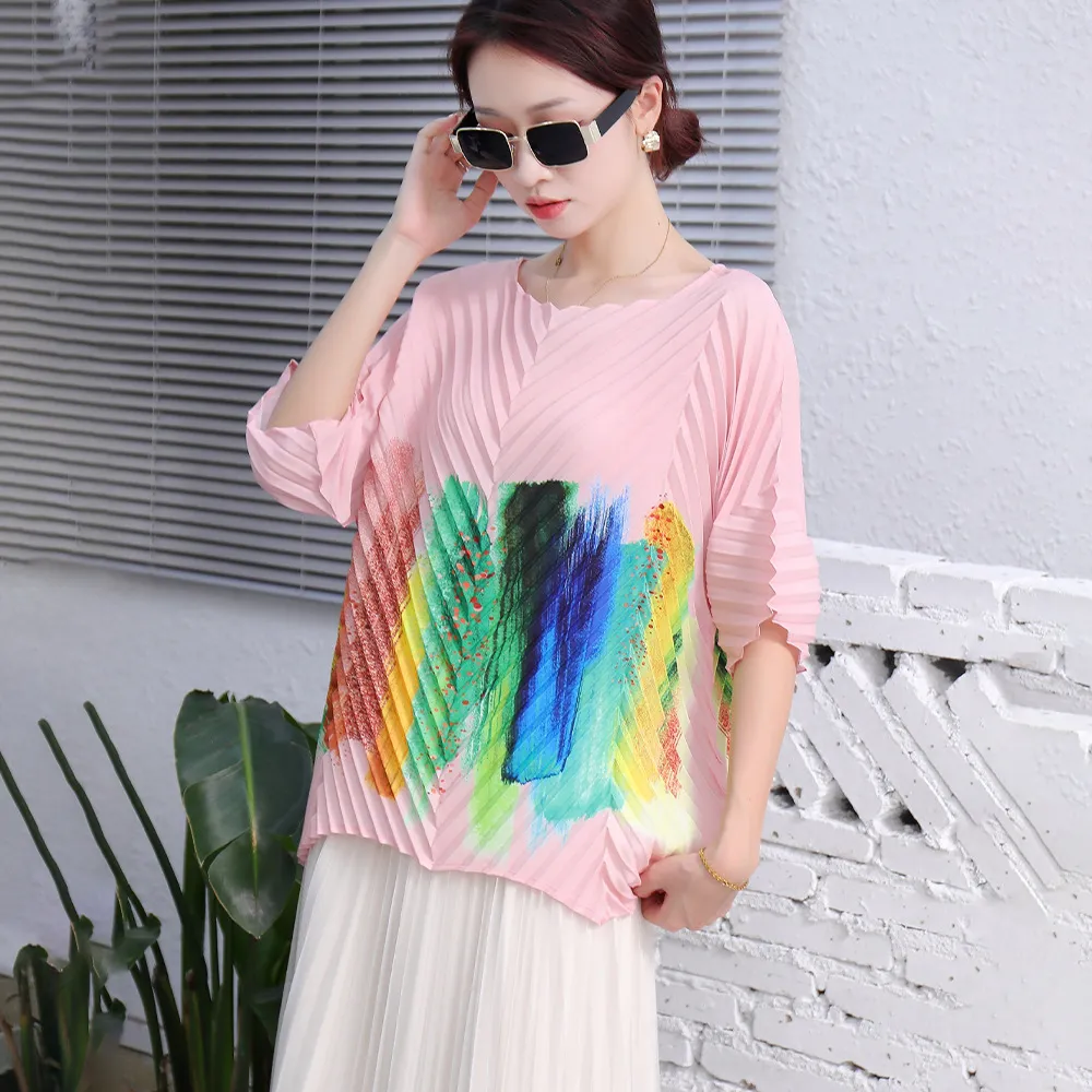 衣都精品- 2023新款褶皺印花短袖氣質壓褶上衣