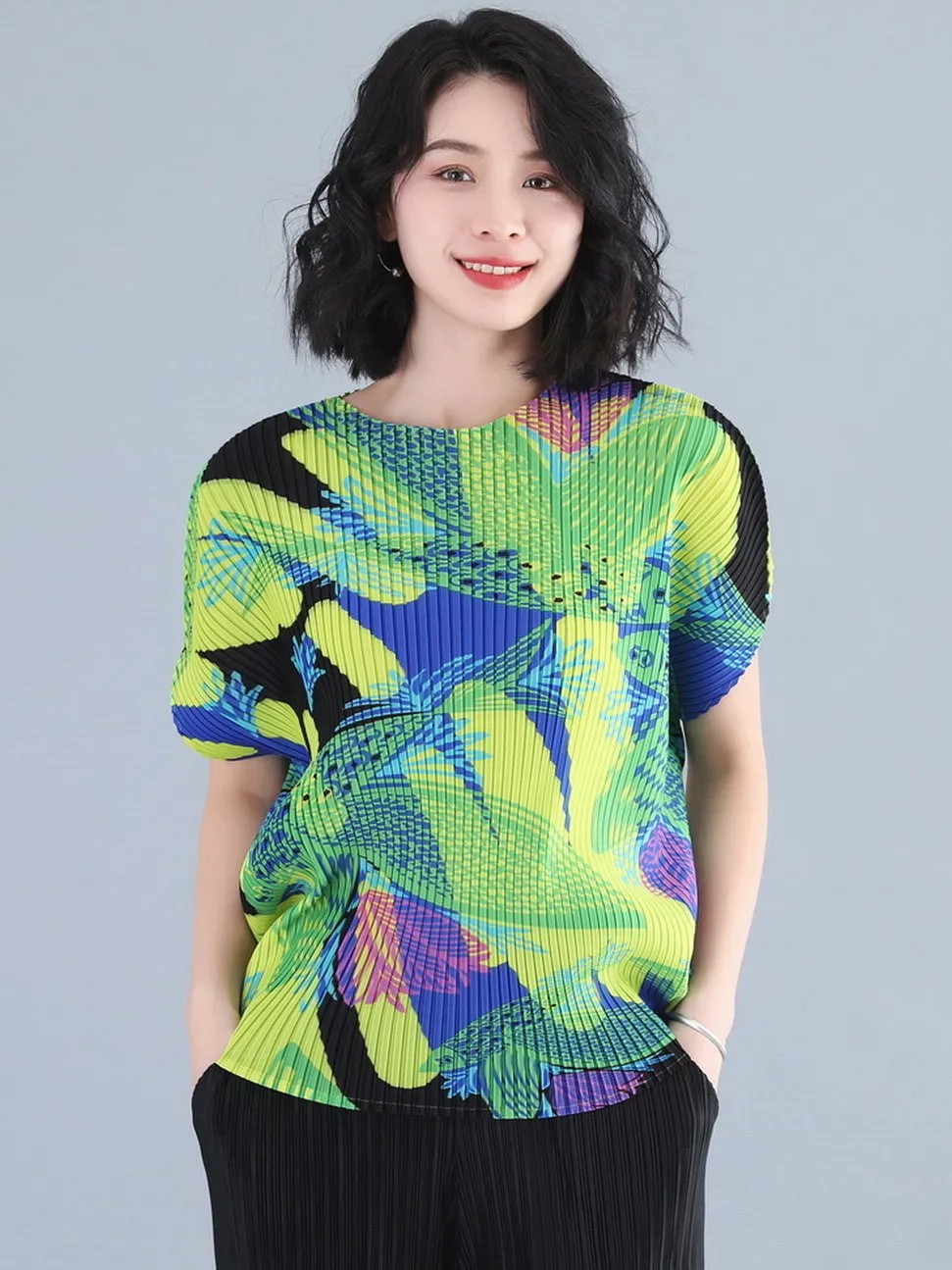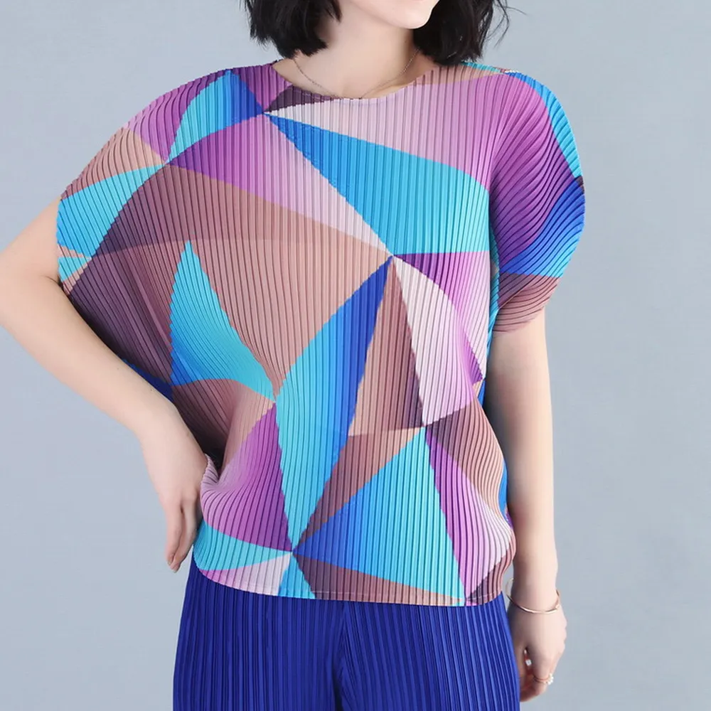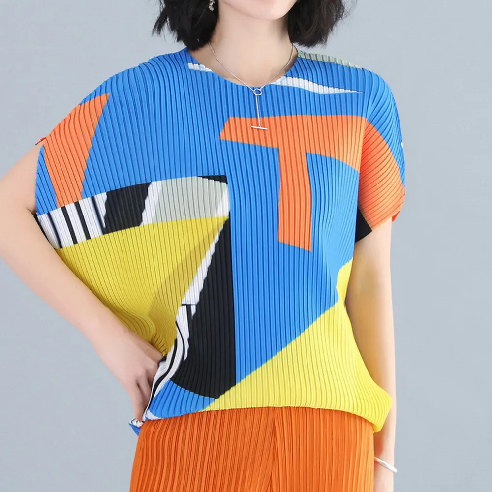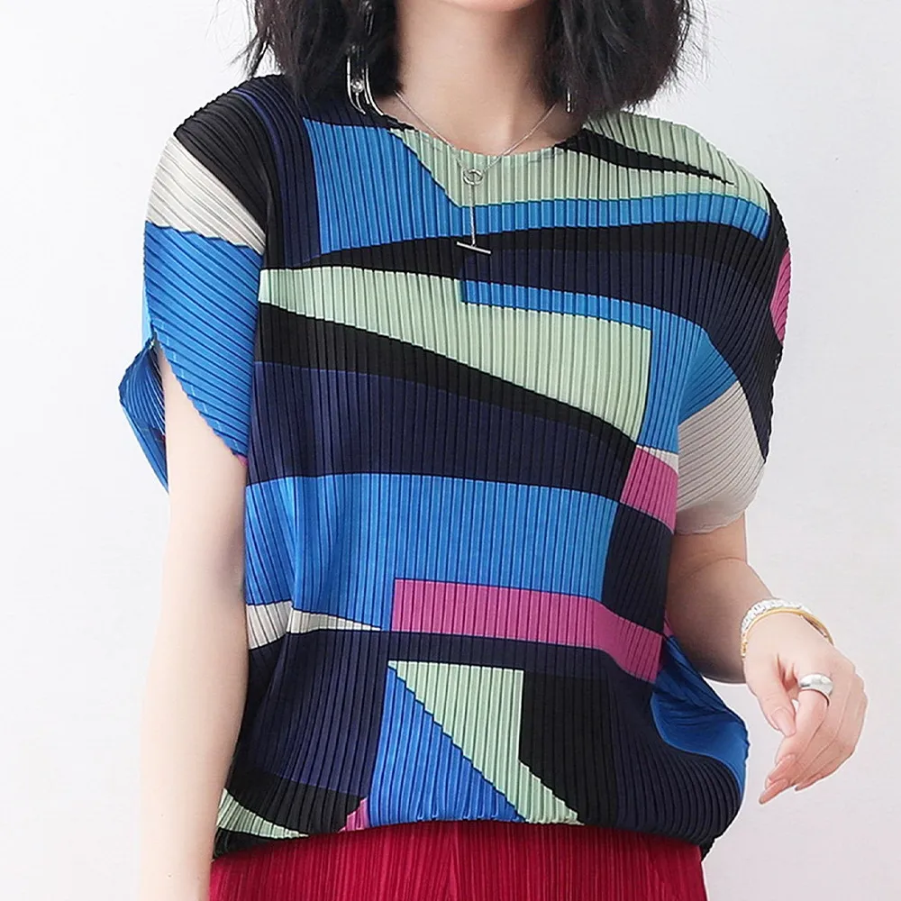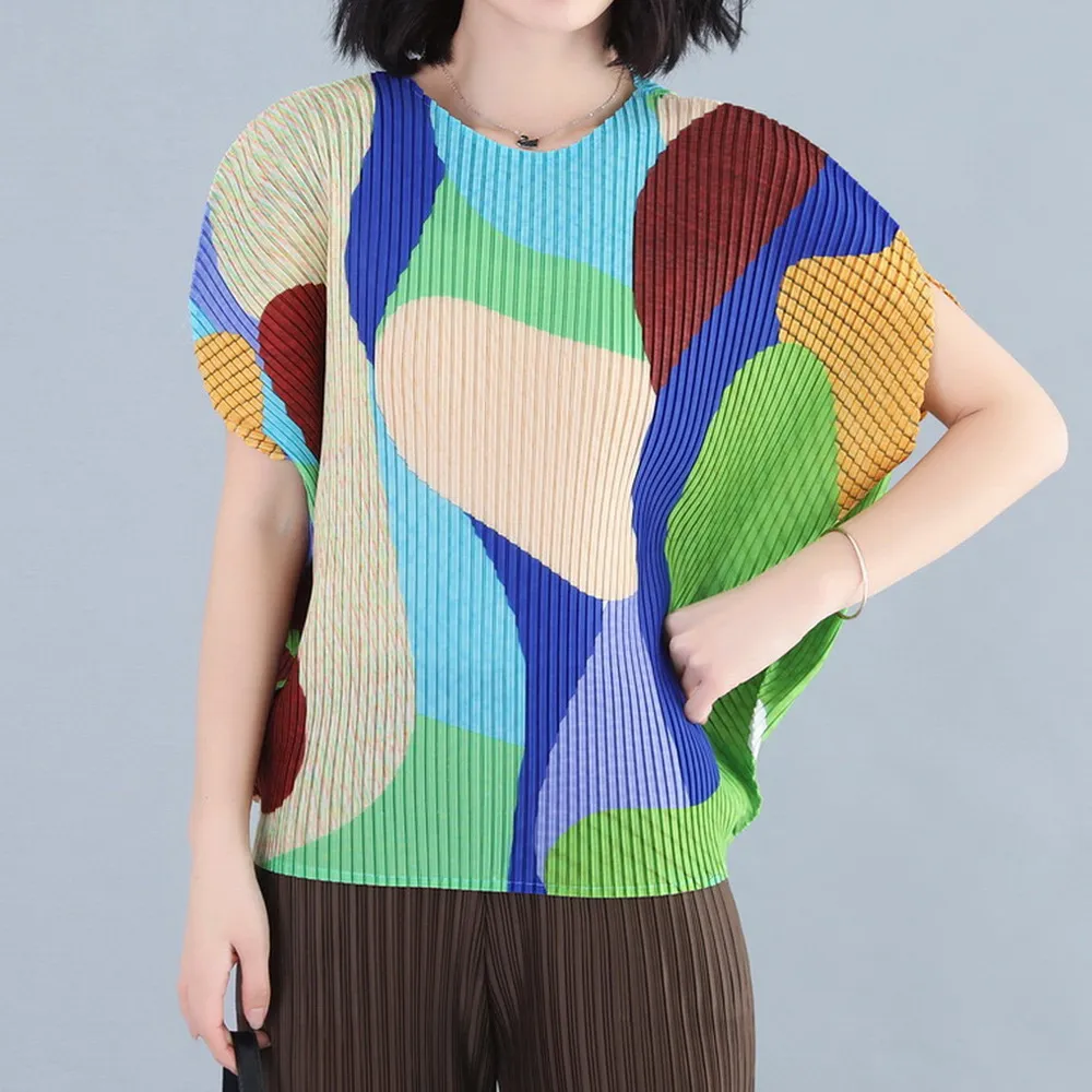 衣都精品- 2023新款褶皺印花短袖氣質壓褶上衣