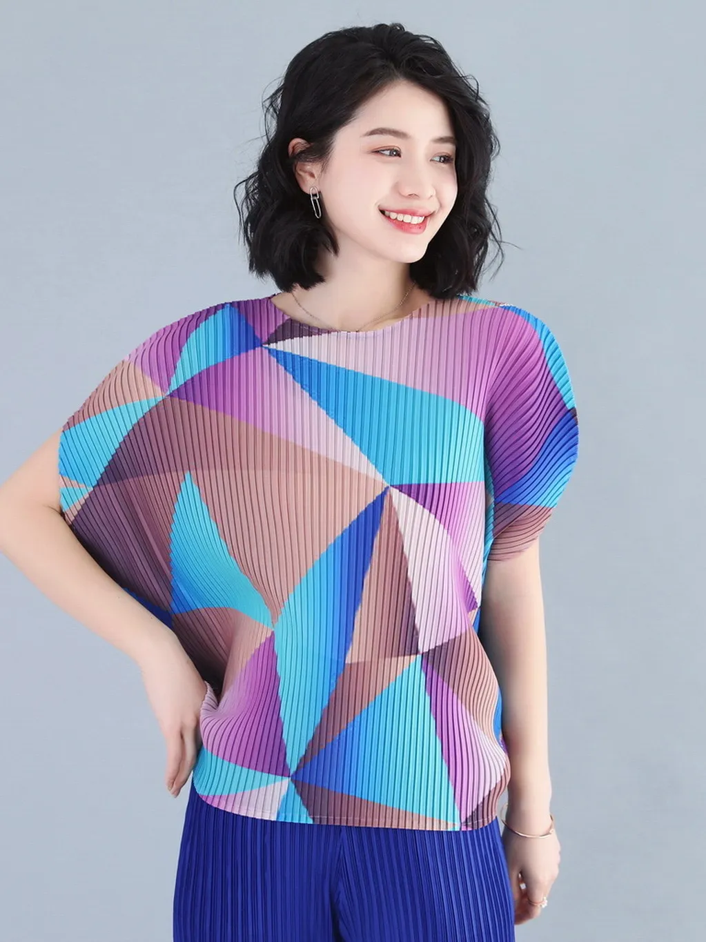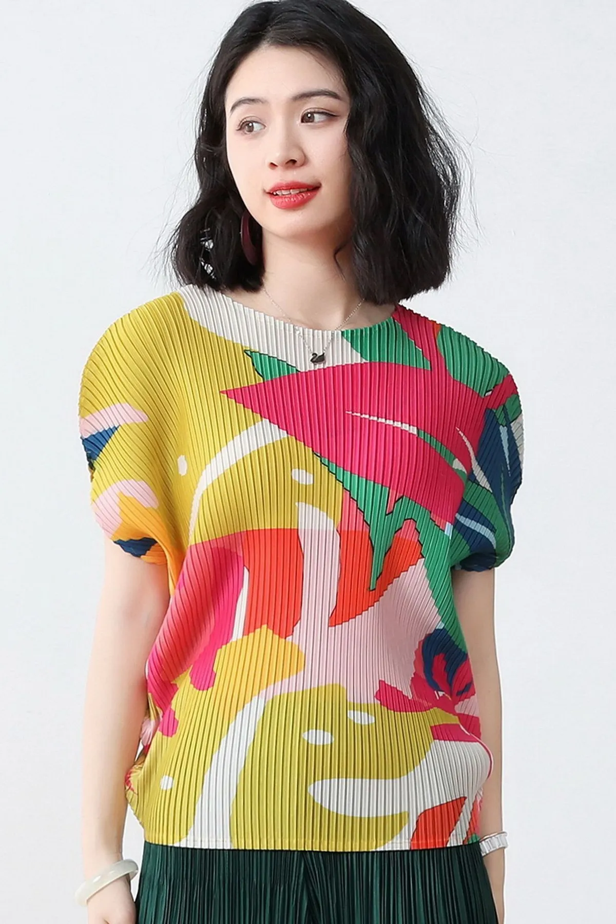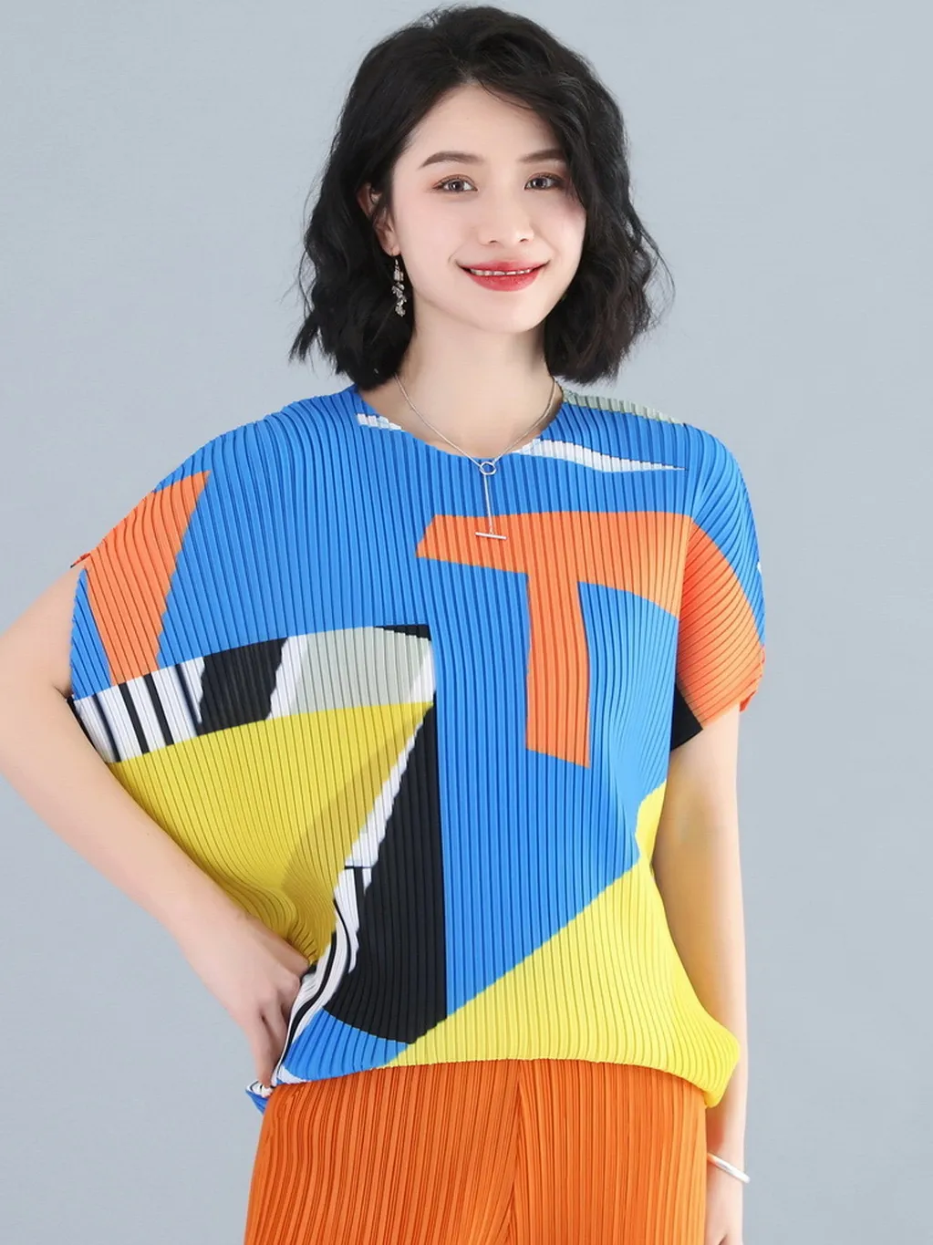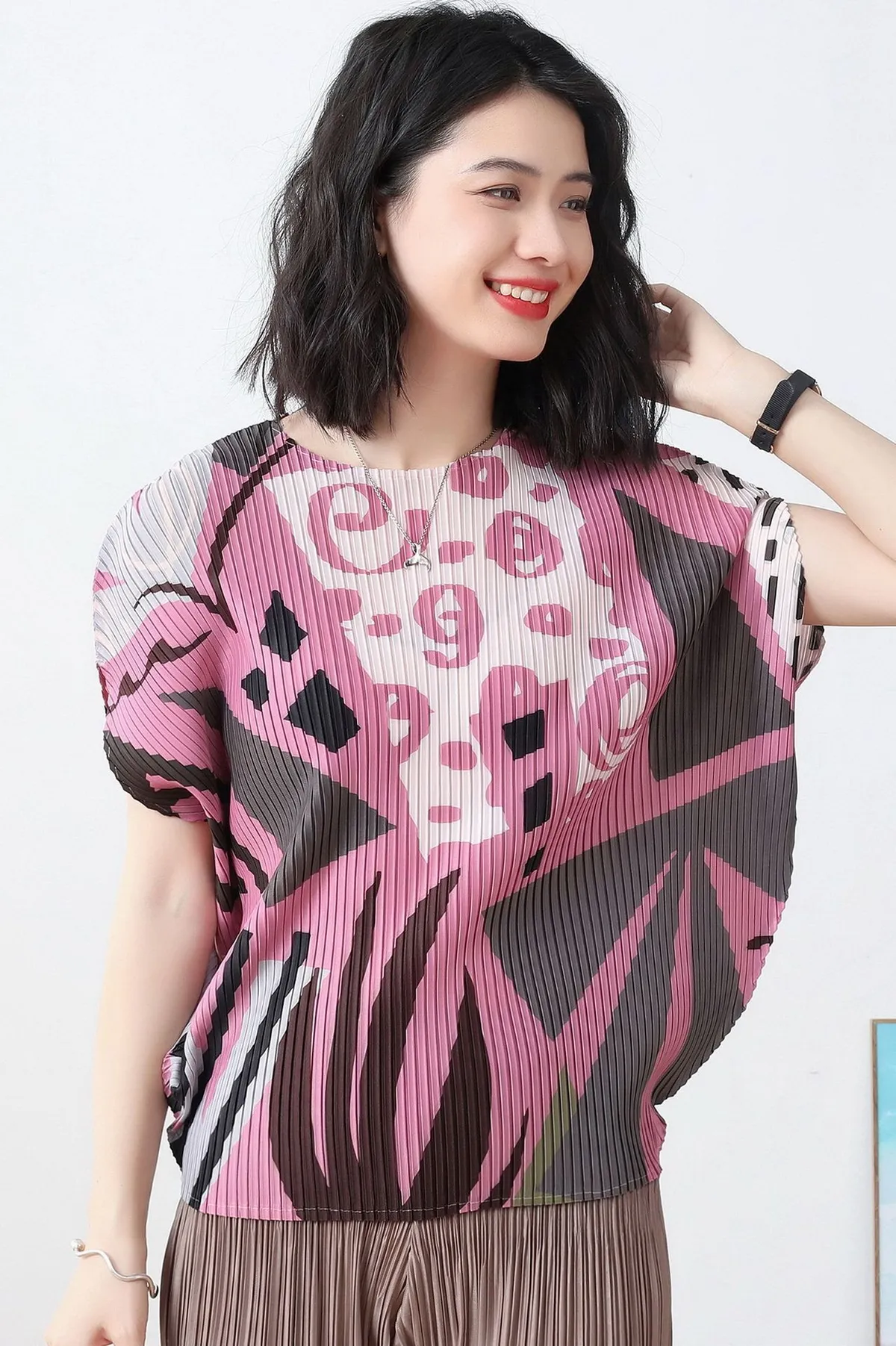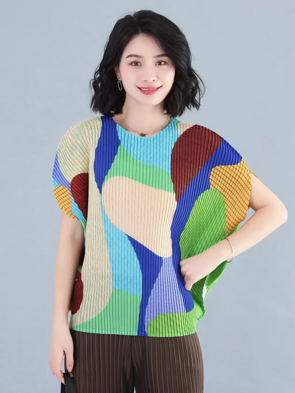 衣都精品- 2023新款褶皺印花短袖氣質壓褶上衣