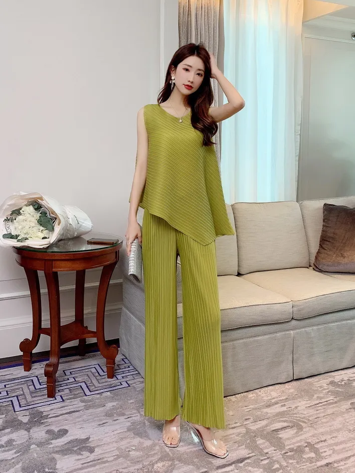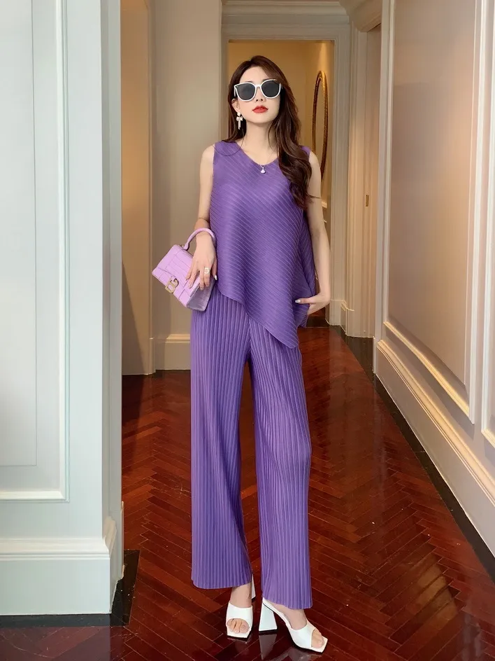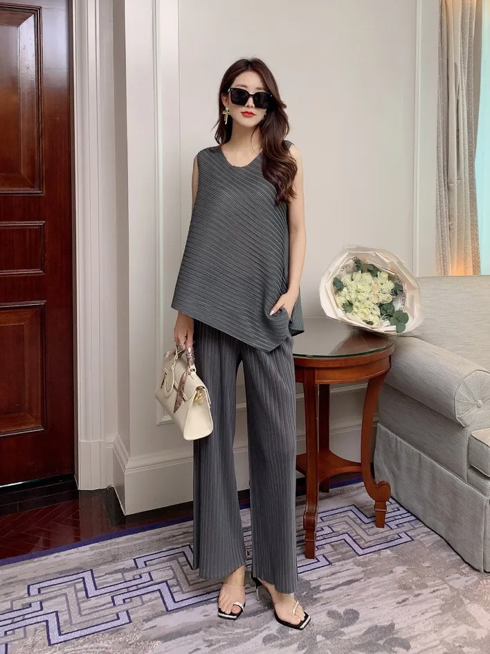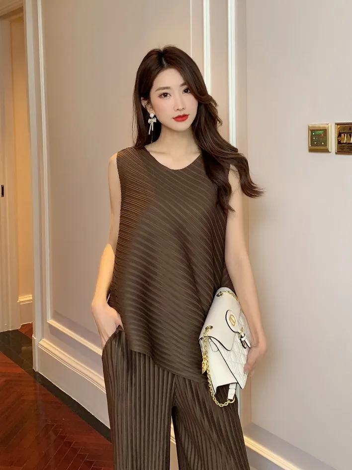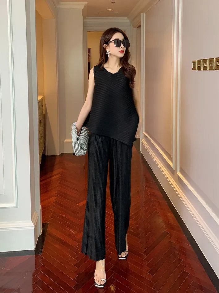 衣都精品- 2023新款百褶圓領不規則無袖褶皺上衣+闊腿褲套裝