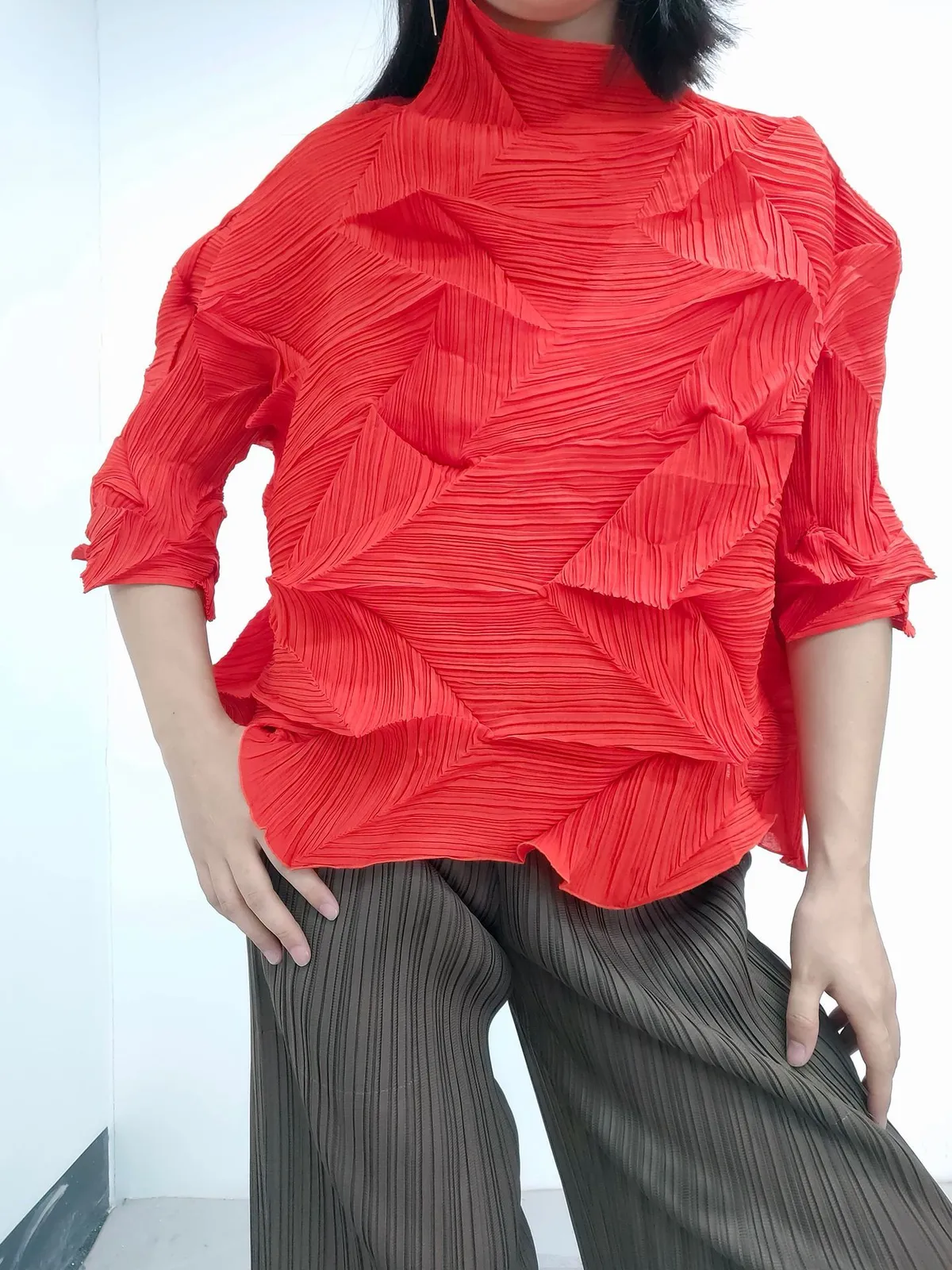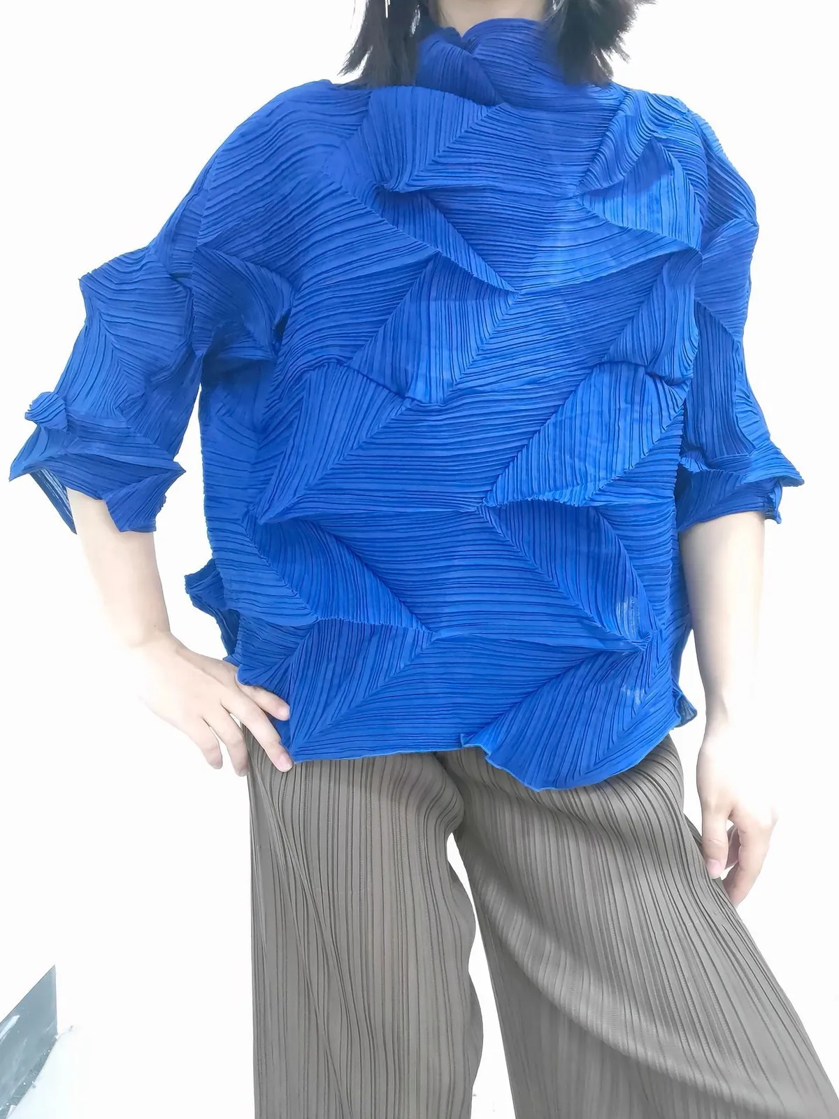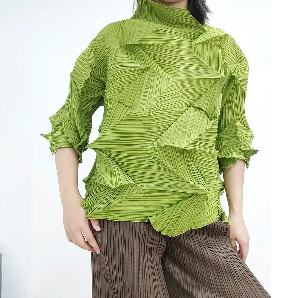 衣都精品- 2023新款時尚半高領純色鑽石褶上衣