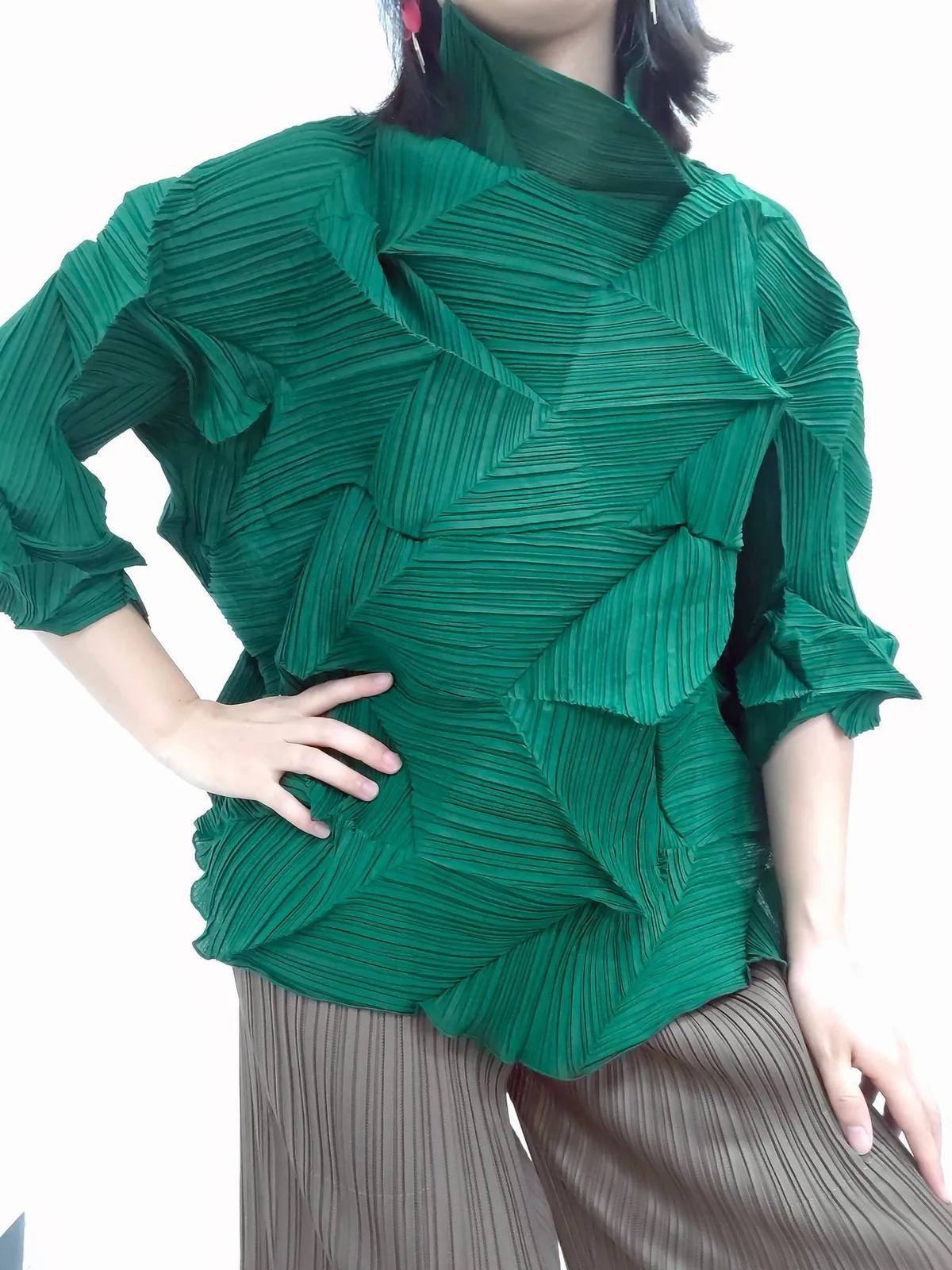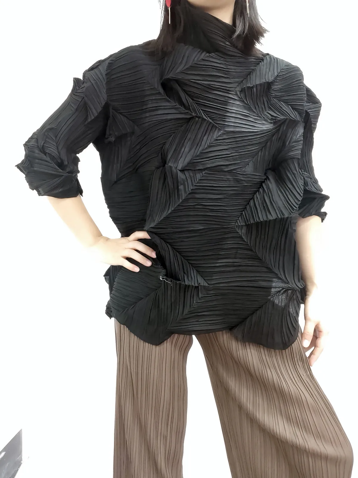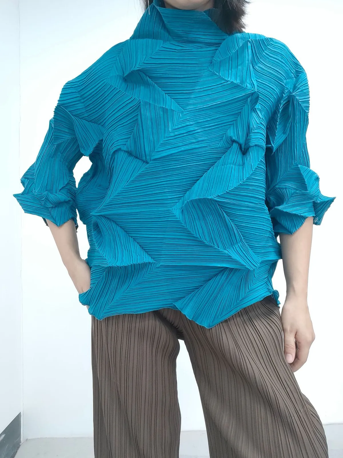 衣都精品- 2023新款時尚半高領純色鑽石褶上衣