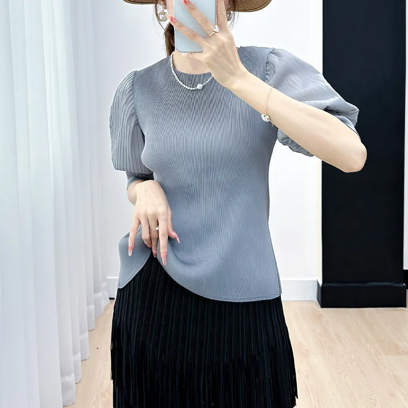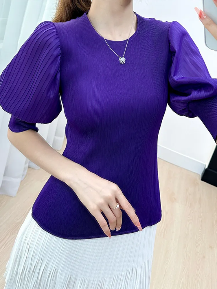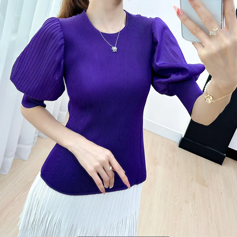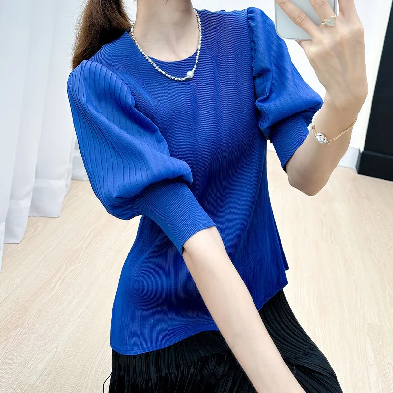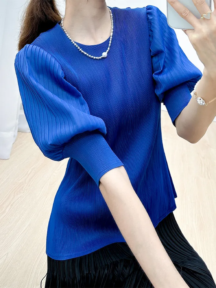 衣都精品- 2023新款氣質簡約燈籠袖超彈褶皺上衣