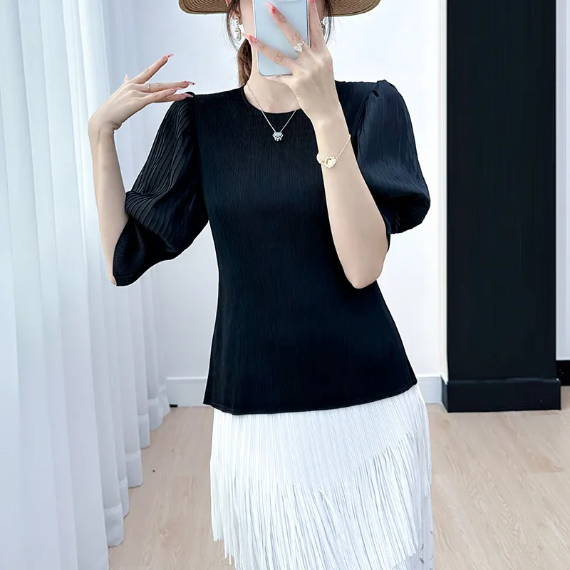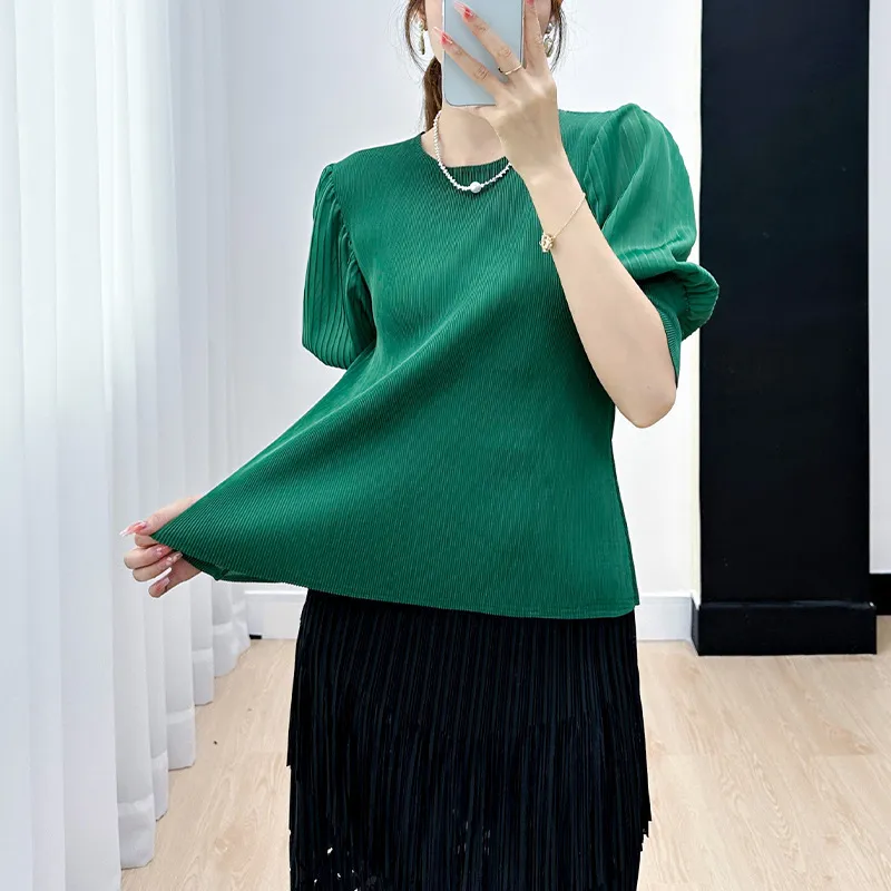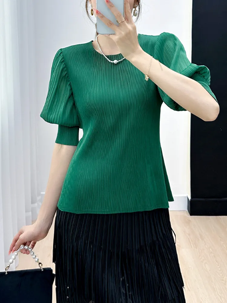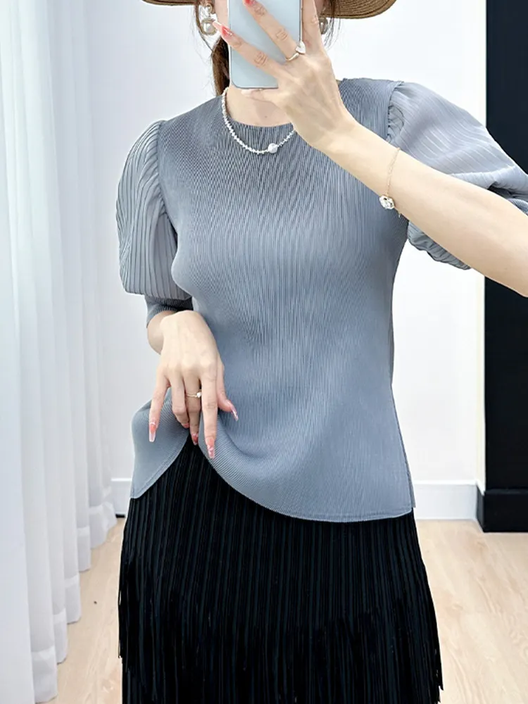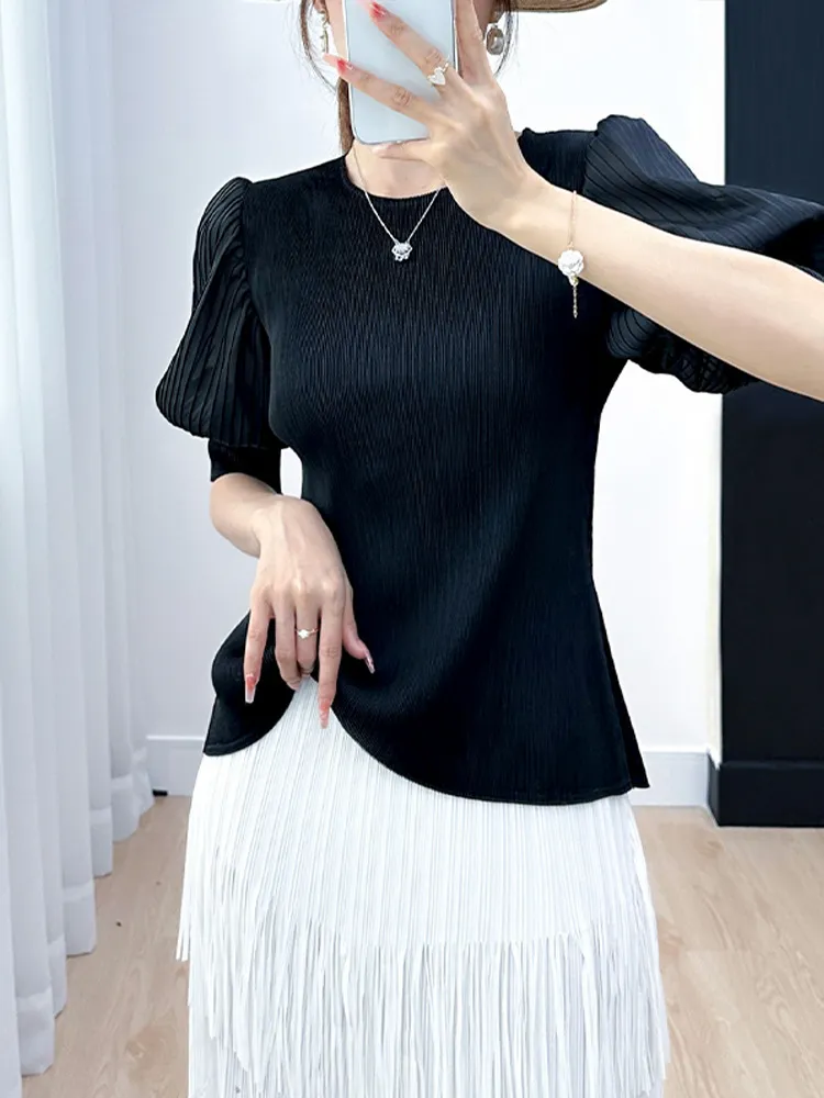 衣都精品- 2023新款氣質簡約燈籠袖超彈褶皺上衣
