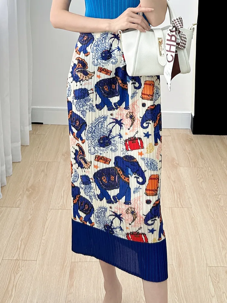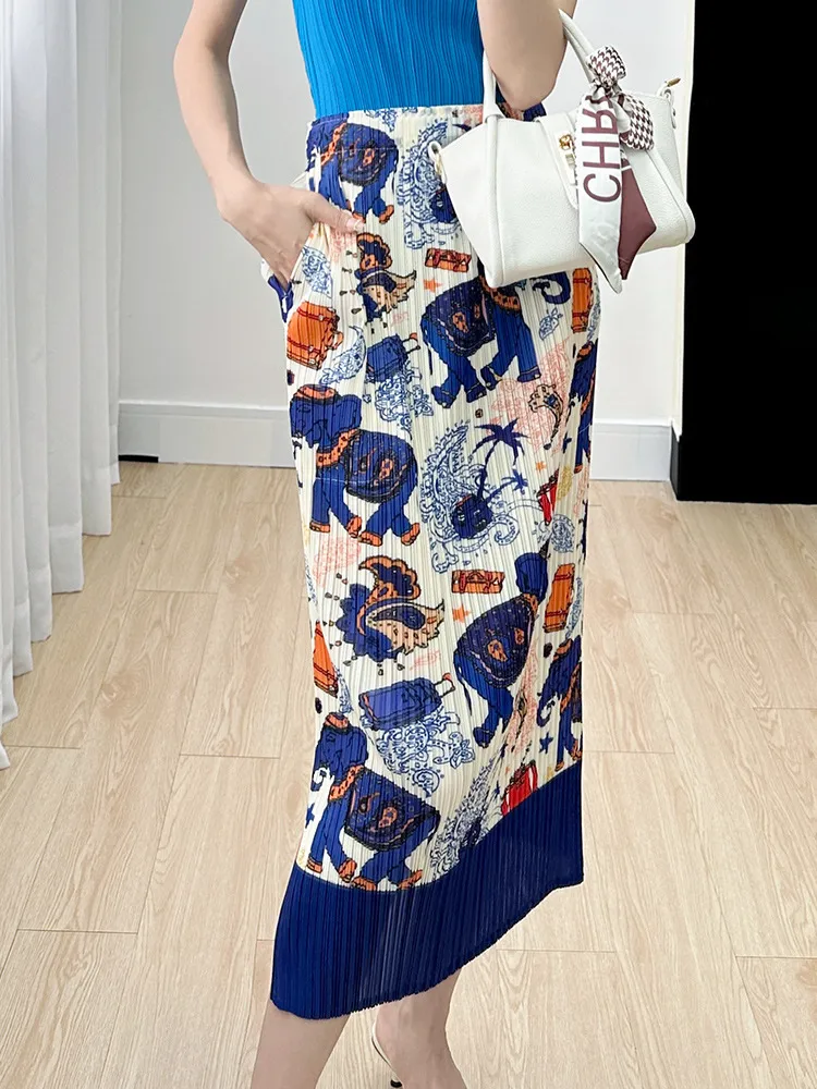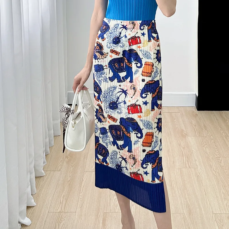 衣都精品- 2023新款百褶中長款印花包臀半身裙