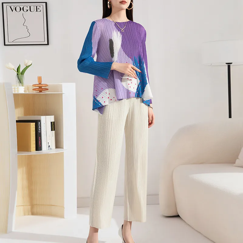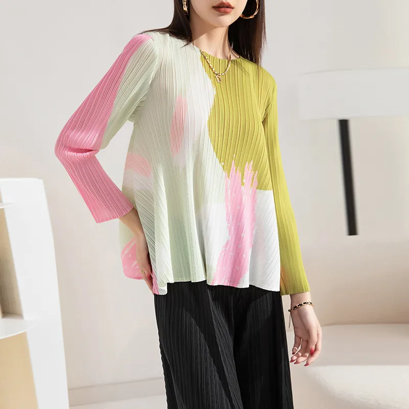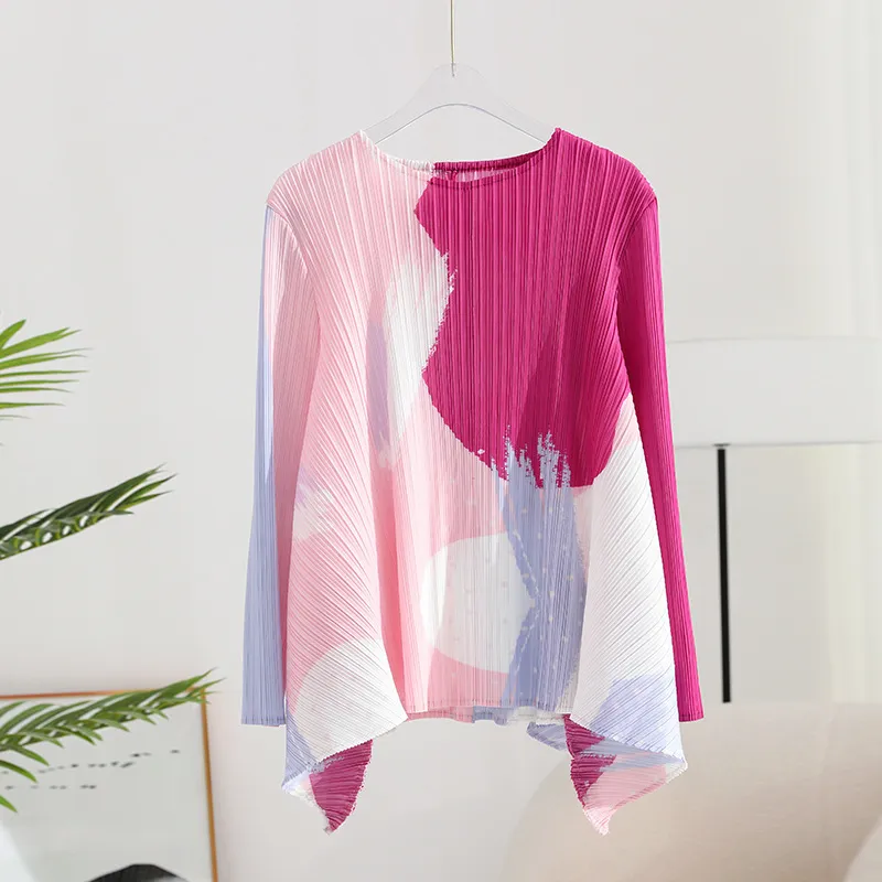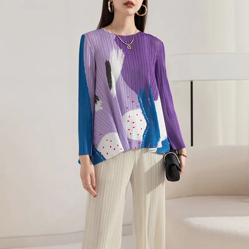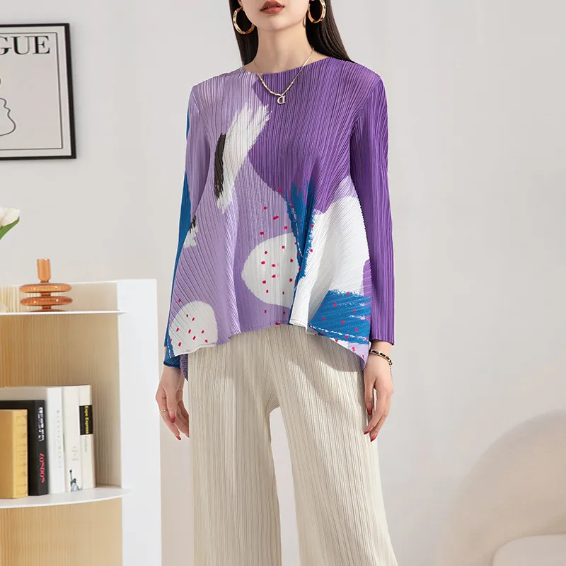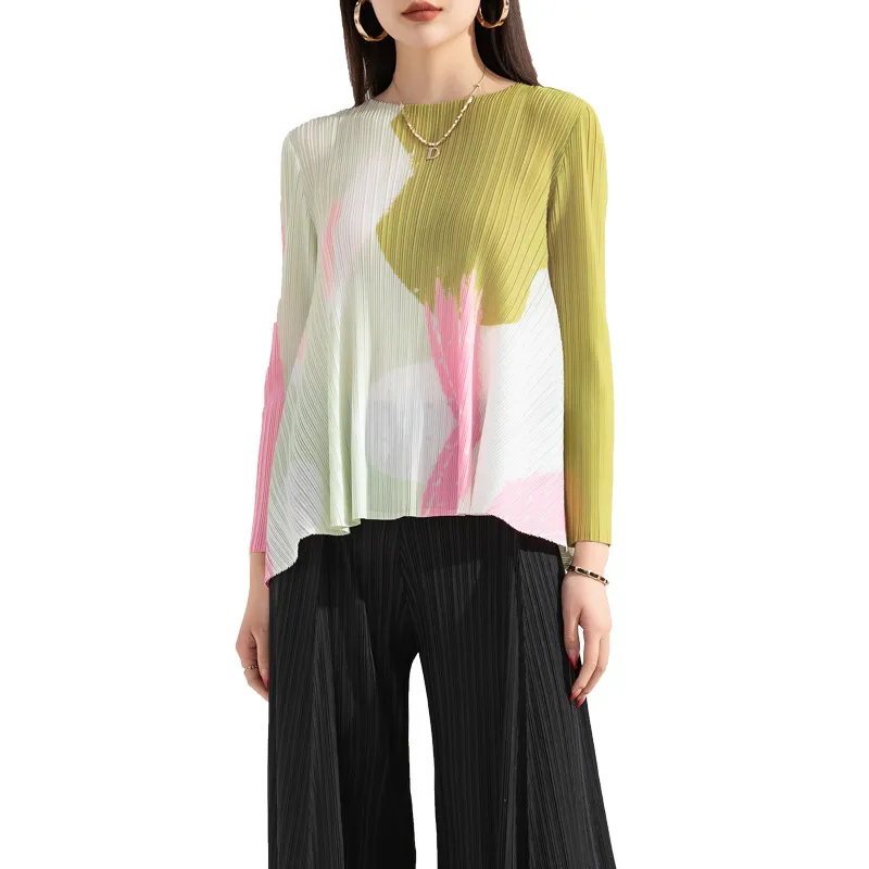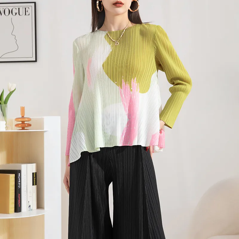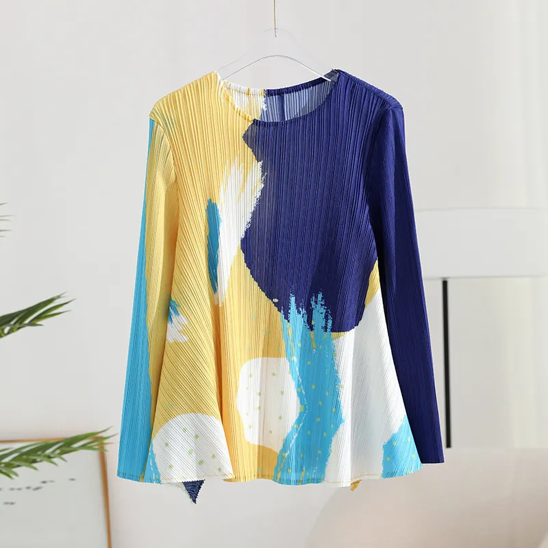 衣都精品- 2023新款高端印花褶皺氣質優雅長袖上衣