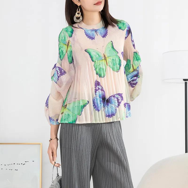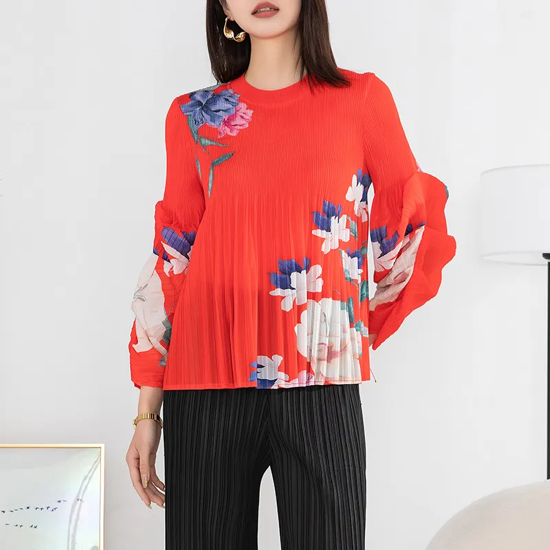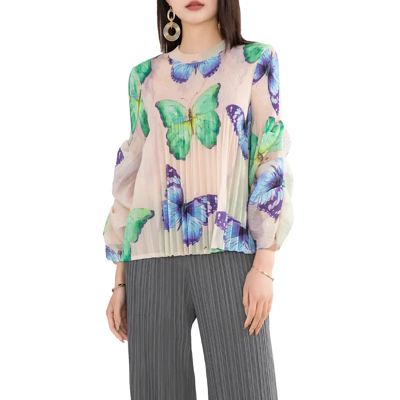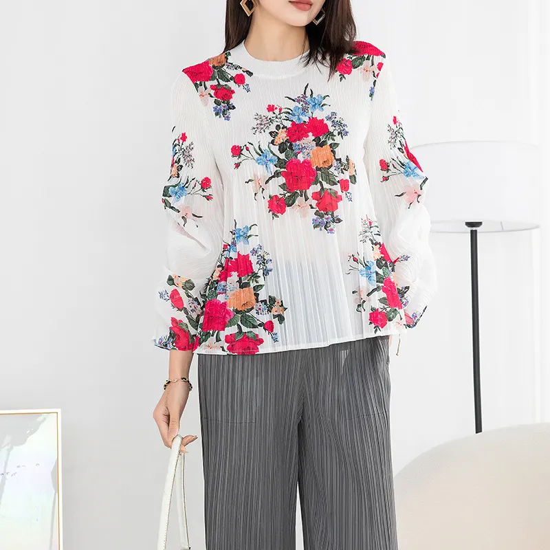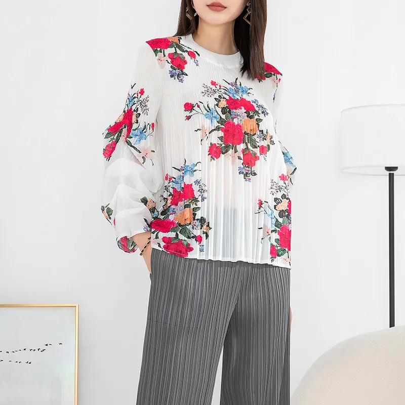 衣都精品- 2023新款高端印花褶皺氣質優雅長袖上衣