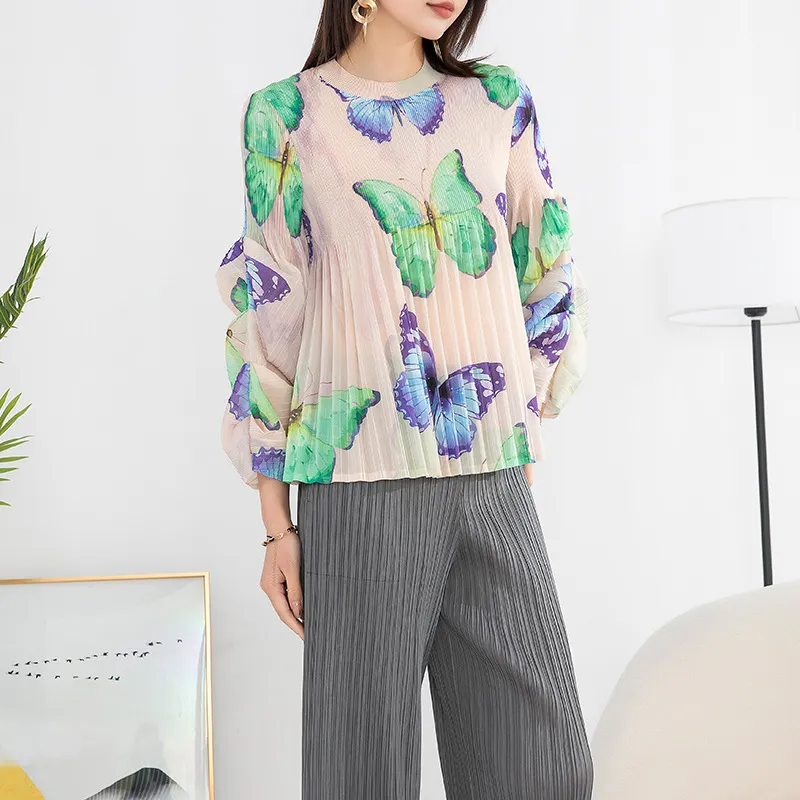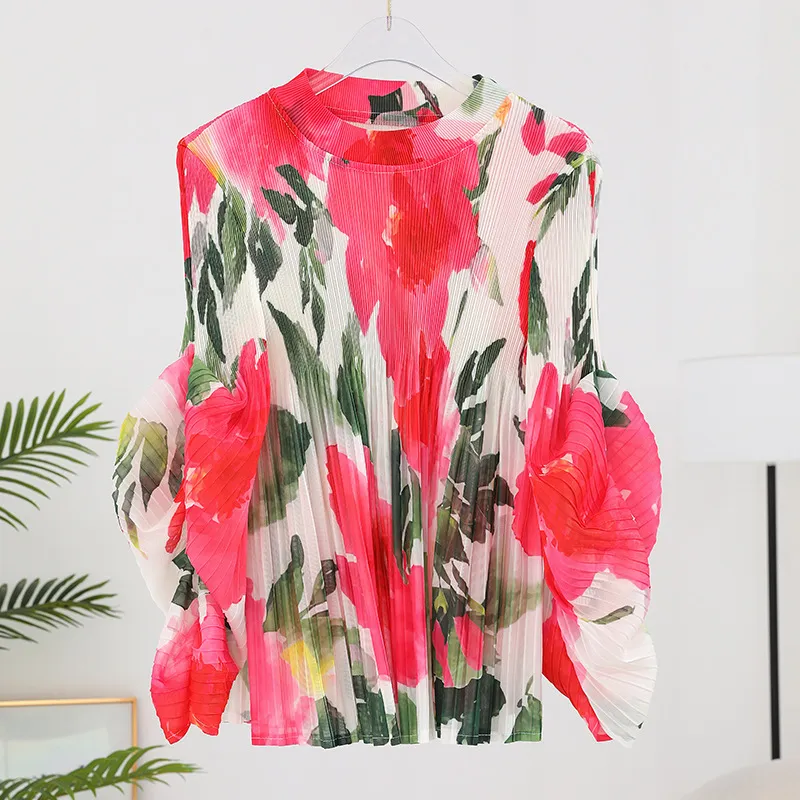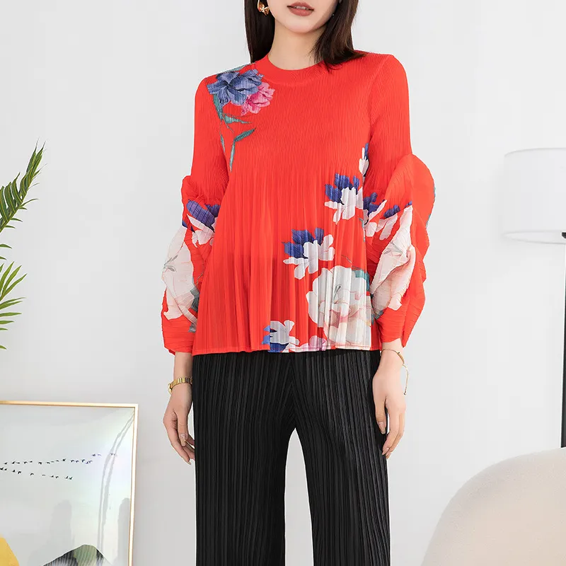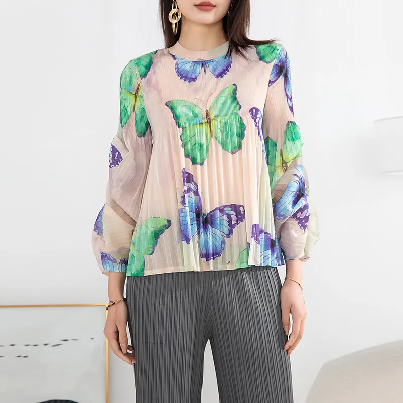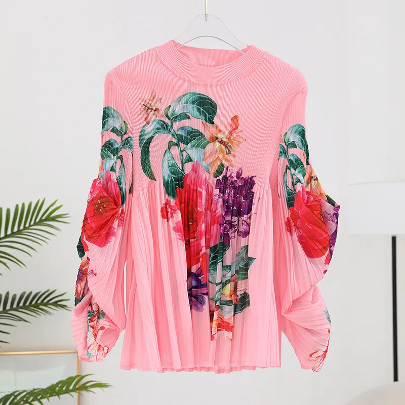 衣都精品- 2023新款高端印花褶皺氣質優雅長袖上衣