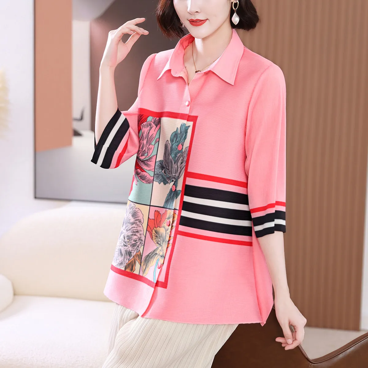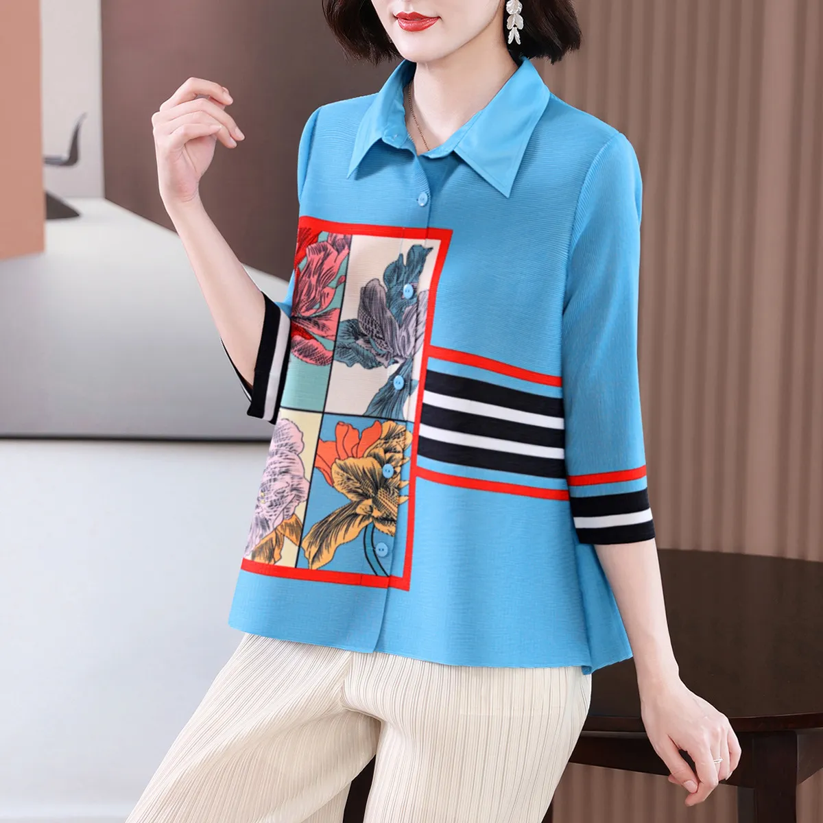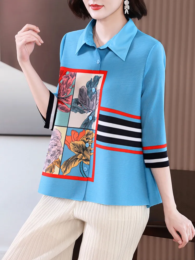 衣都精品- 2023新款減齡印花別緻洋氣大碼褶皺上衣