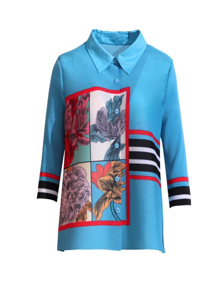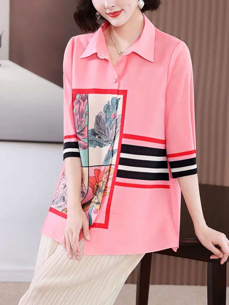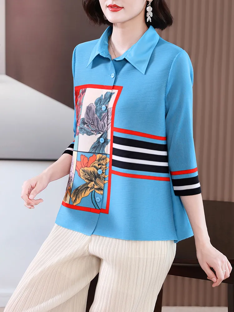 衣都精品- 2023新款寬鬆大碼遮肉翻領印花排扣褶皺上衣