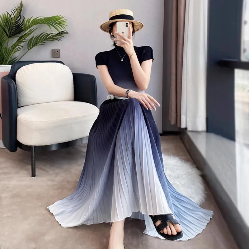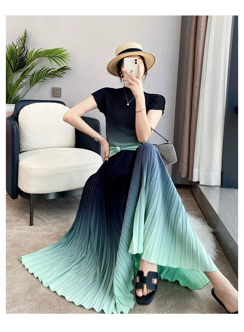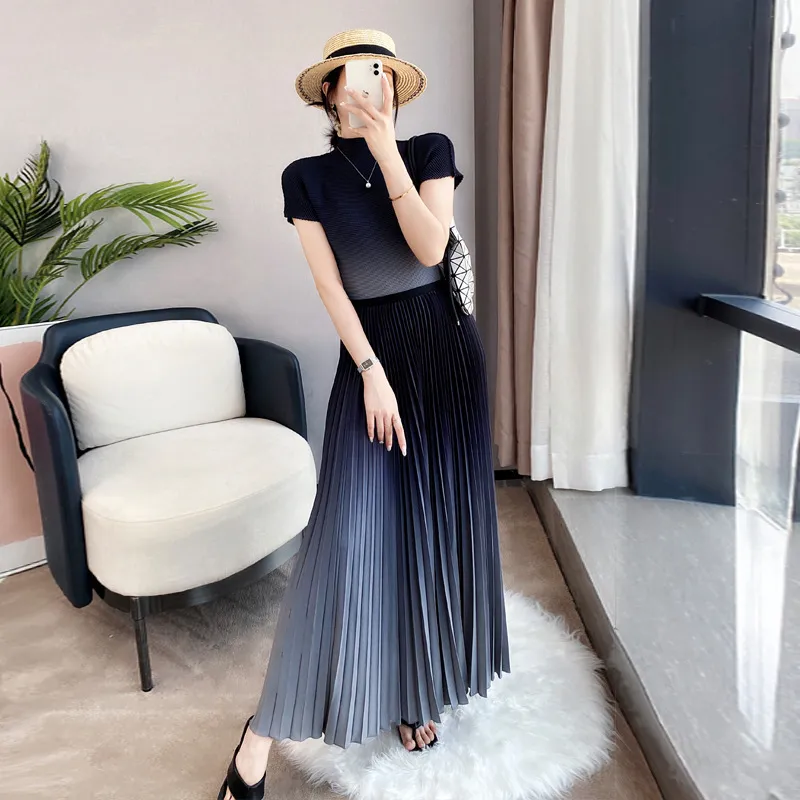 衣都精品- 2023新款高腰修身半高領漸變色褶皺套裝