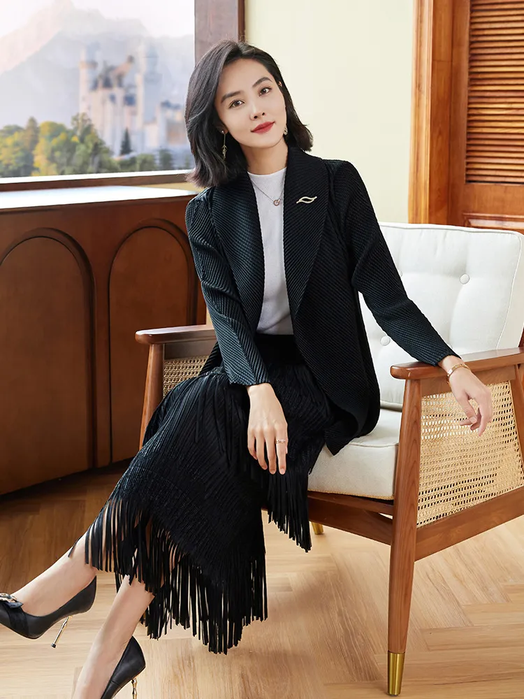 衣都精品- 2023新款時尚印花裙子外套+休閒直筒褲兩件式褶皺套裝