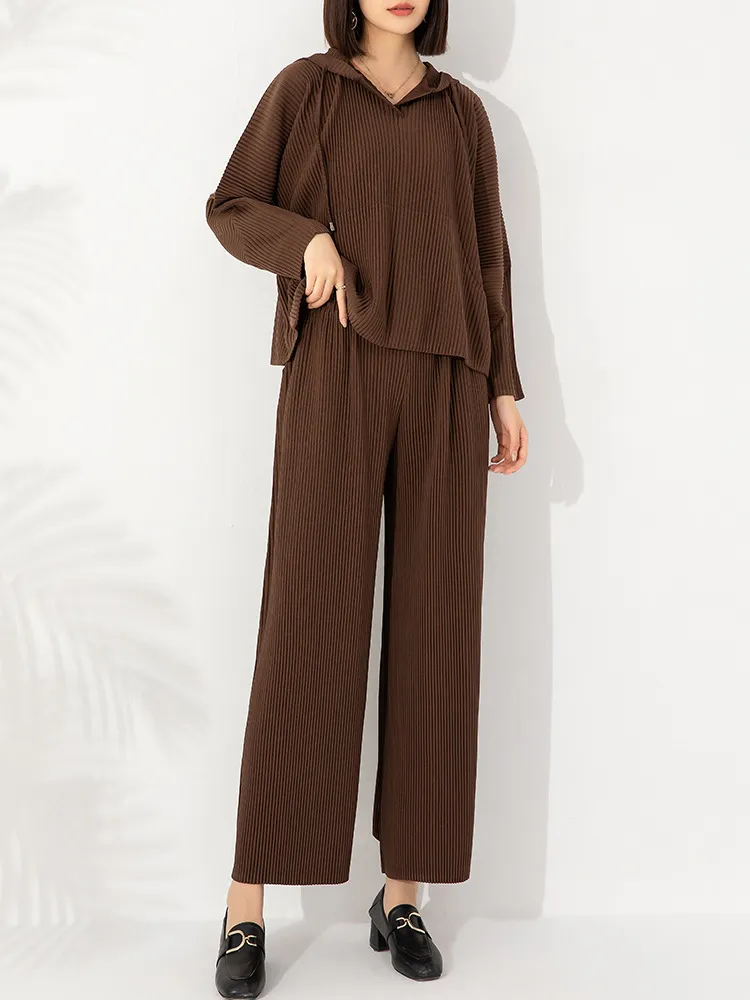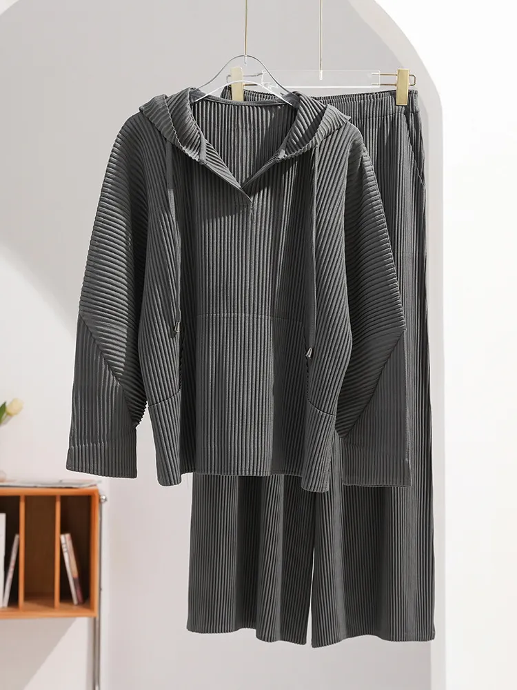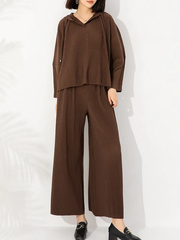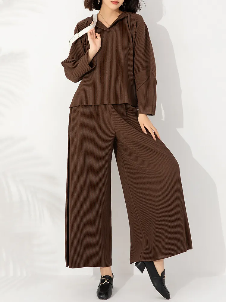 衣都精品- 2023新款純色連帽長袖衛衣+高腰闊腿褲休閒套裝