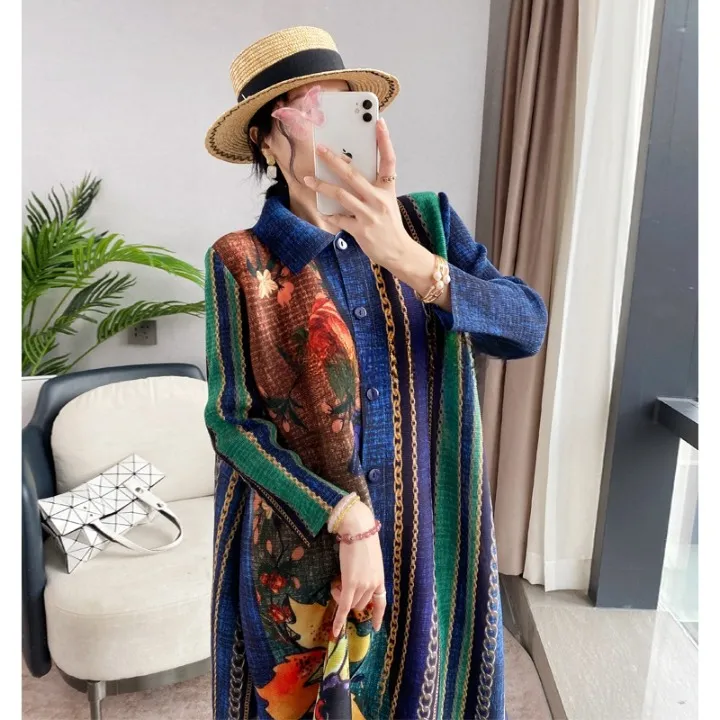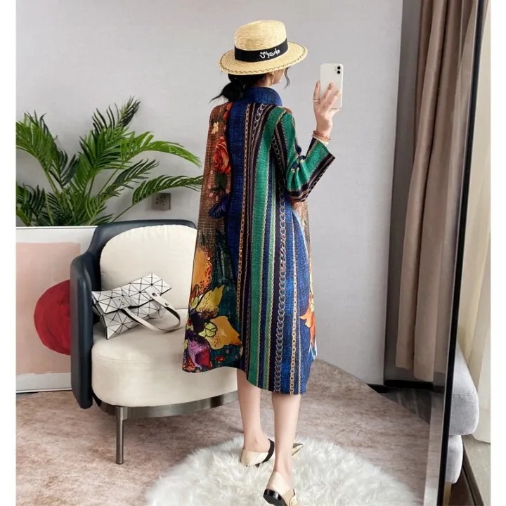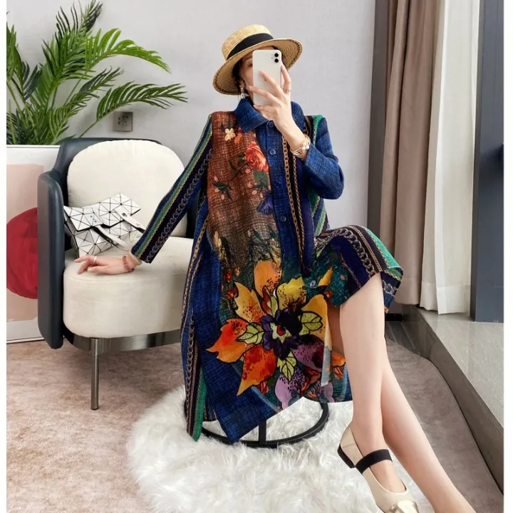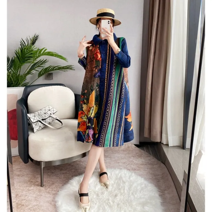 衣都精品- 2023新款大碼印花氣質顯瘦長款褶皺連衣裙