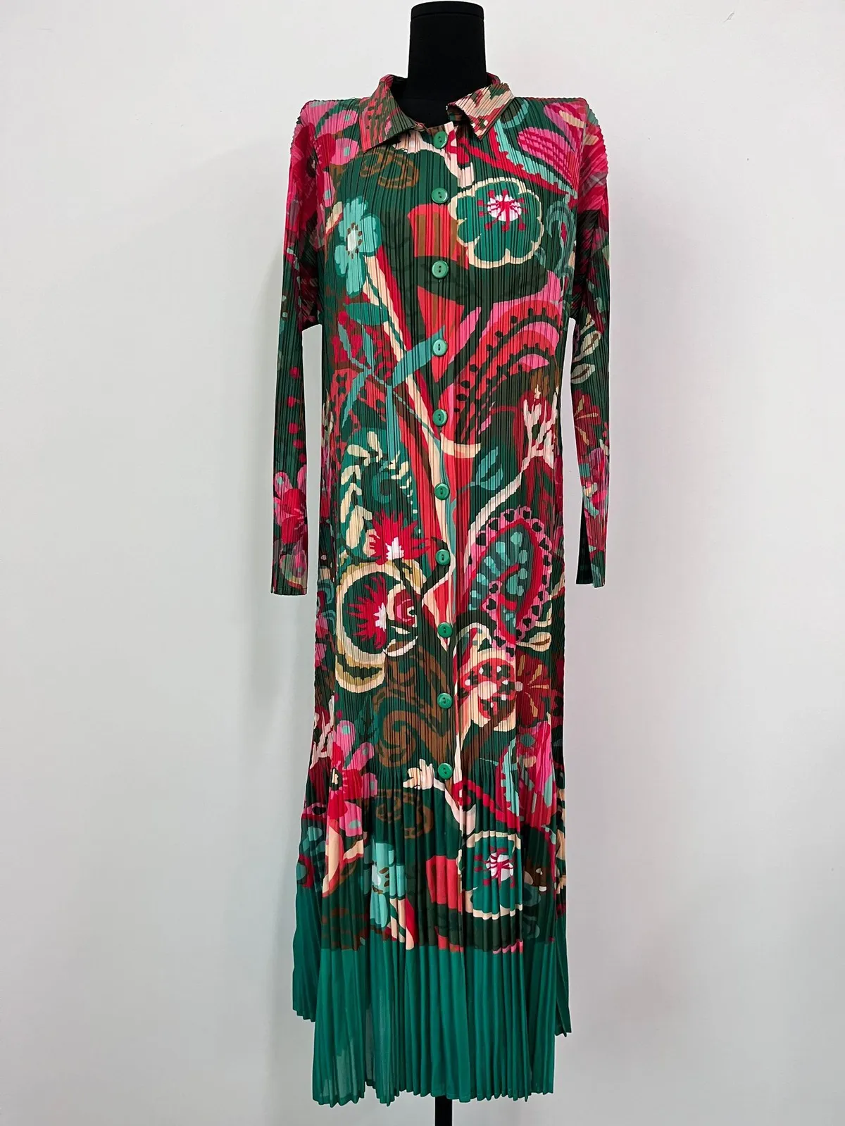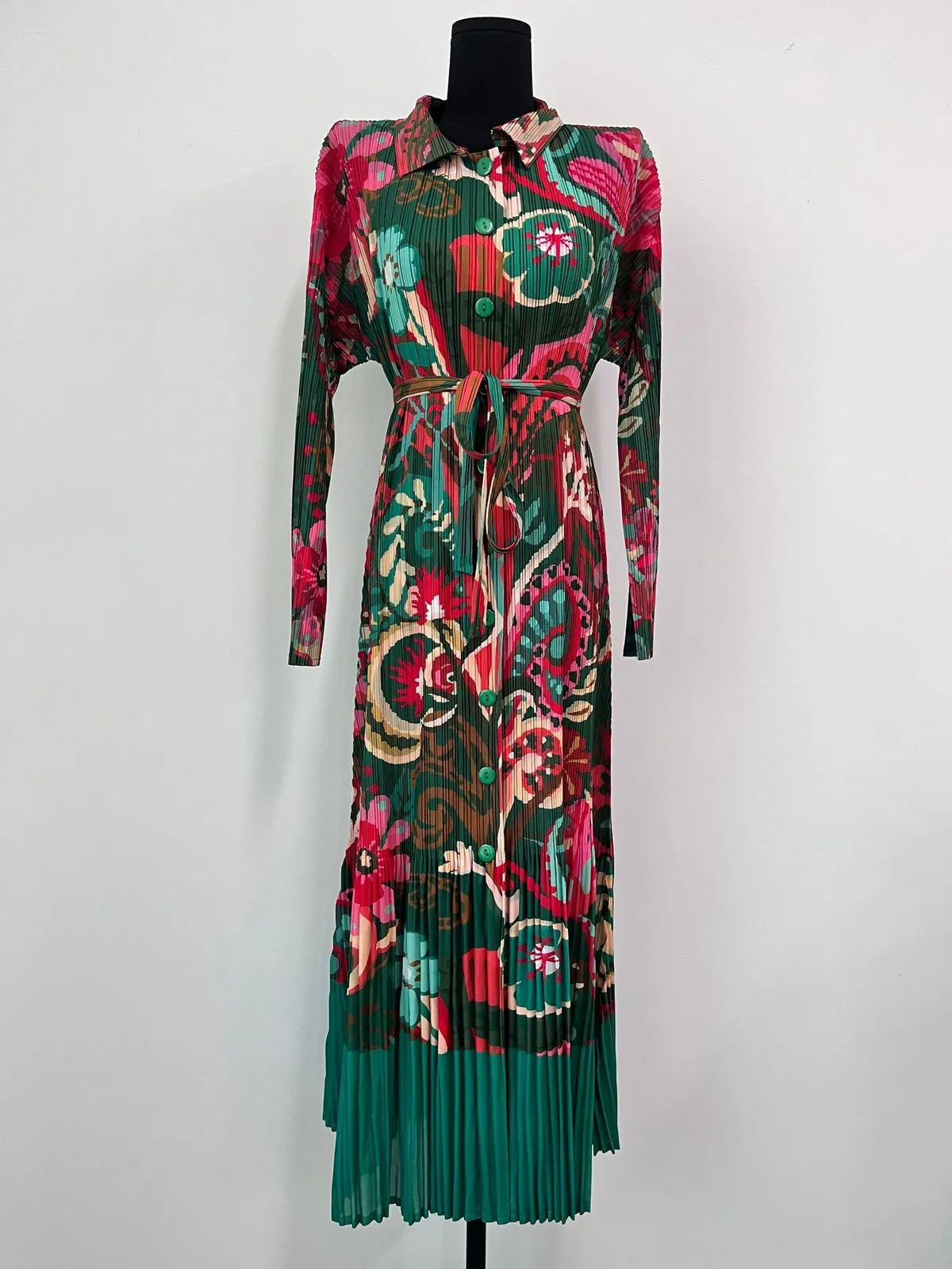 衣都精品- 2023新款大碼印花氣質顯瘦長款褶皺連衣裙