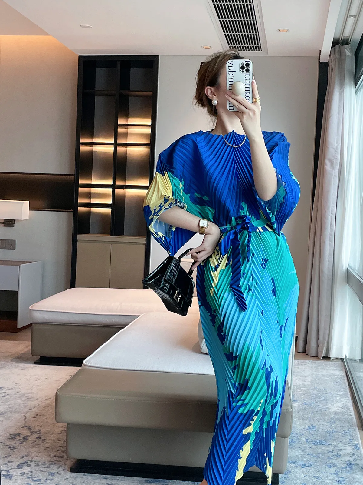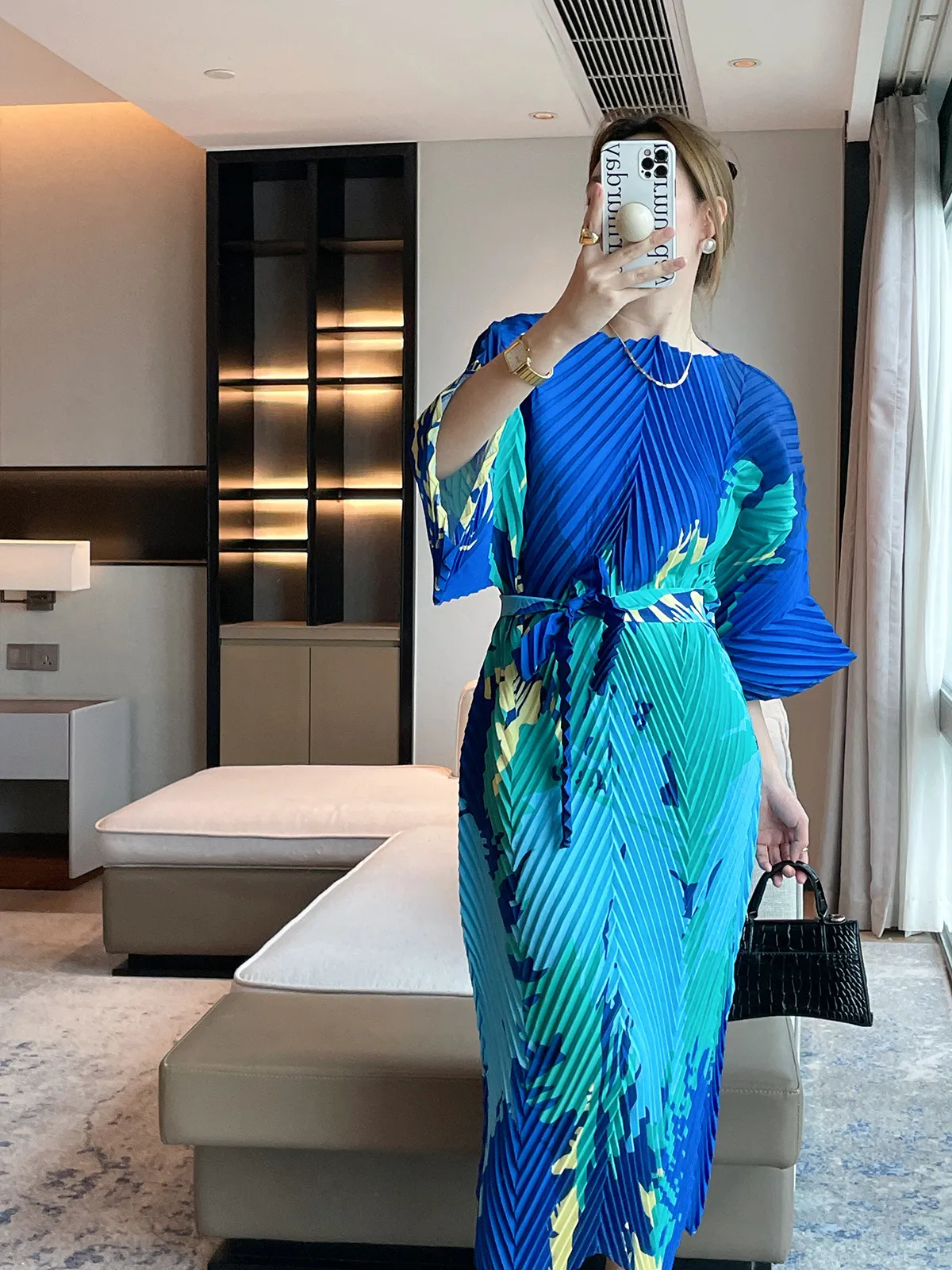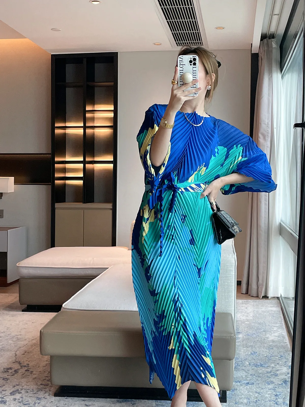衣都精品- 2023新款高級印花洋裝繫帶收腰褶皺連衣裙