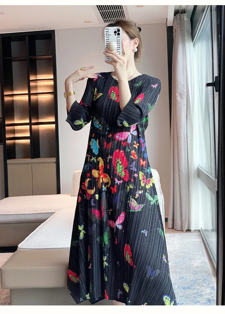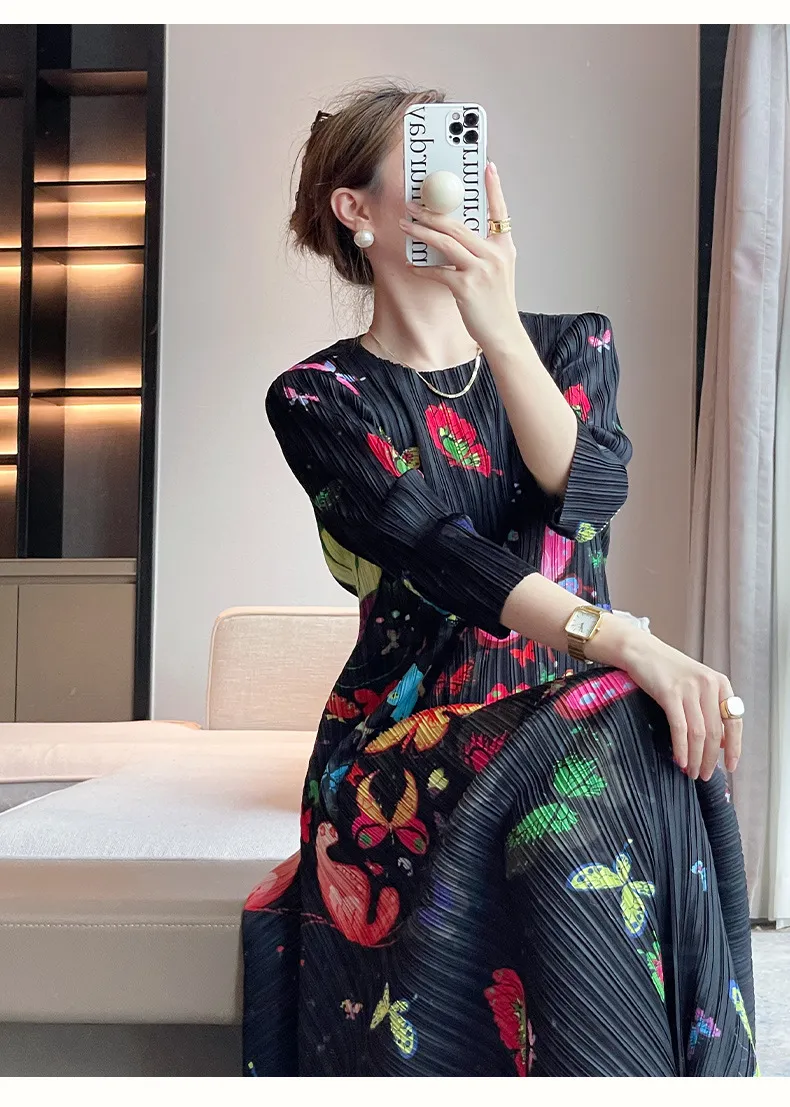 衣都精品- 2023新款法式氣質遮肉印花收腰褶皺連衣裙