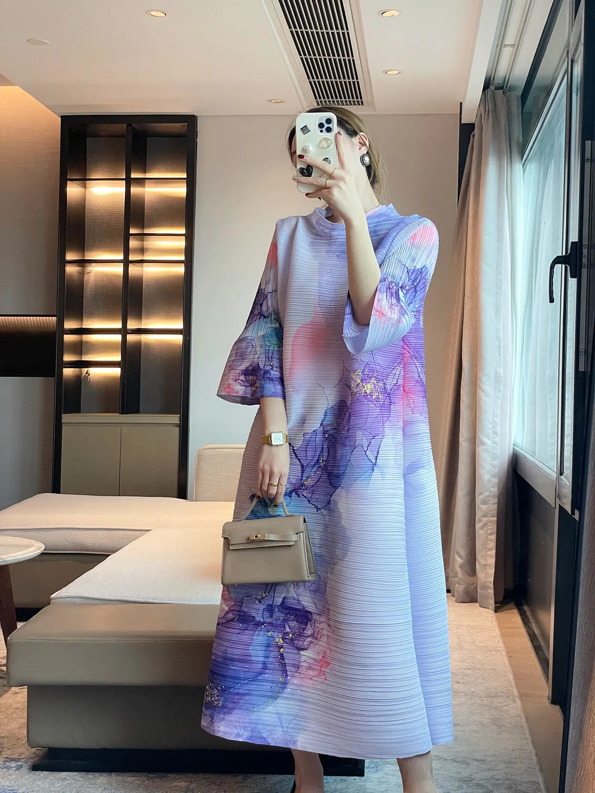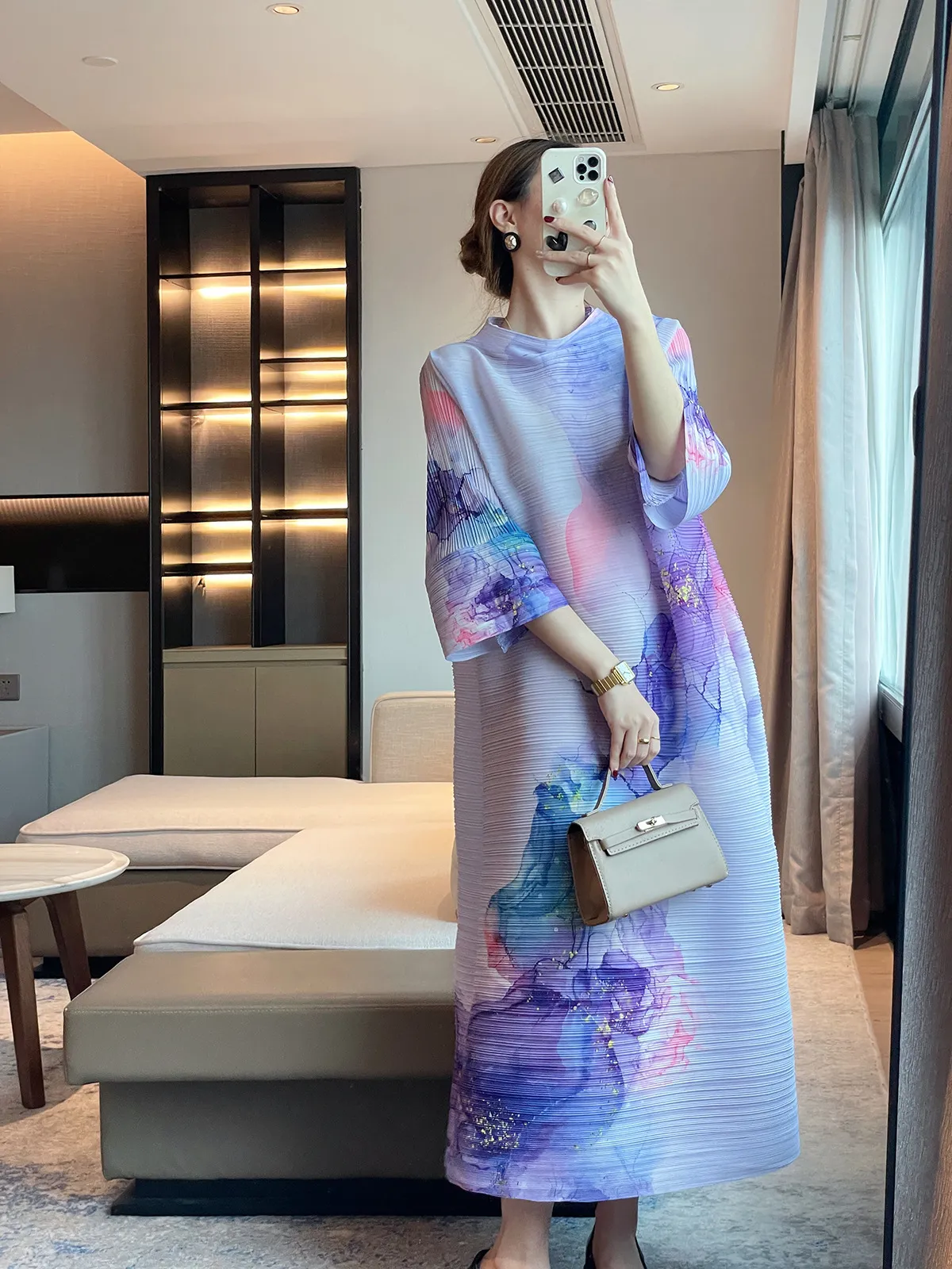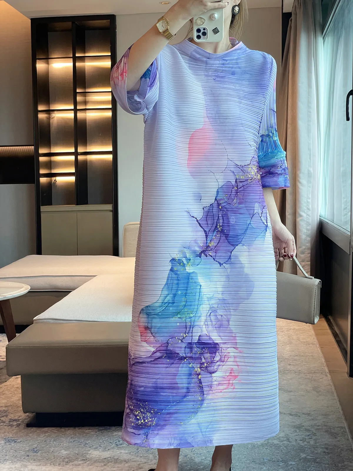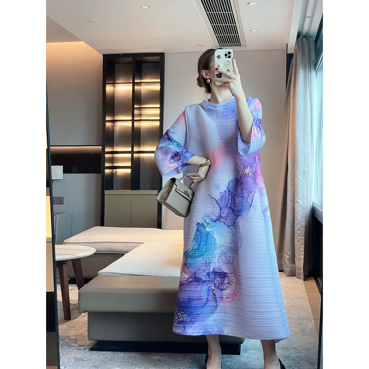 衣都精品- 2023新款長版寬鬆遮肉印花褶皺連衣裙