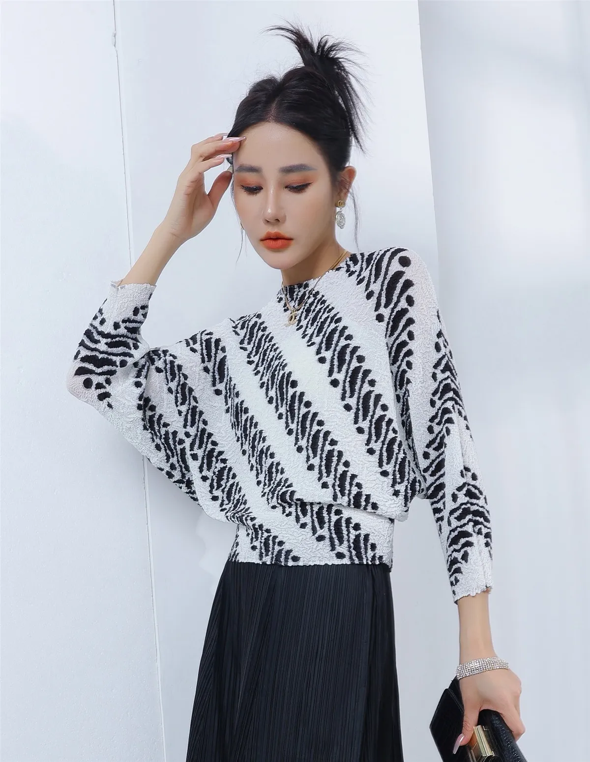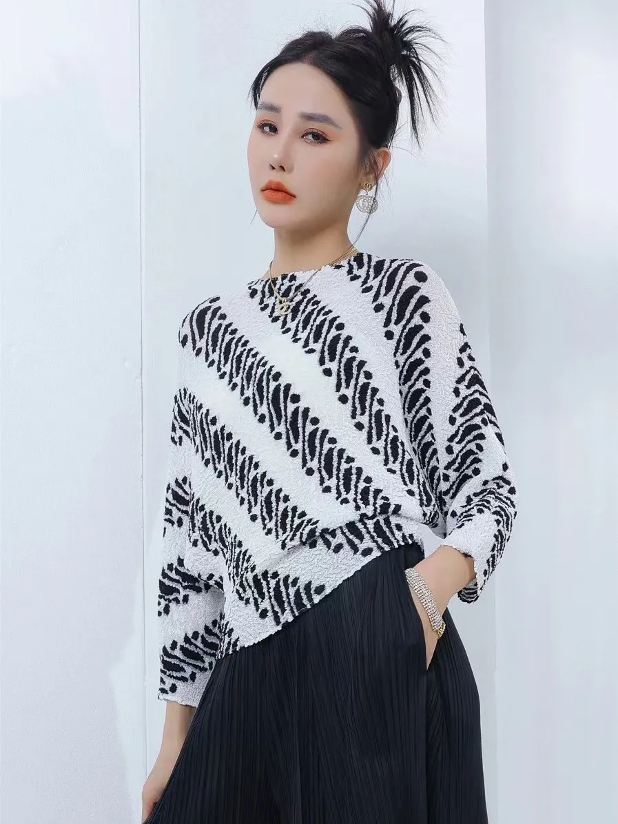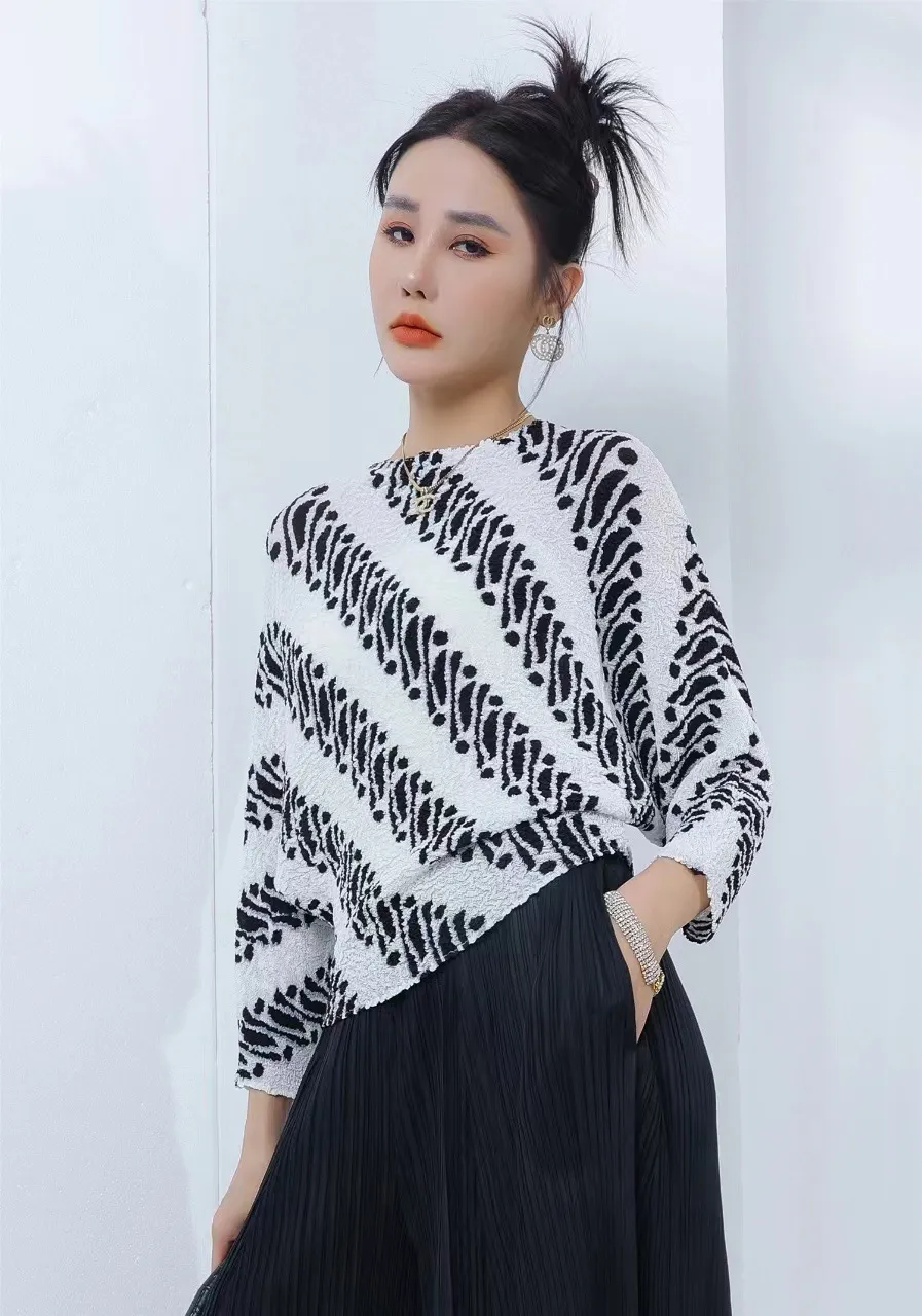 衣都精品- 2023新款韓版樹葉條紋印花圓領褶皺上衣