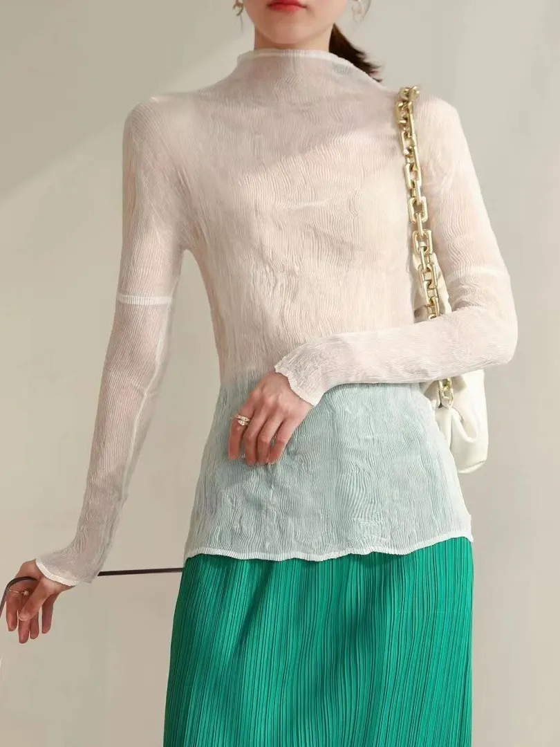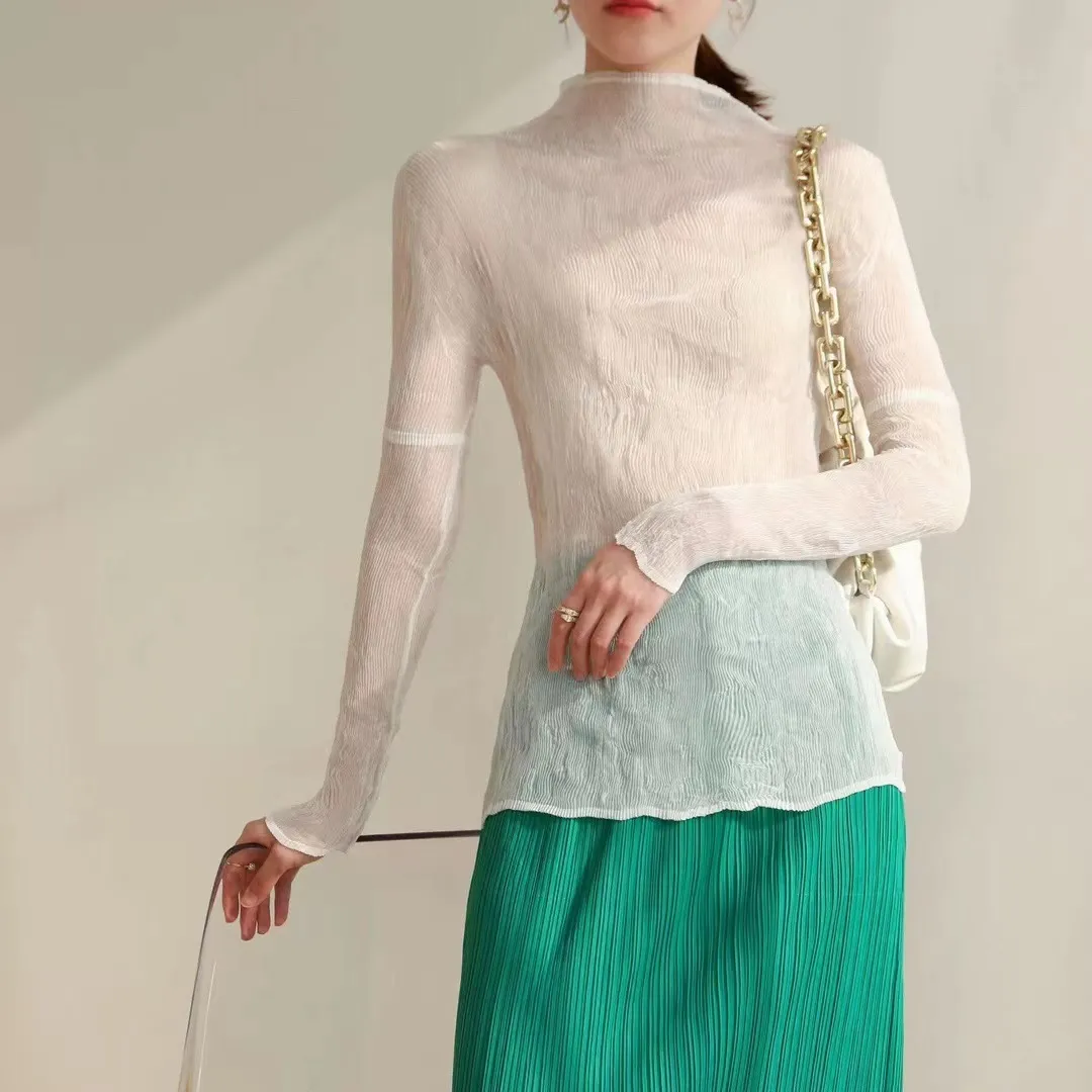 衣都精品- 2023新款修身蕾絲圓領透明網紗褶皺打底衫