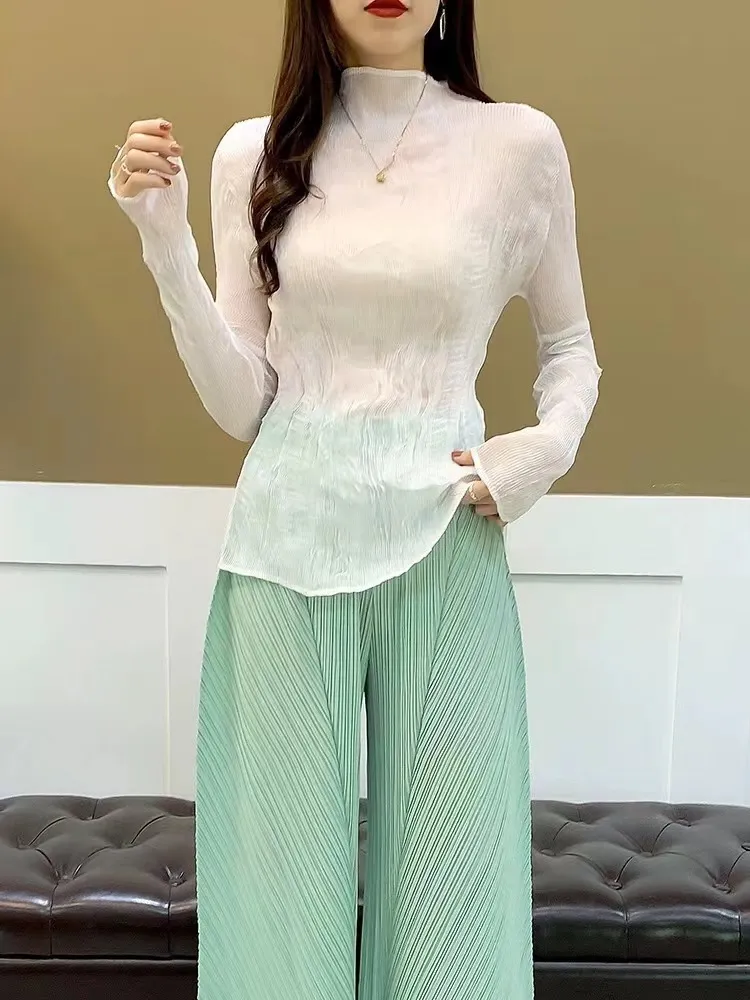 衣都精品- 2023新款簡約圓領拼色休閒褶皺壓花上衣