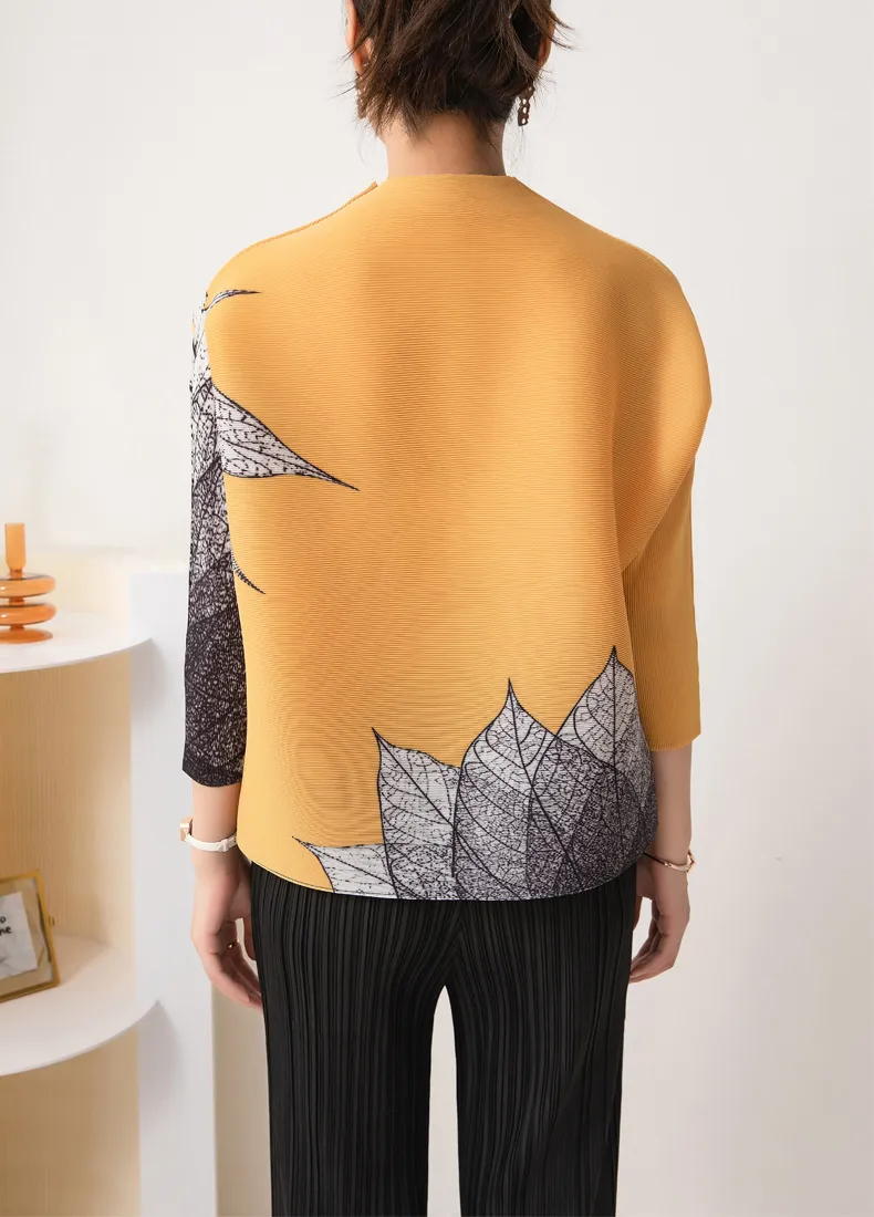 衣都精品- 2023新款韓版樹葉條紋印花圓領褶皺上衣