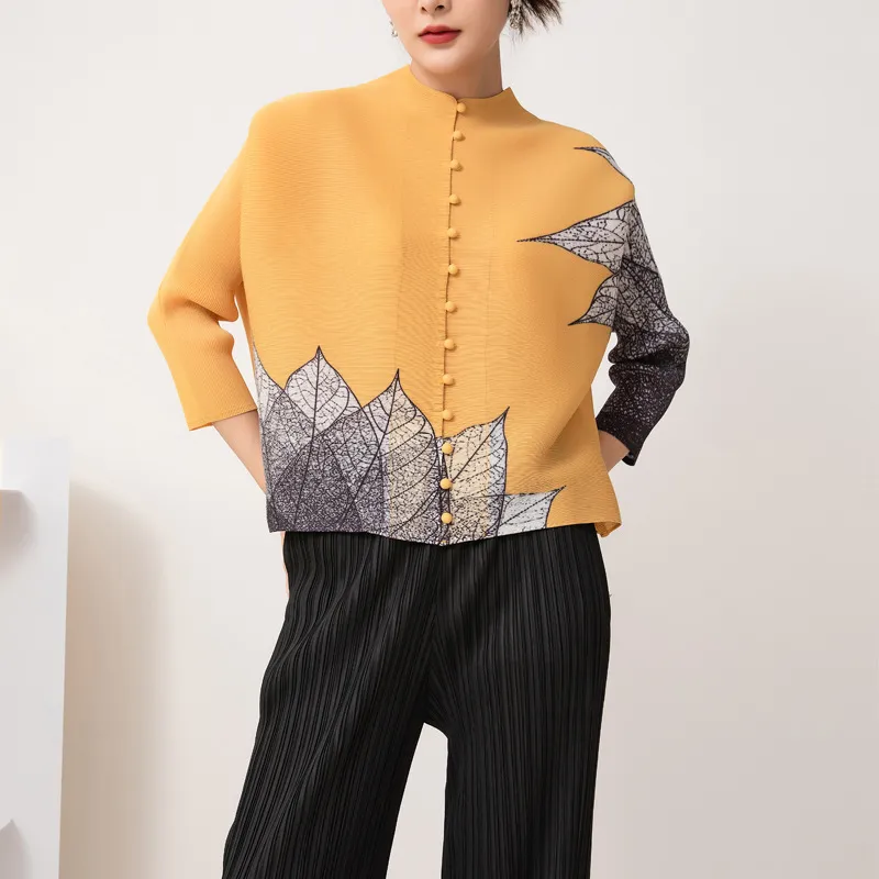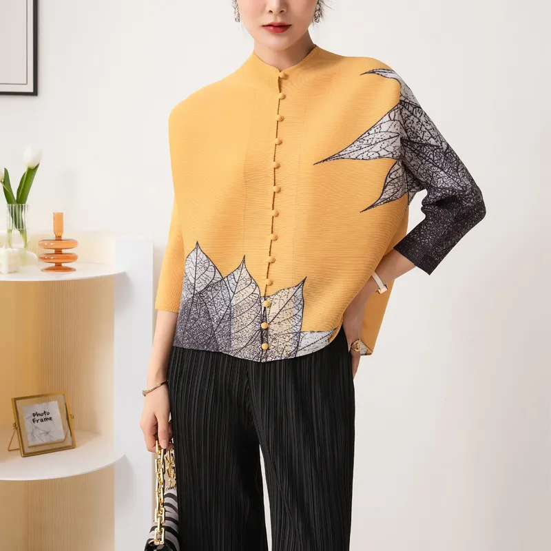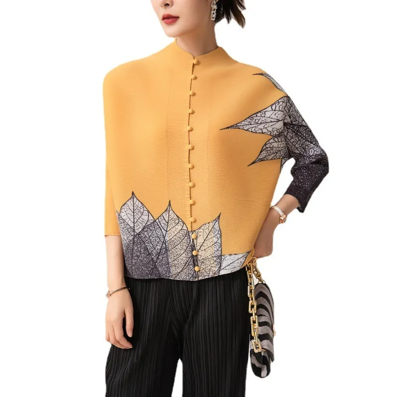 衣都精品- 2023新款時尚印花寬鬆13粒單排扣開襟褶皺外套