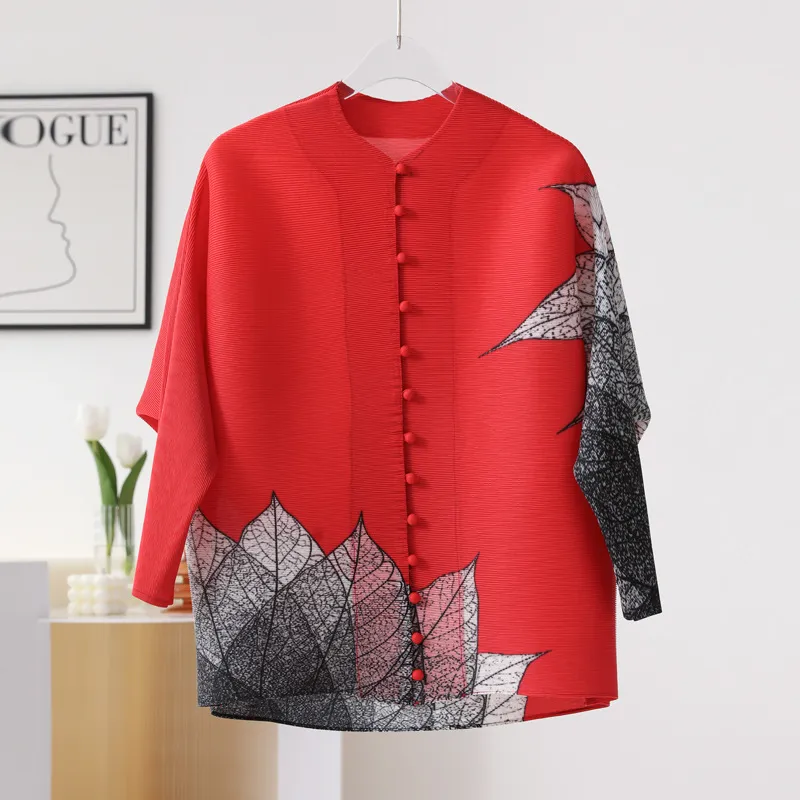 衣都精品- 2023新款時尚印花寬鬆13粒單排扣開襟褶皺外套
