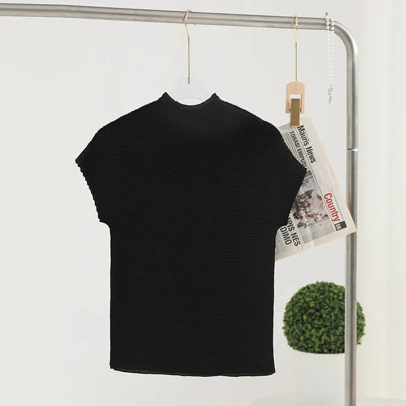 衣都精品- 2023新款半高領豆腐褶彈性短袖褶皺上衣