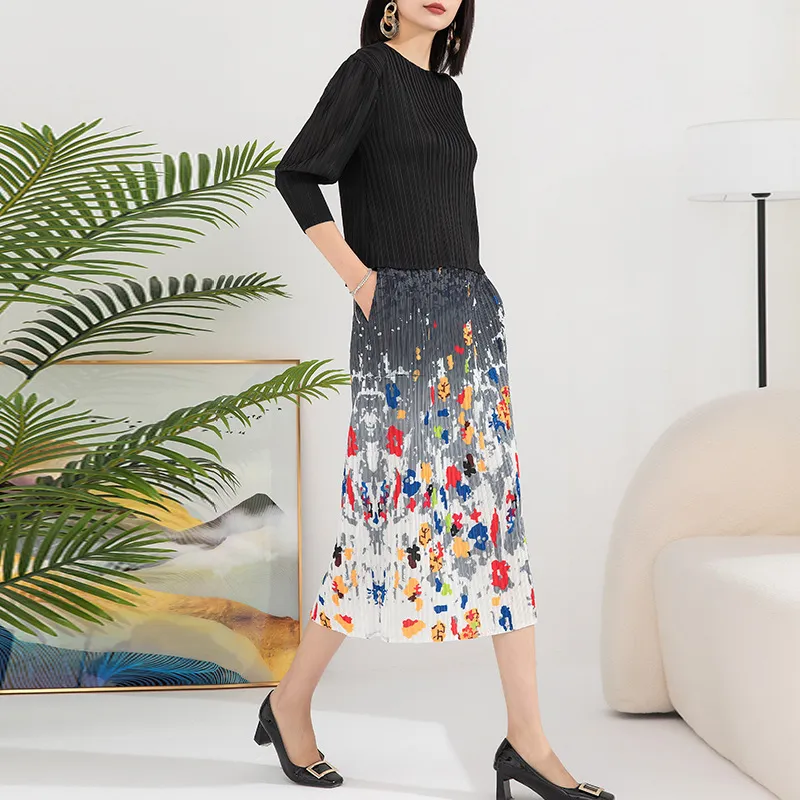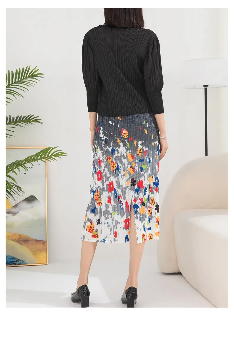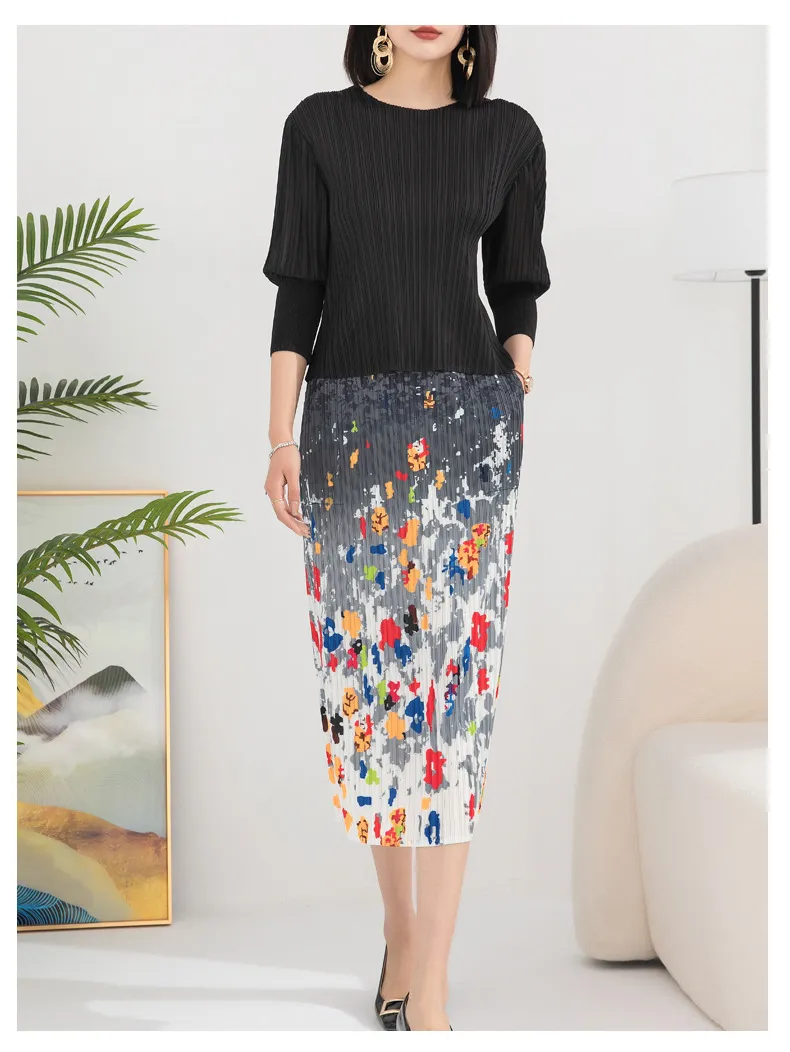 衣都精品- 2023新款圓領純色上衣+鬆緊腰印花開叉半身裙兩件式褶皺套裝