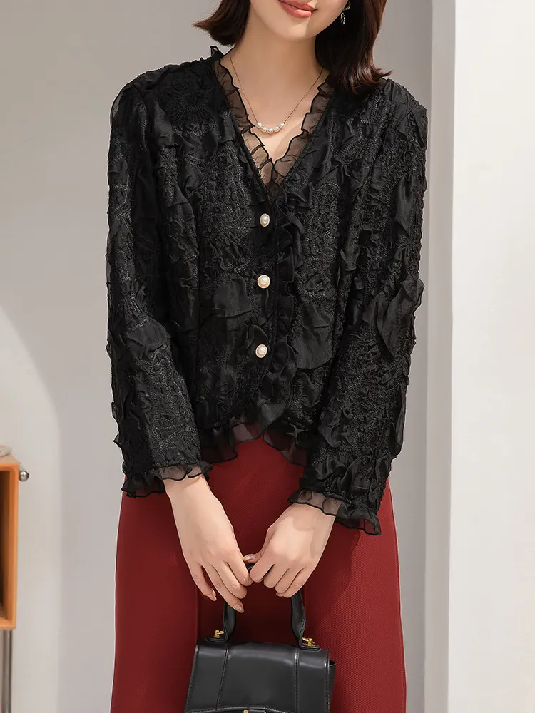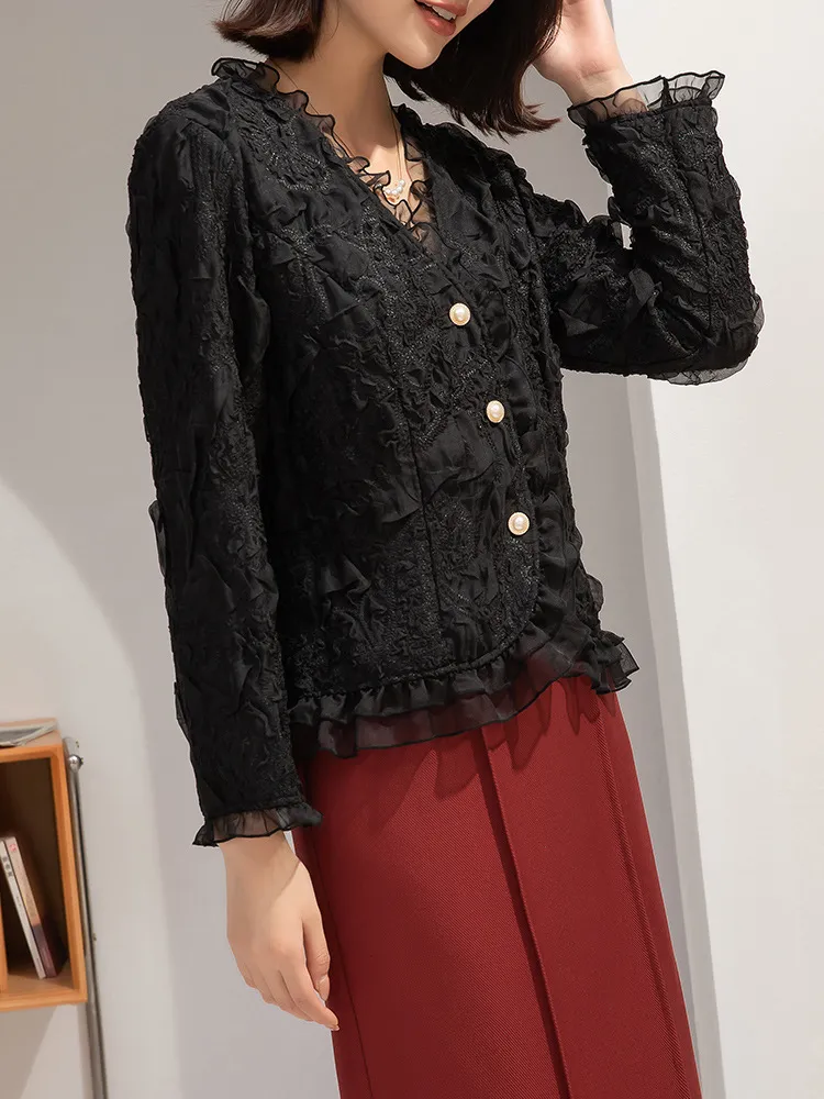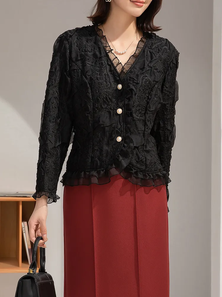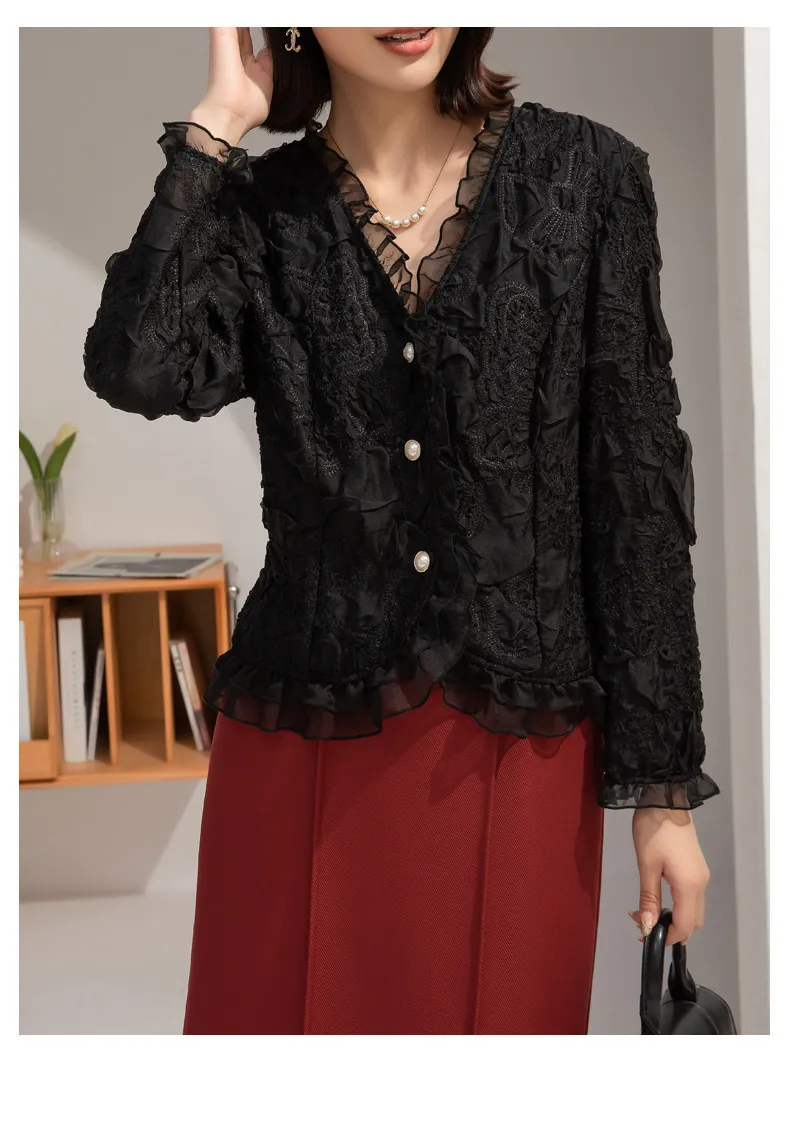 衣都精品- 2023新款時尚小眾刺繡無領單排扣褶皺外套