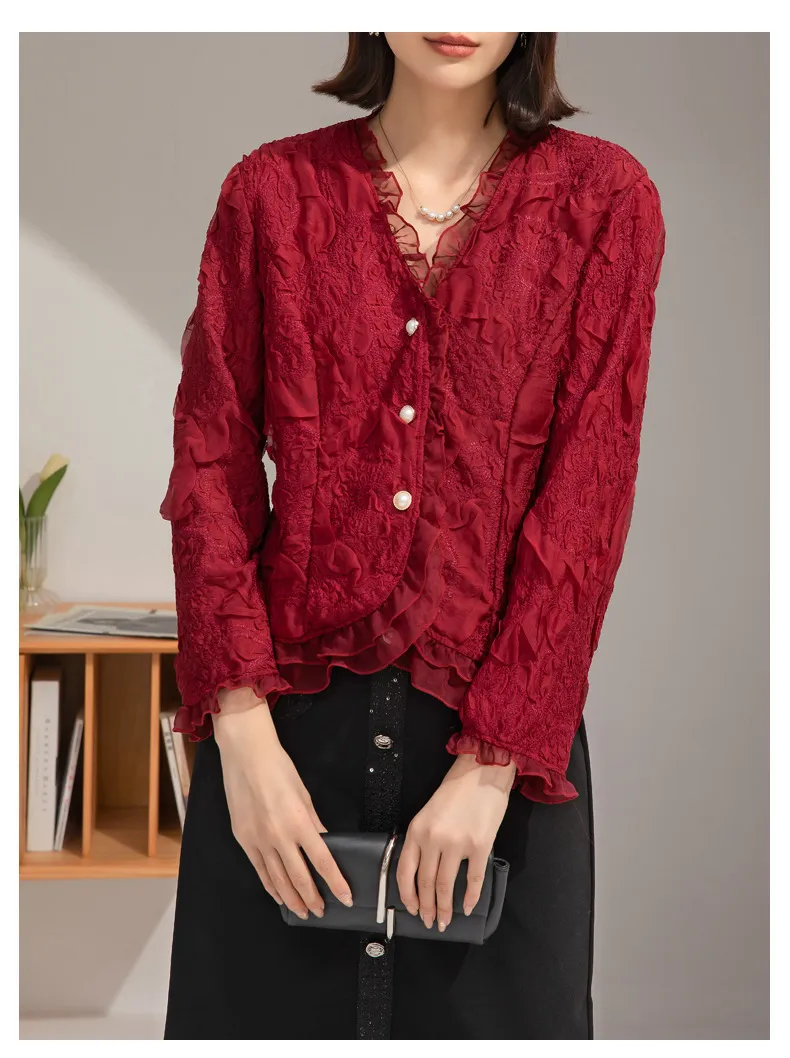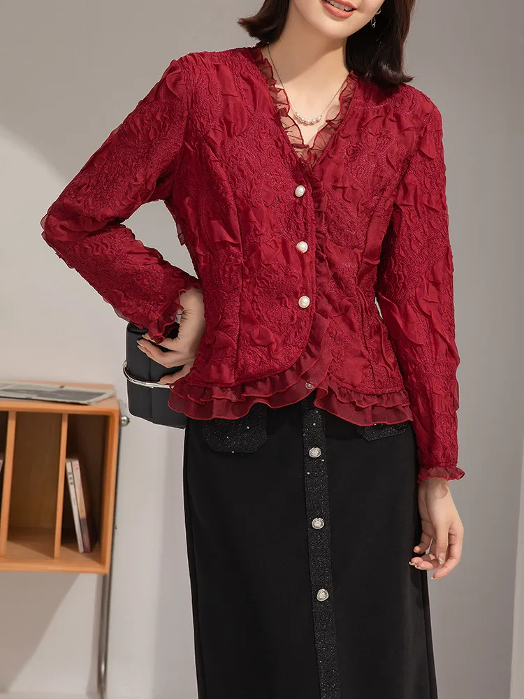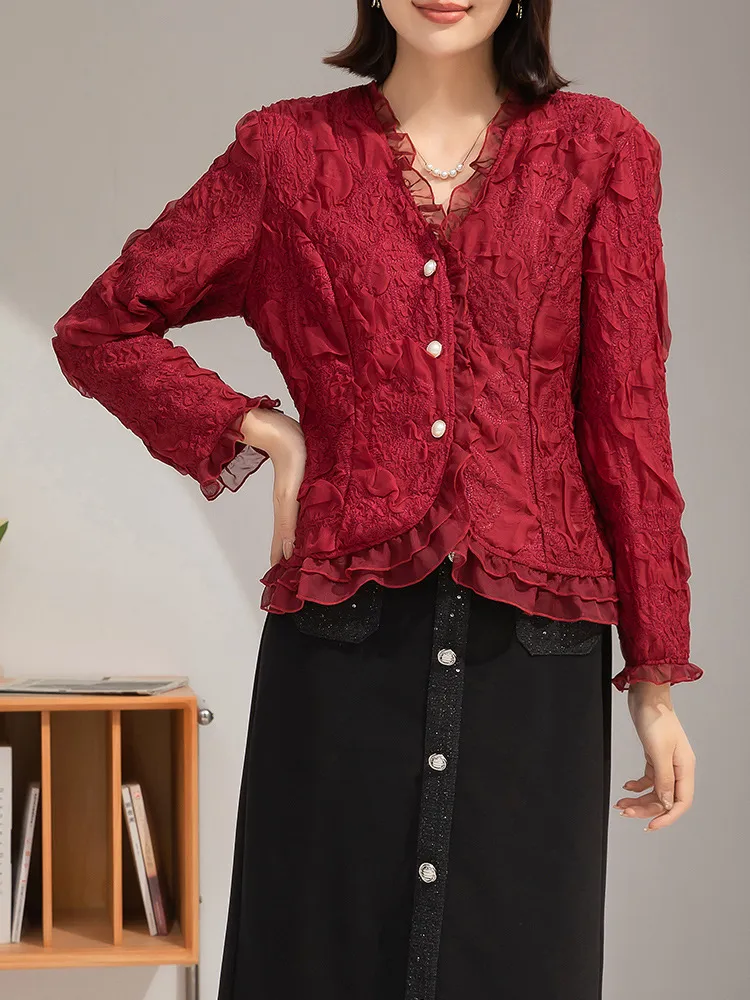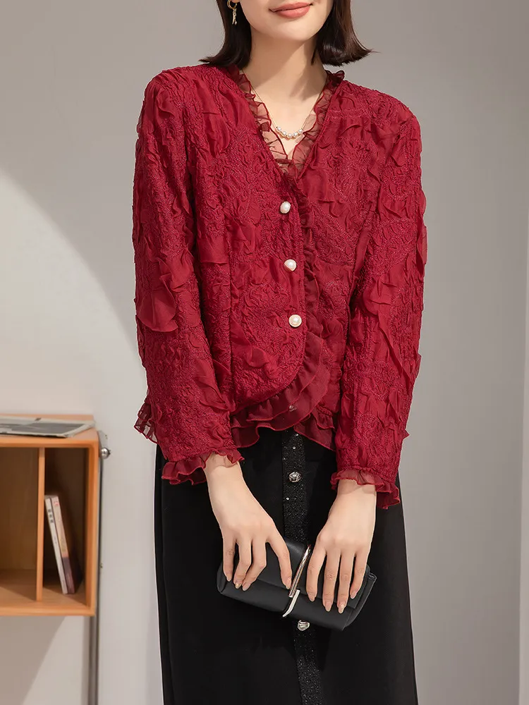 衣都精品- 2023新款時尚小眾刺繡無領單排扣褶皺外套