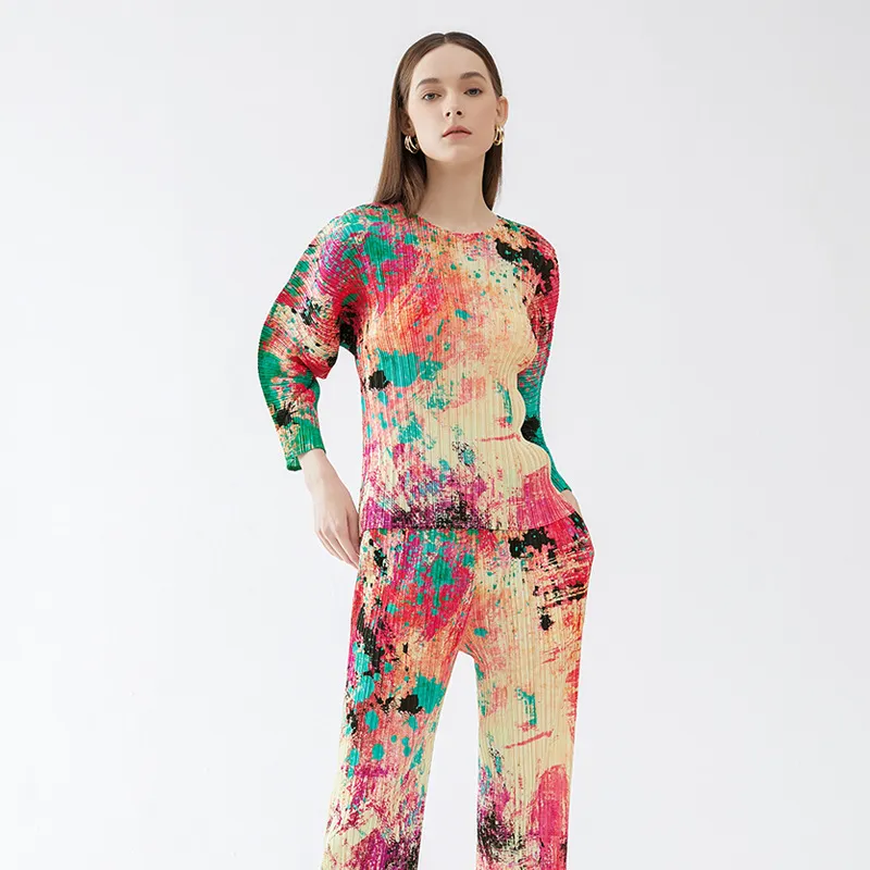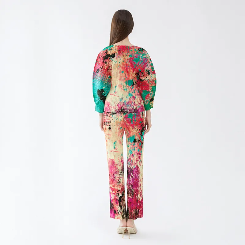 衣都精品- 2023新款時尚修身手繪印花褶皺休閒褲
