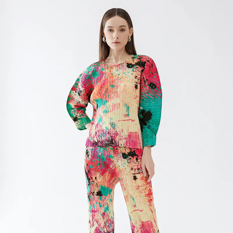 衣都精品- 2023新款時尚修身手繪印花褶皺上衣