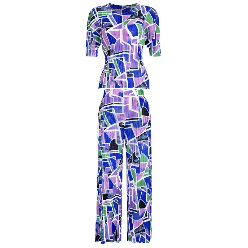 衣都精品- 2023新款圓領短袖寬鬆印染休閒上衣+長褲兩件式褶皺套裝