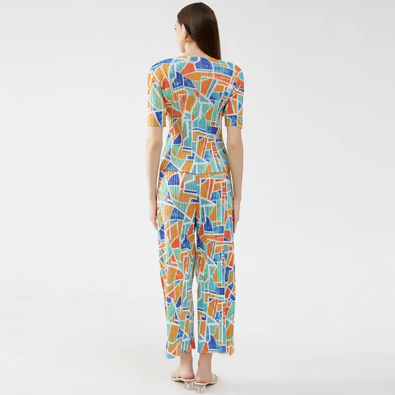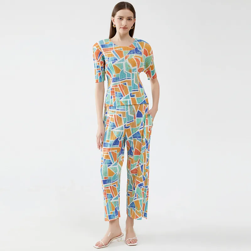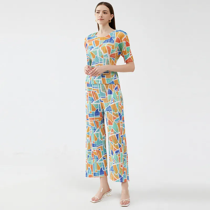 衣都精品- 2023新款圓領短袖寬鬆印染休閒上衣+長褲兩件式褶皺套裝