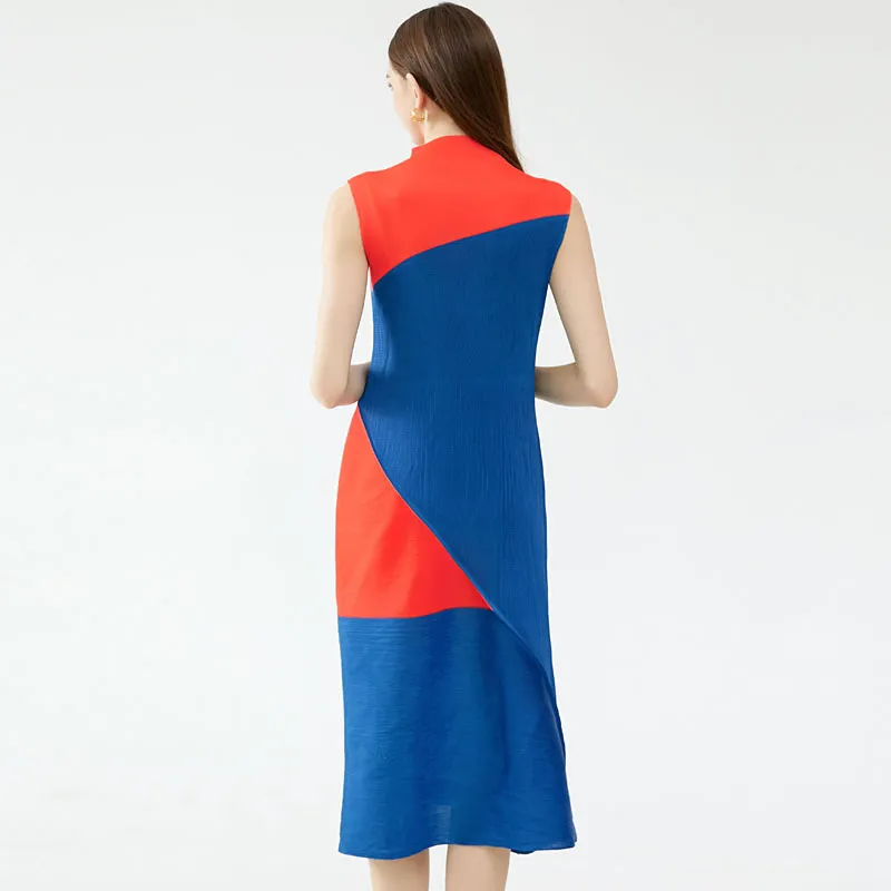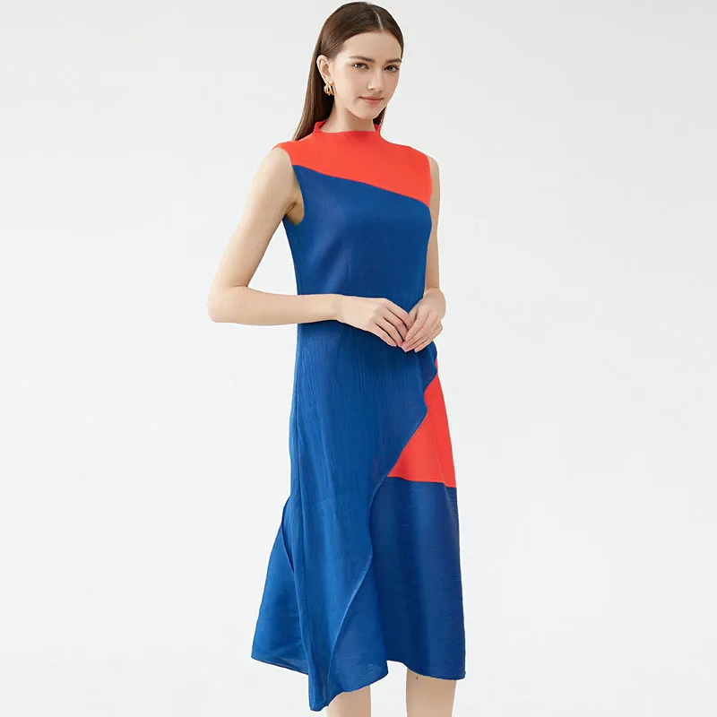 衣都精品- 2023新款撞色半高領小眾設計拼接褶皺連衣裙