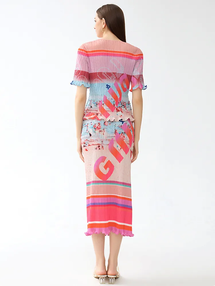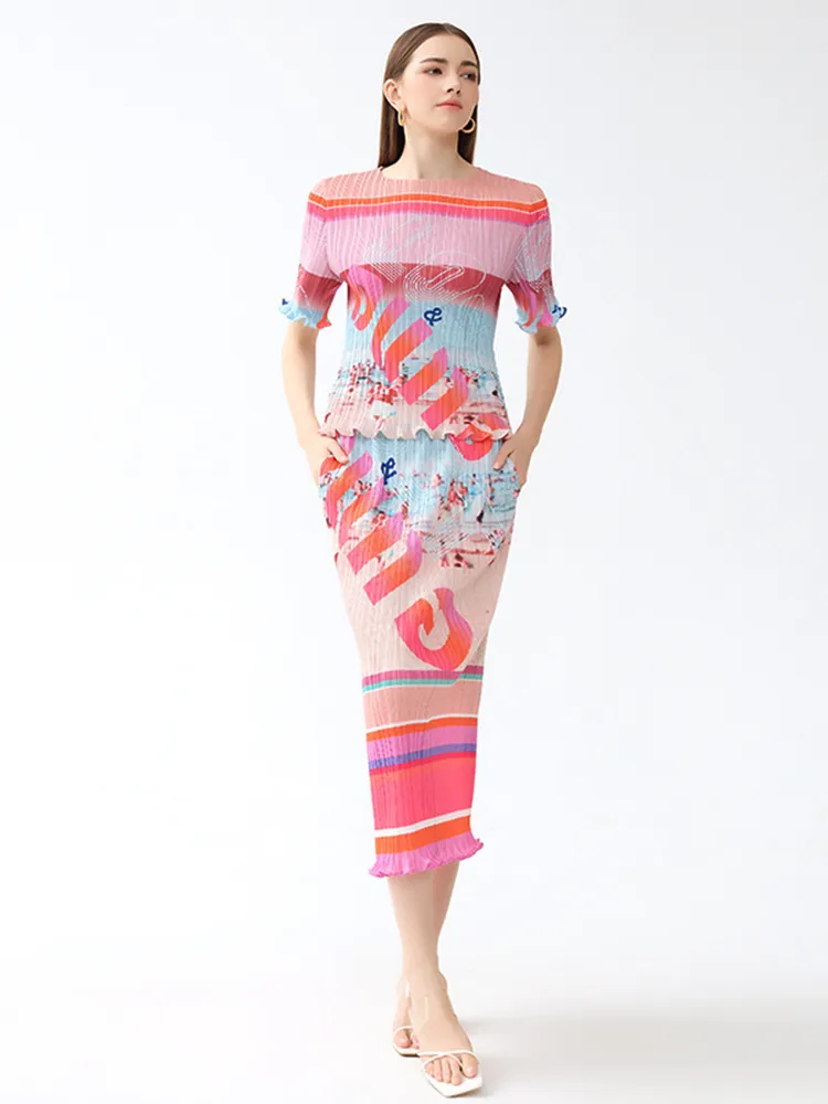 衣都精品- 2023新款收腰顯瘦時尚休閒風印花褶皺半身裙
