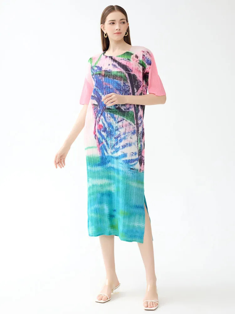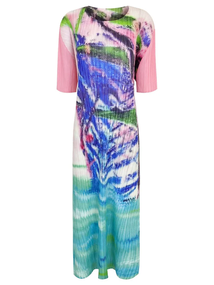 衣都精品- 2023新款顯瘦圓領中袖小眾休閒風褶皺連衣裙