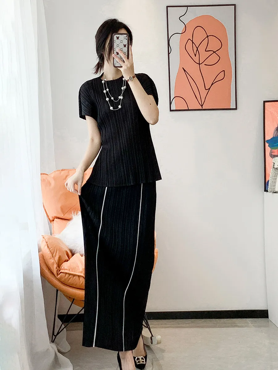 衣都精品- 2023新款時尚休閒條紋百褶褶皺半身裙