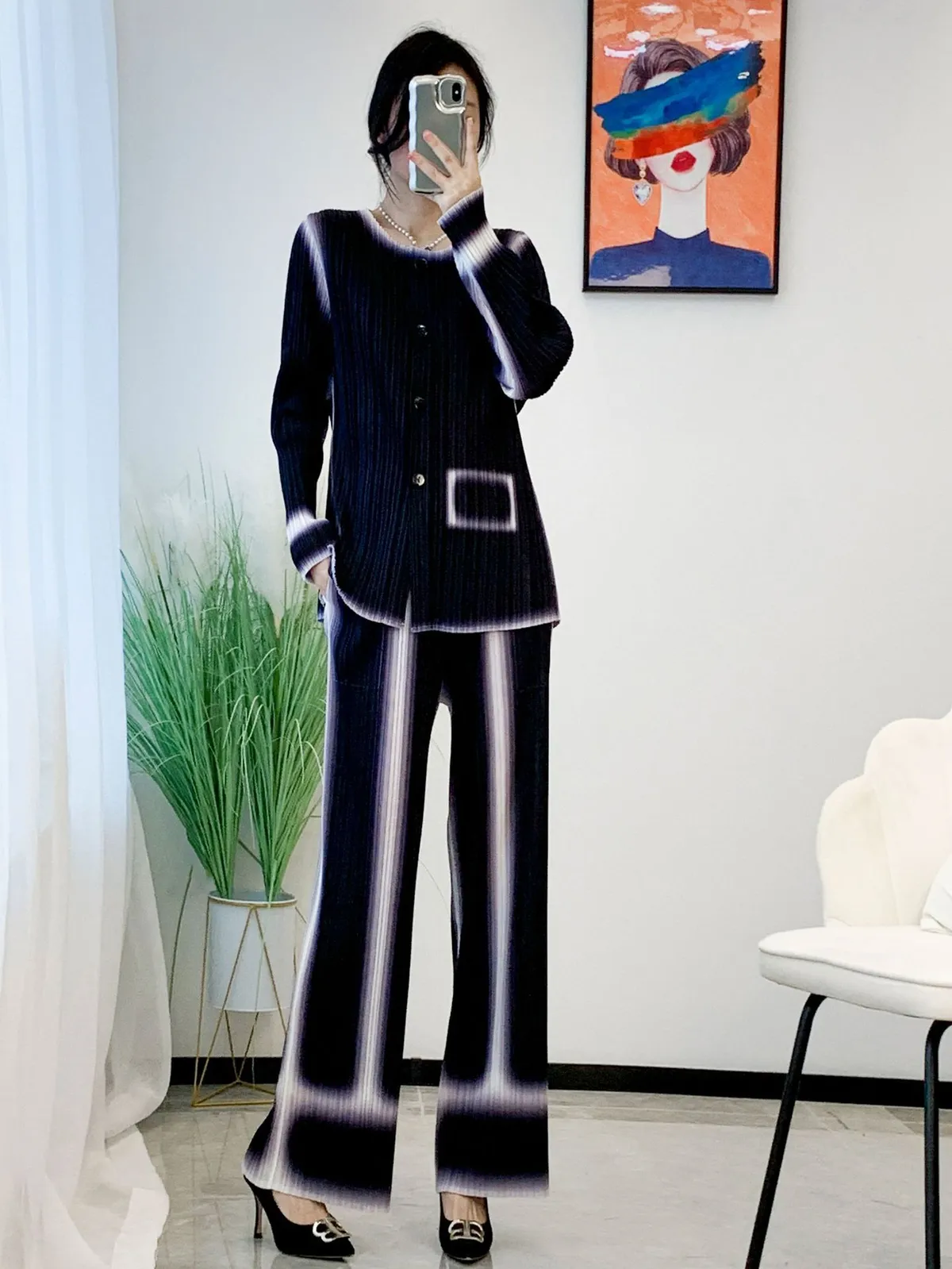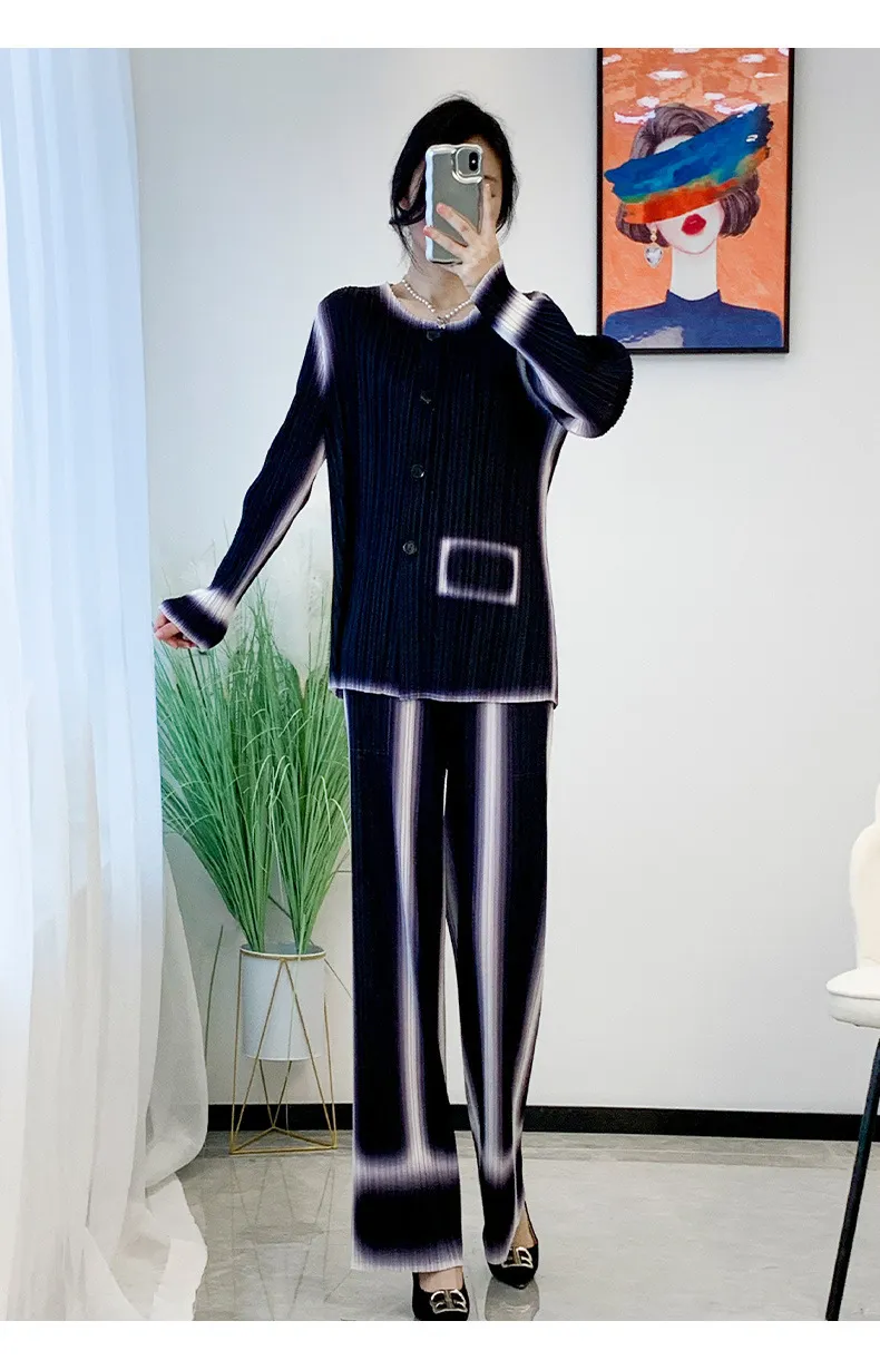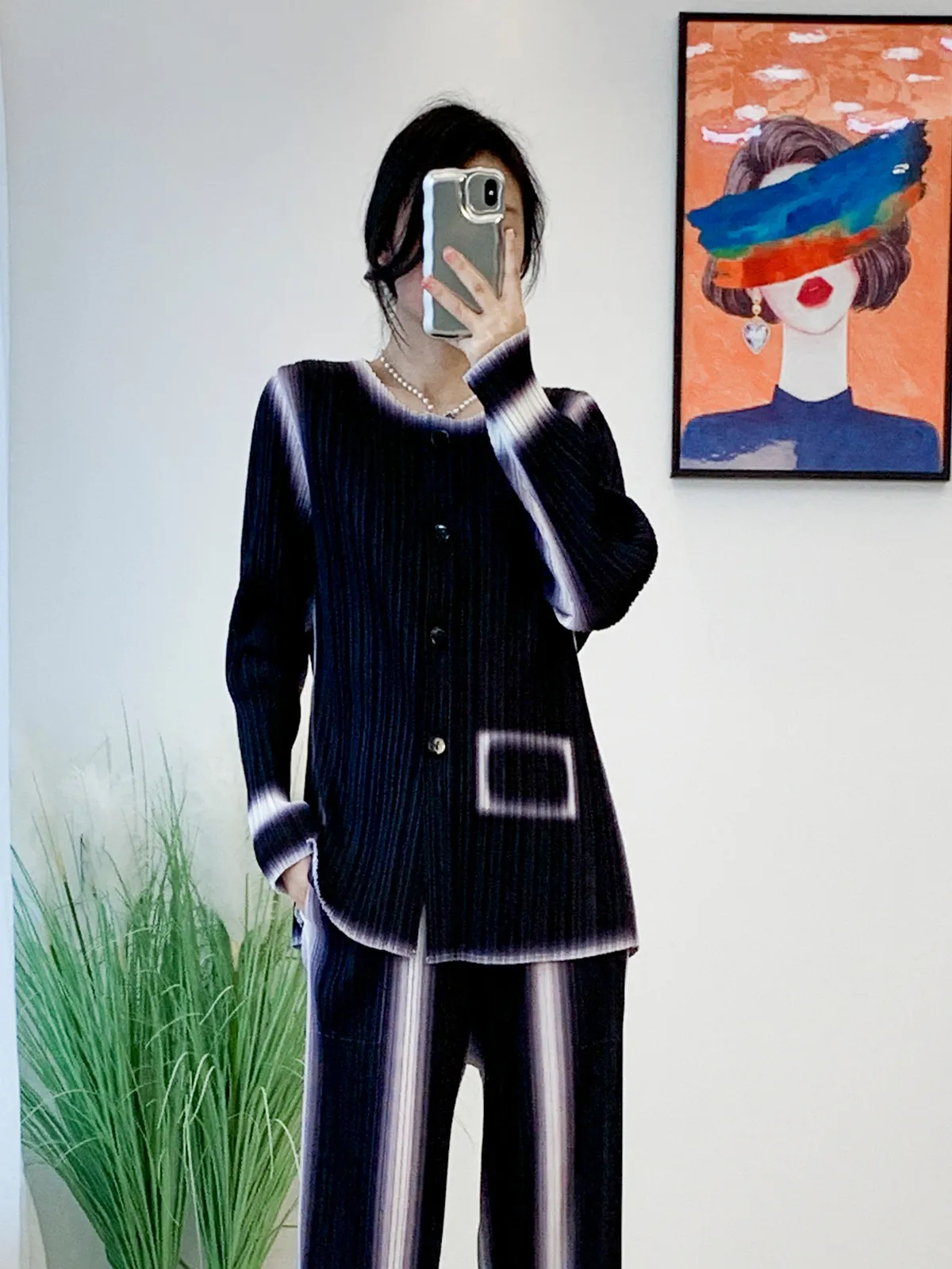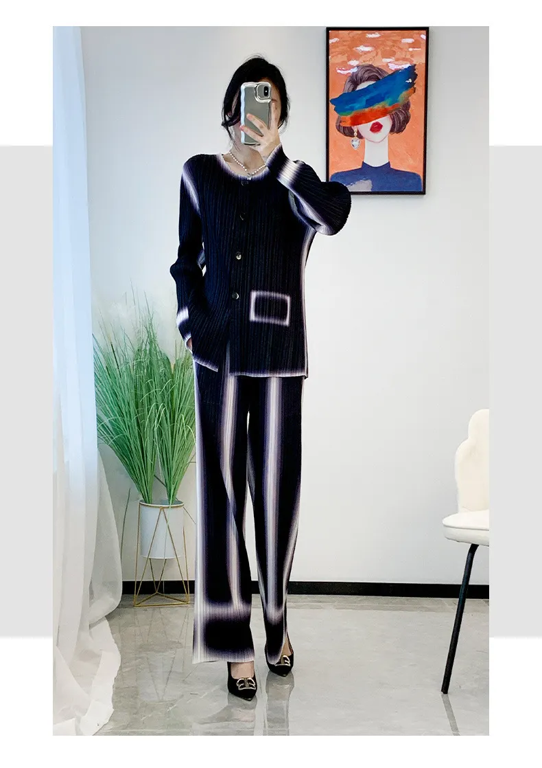 衣都精品- 2023新款時尚條紋印花修身開襟褶皺連衣裙