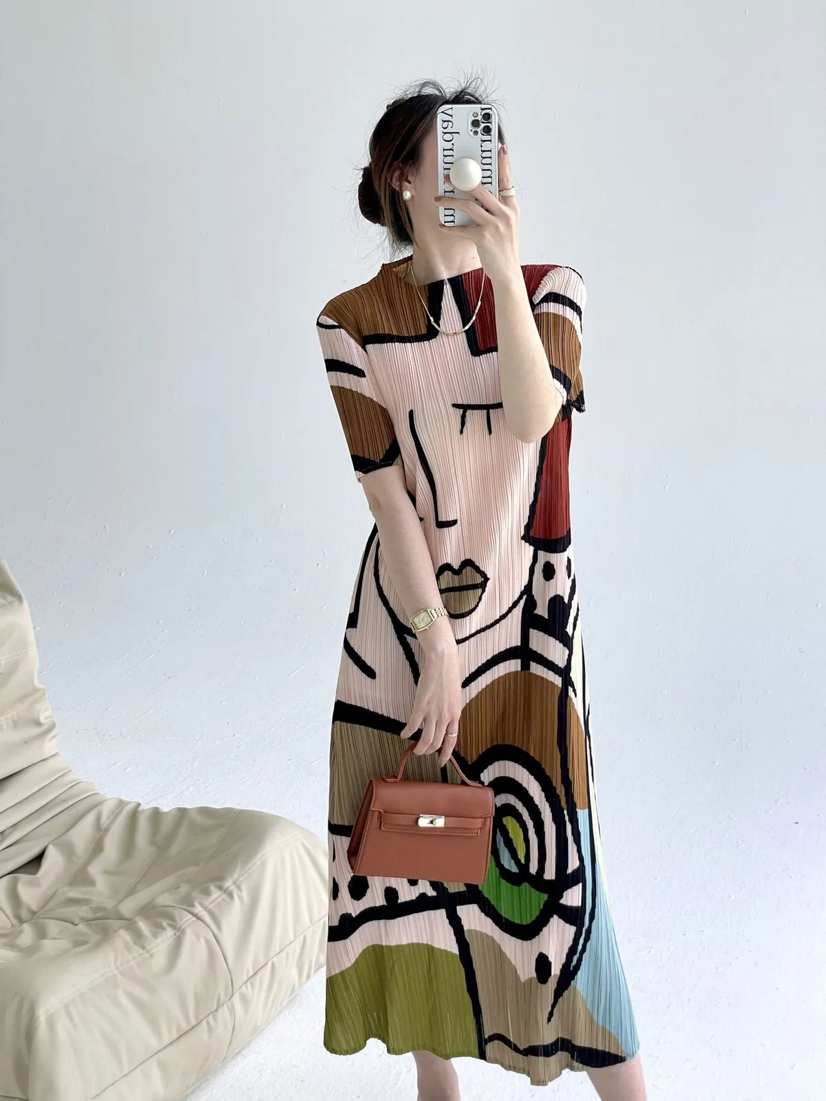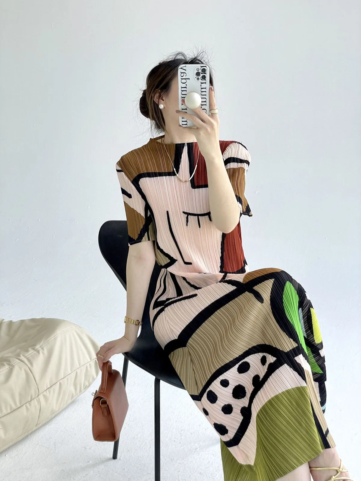 衣都精品- 2023新款卡通印花短袖氣質修身褶皺連衣裙