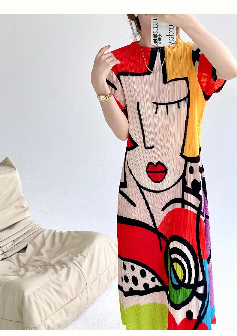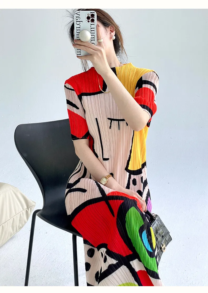 衣都精品- 2023新款卡通印花短袖氣質修身褶皺連衣裙