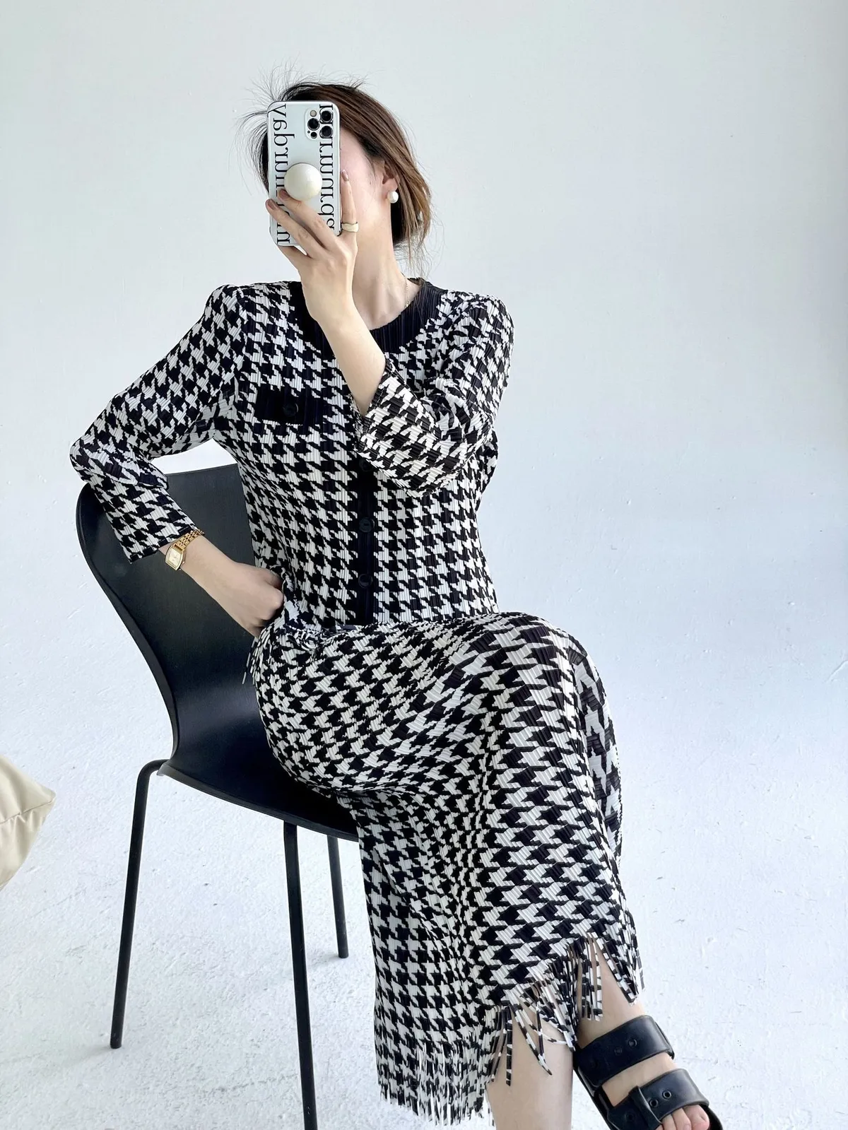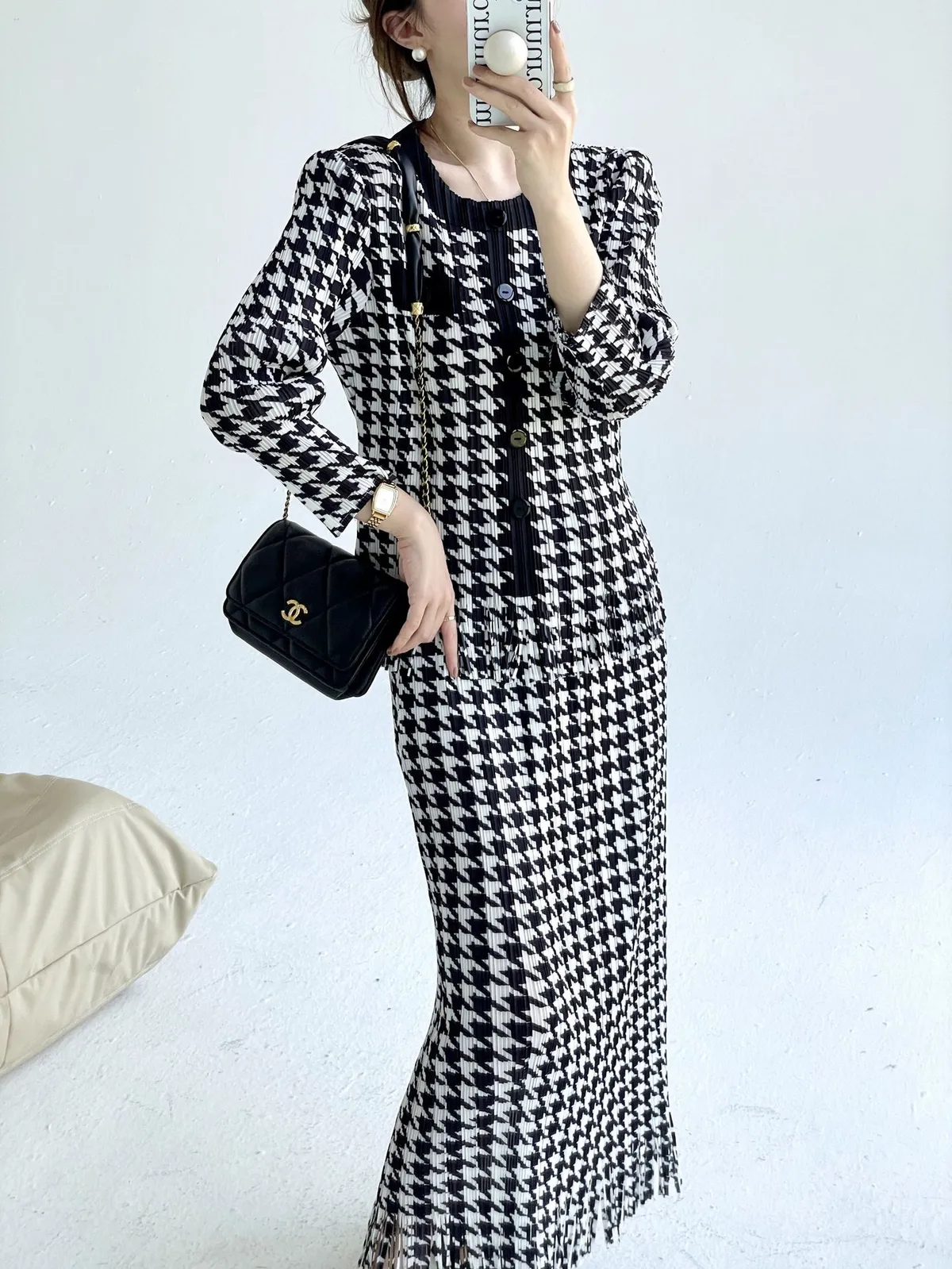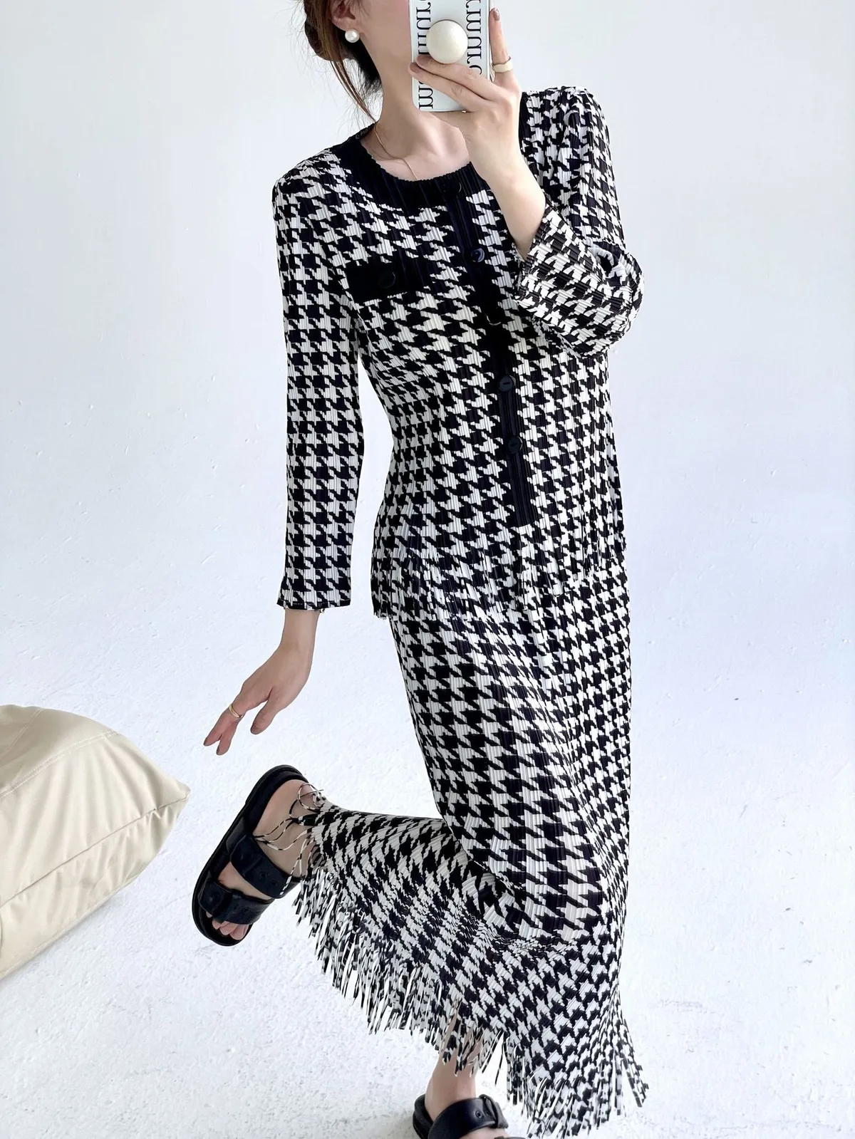 衣都精品- 2023新款千鳥格印花流蘇時尚上衣+半身裙兩件式褶皺套裝