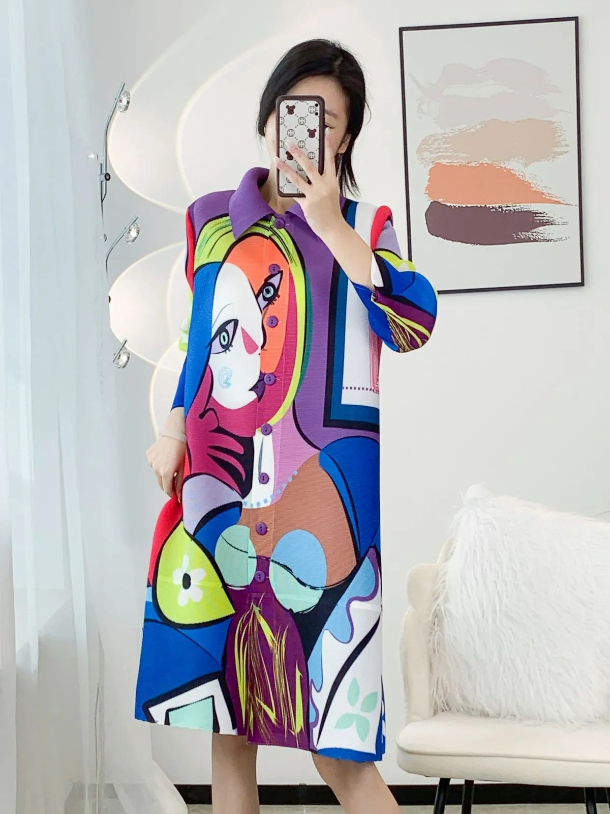 衣都精品- 2023新款時尚印花翻領開襟褶皺連衣裙